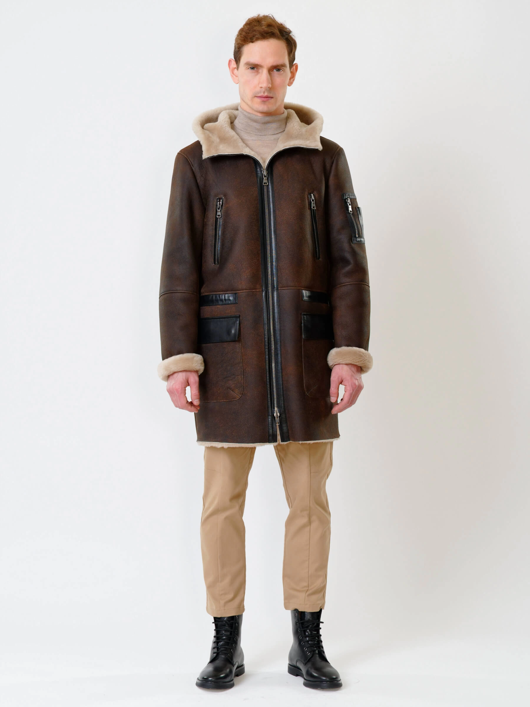 Товар длинная мужская дубленка с капюшоном премиум класса 429, коричневая, размер 50, артикул 70651 выполнен из овчина "мерино" с застежкой молния. Рассчитан на сезон: осень-зима. Длина изделия 92 см, силуэт прямой.