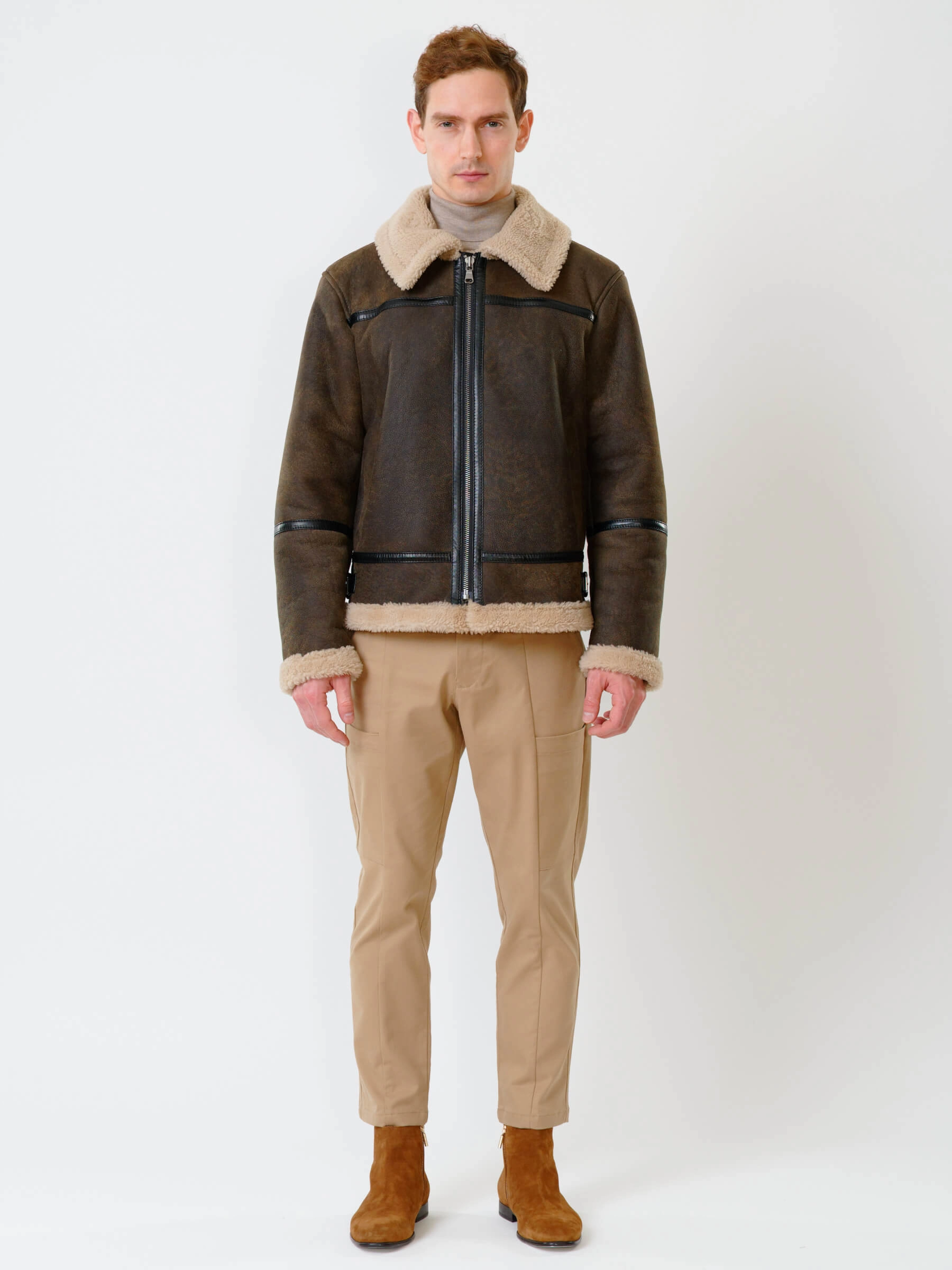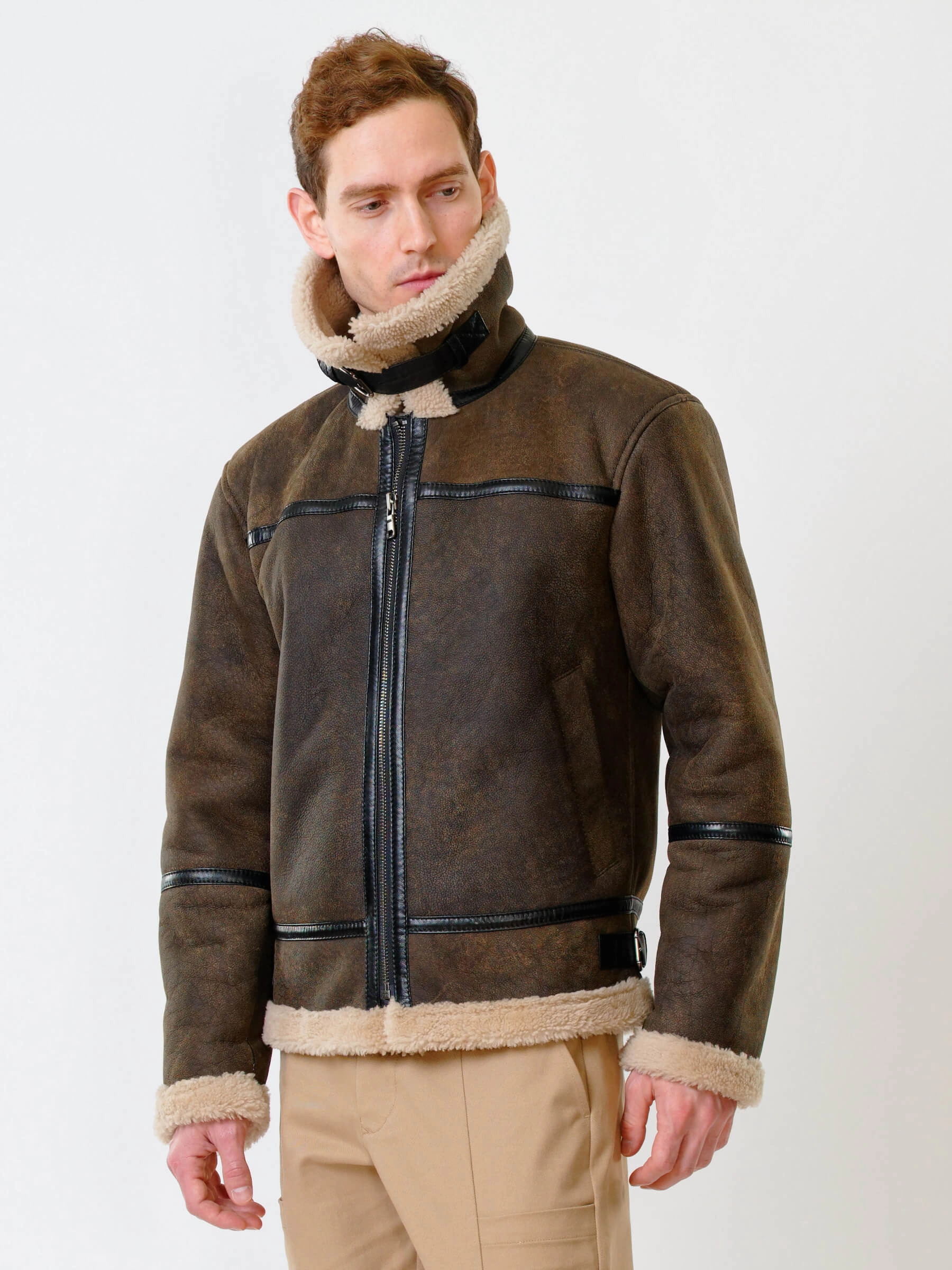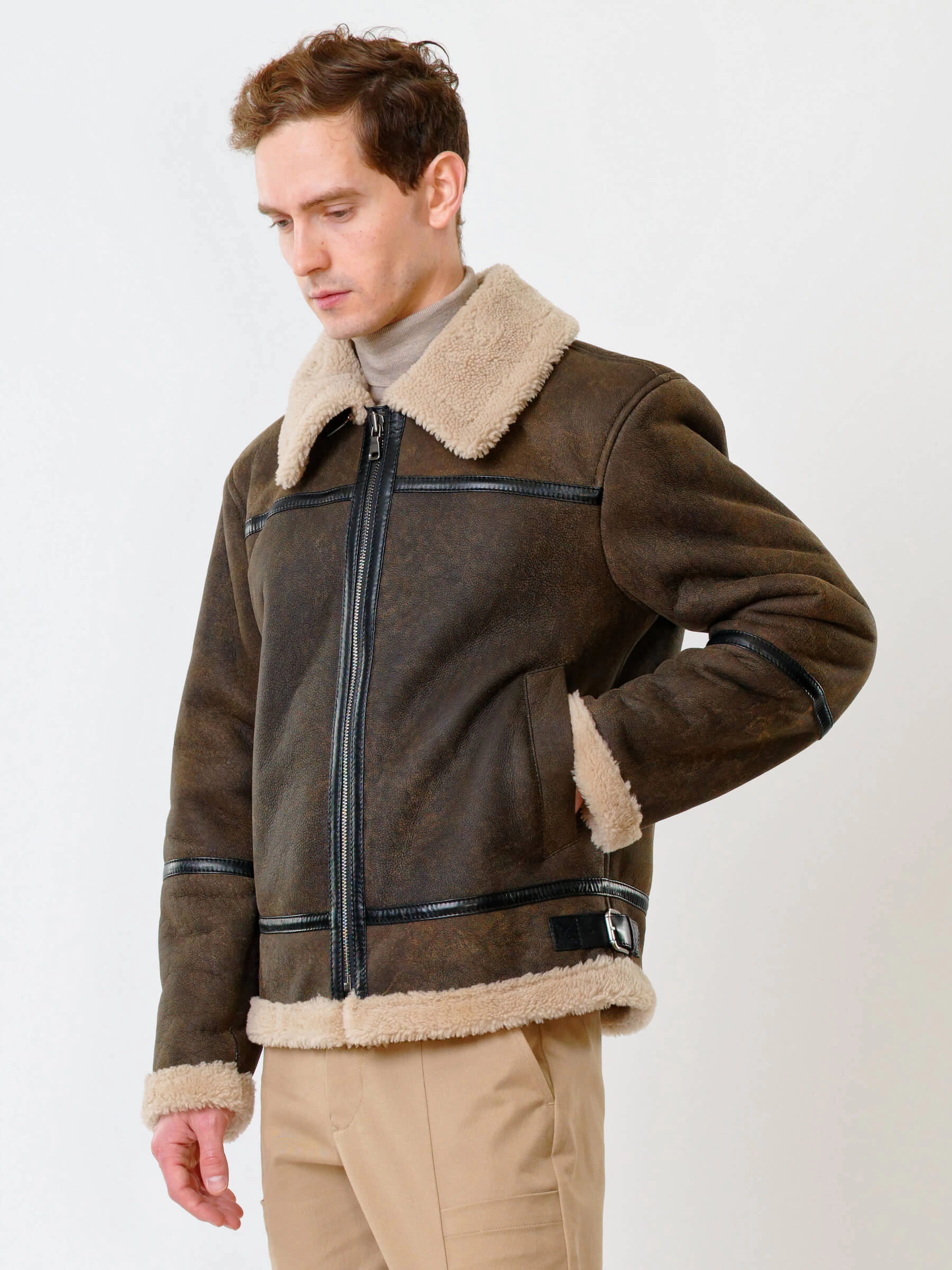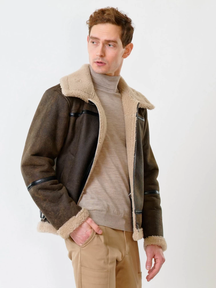 Товар короткая мужская дубленка пилот из овчины керли премиум класса 430, коричневая, размер 48, артикул 70350 выполнен из овчина "мерино" с застежкой молния. Рассчитан на сезон: осень-зима. Длина изделия 70 см, силуэт прямой.