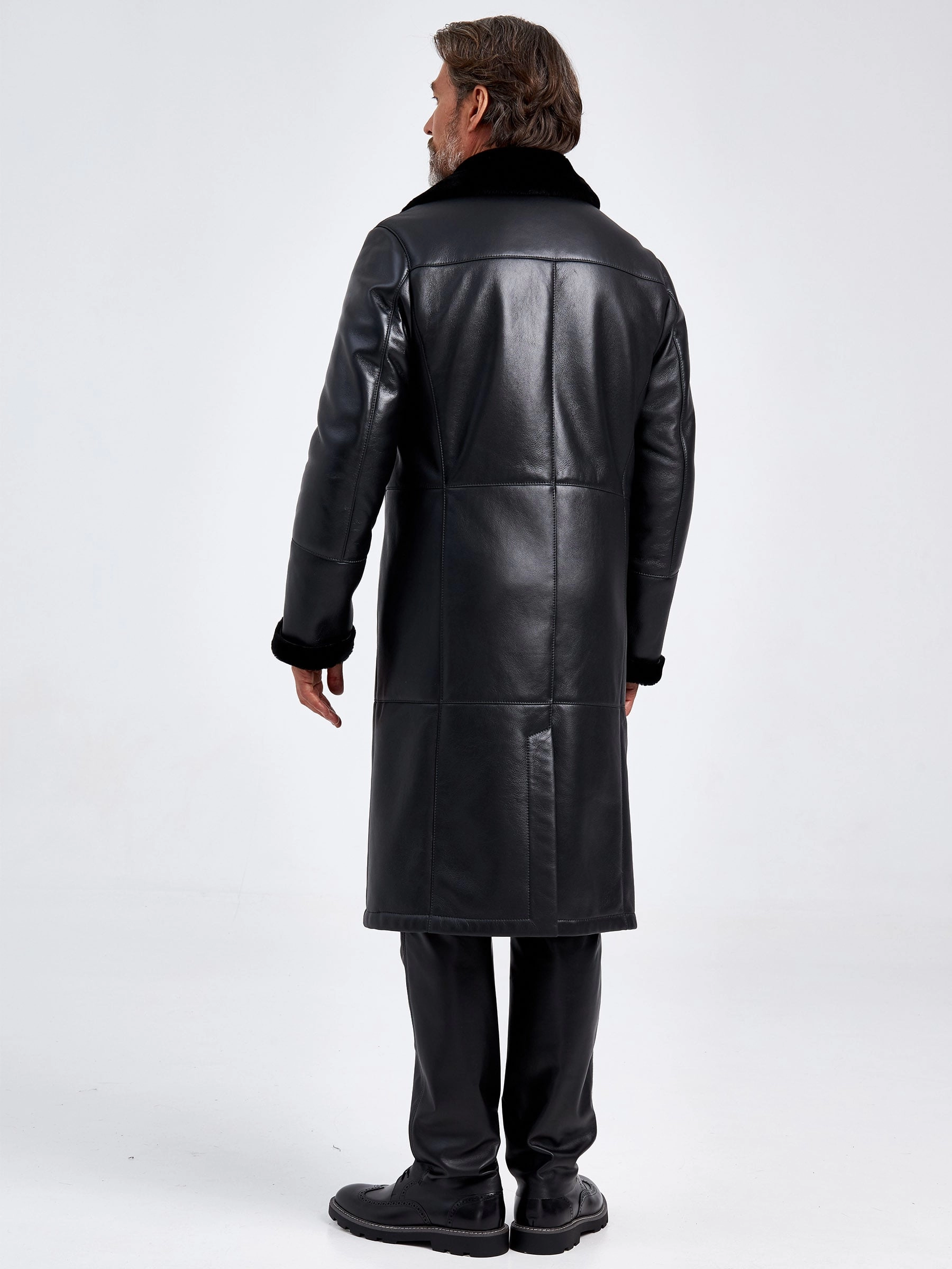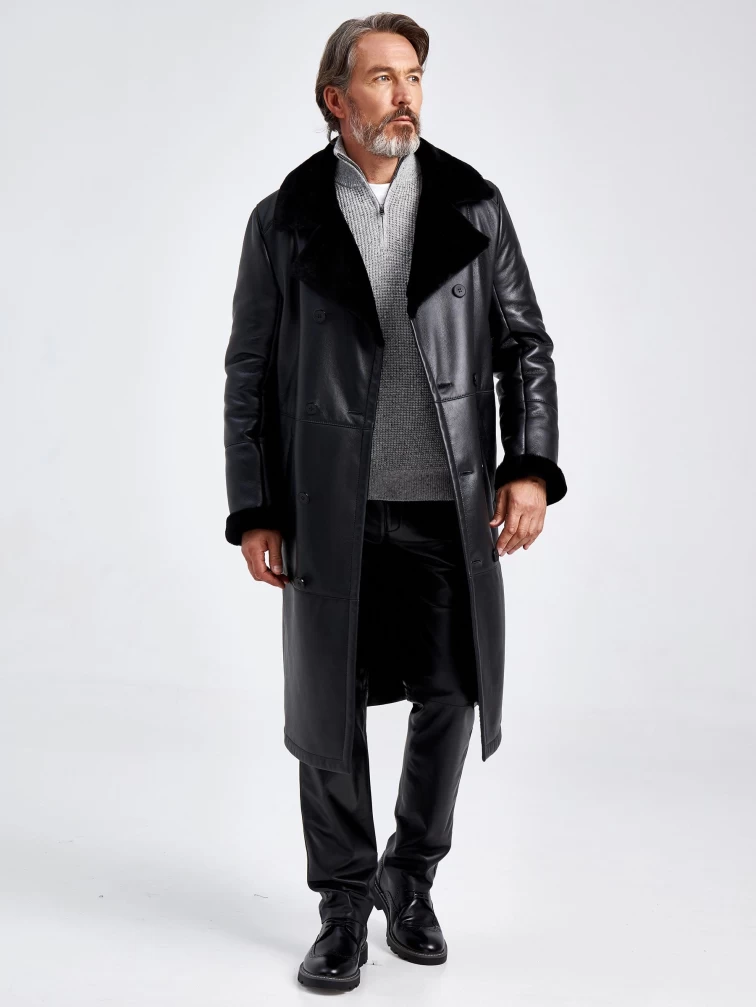 Товар длинная двубортная мужская дубленка премиум класса 432, черная, размер 50, артикул 70630 выполнен из овчина "мерино" с застежкой пуговицы. Рассчитан на сезон: осень-зима. Длина изделия 114 см, силуэт прямой.