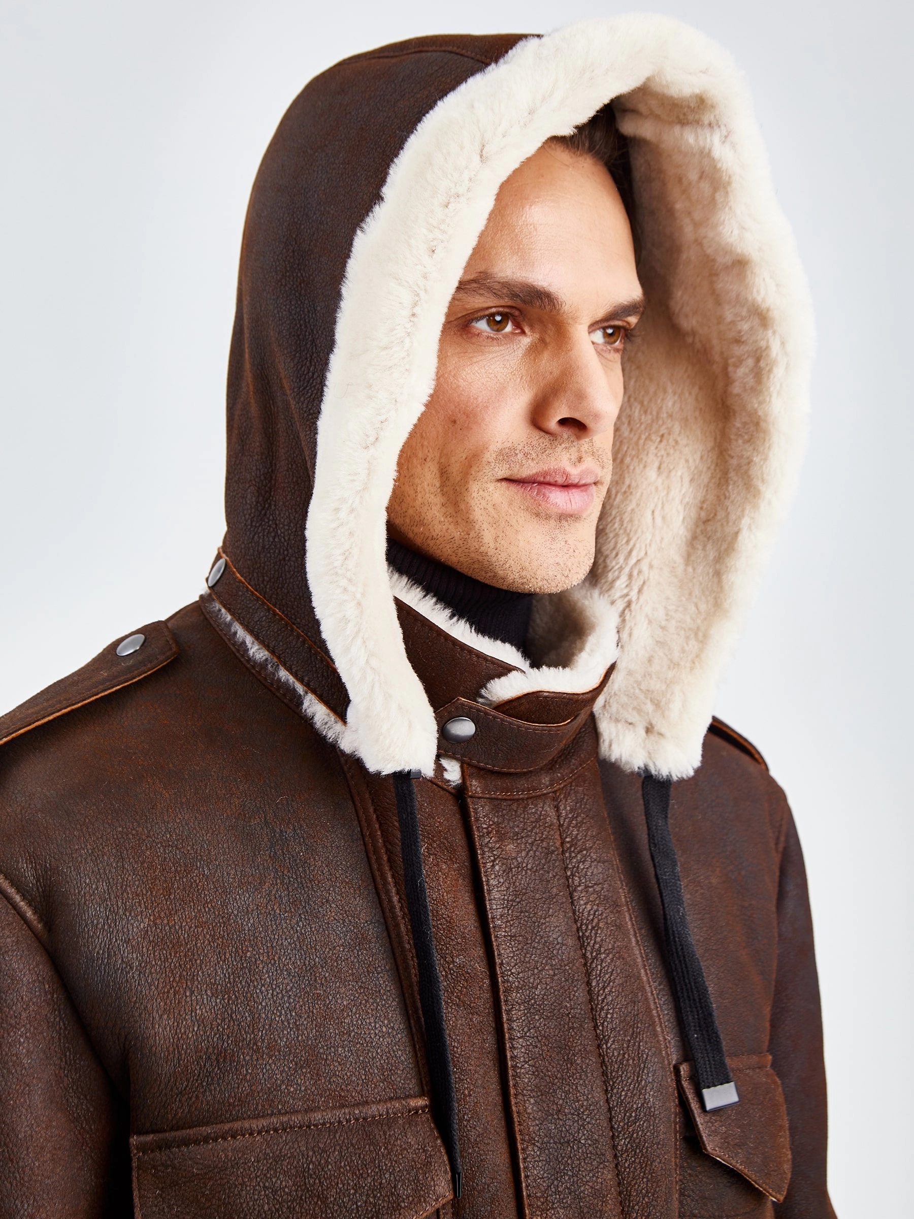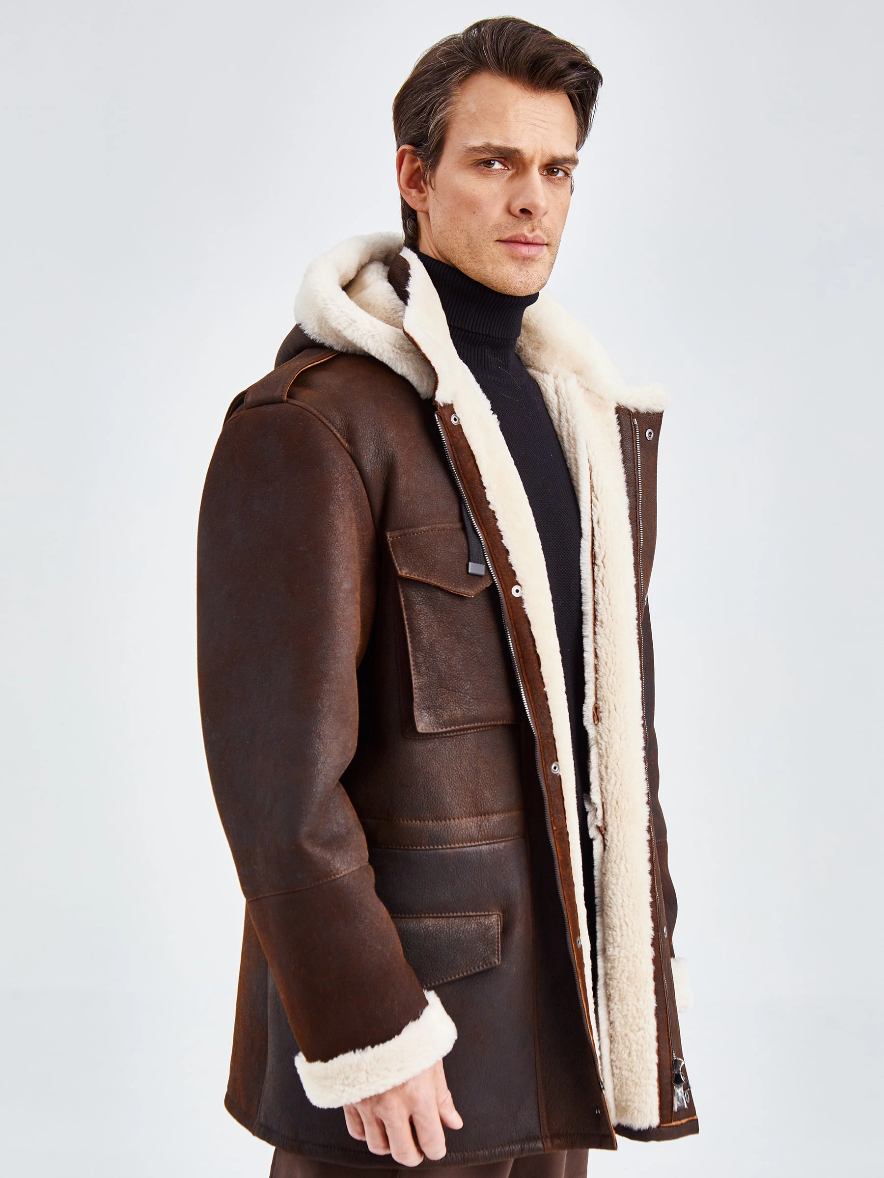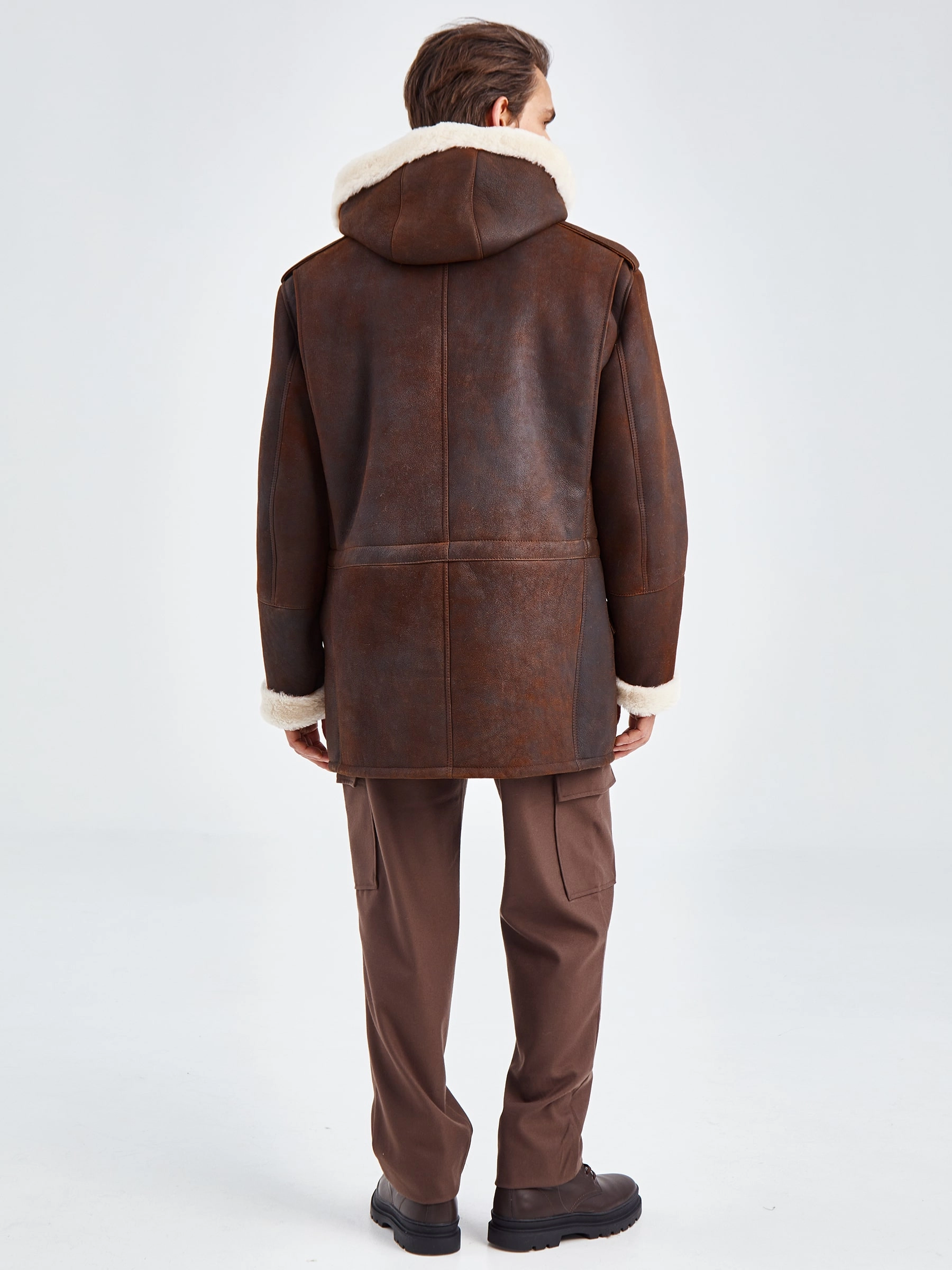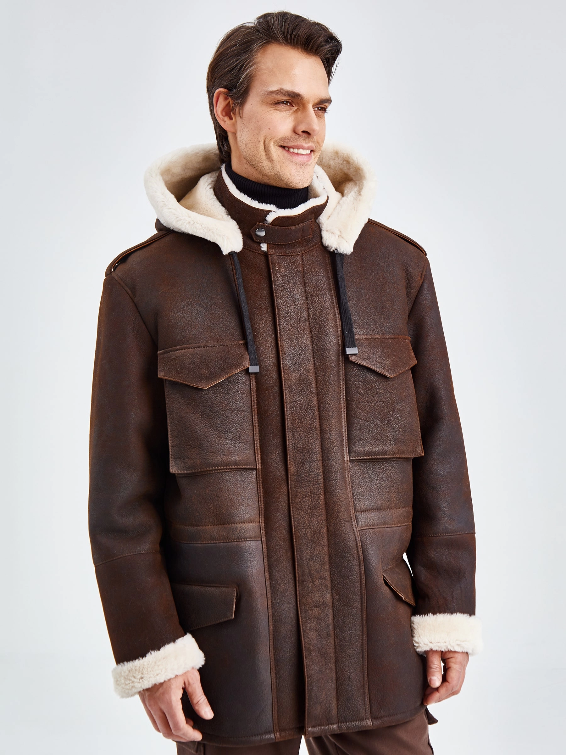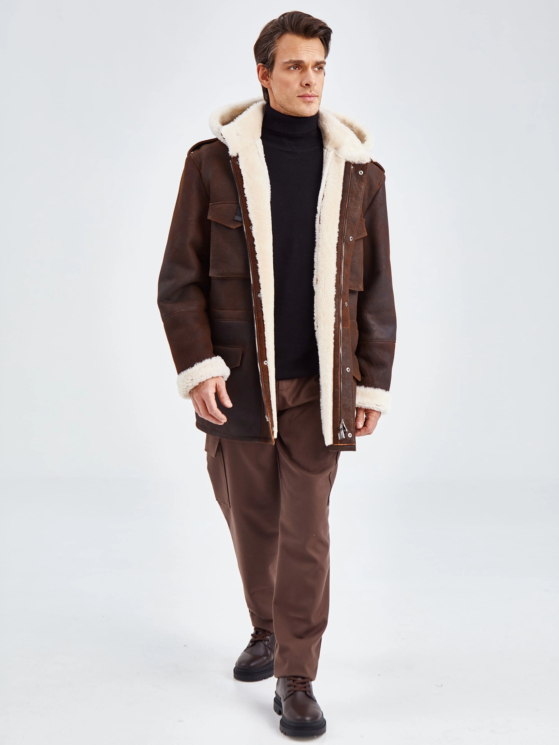 Товар дубленка мужская с капюшоном премиум класса 433, коричневая, размер 48, артикул 70750 выполнен из овчина "мерино" с застежкой молния. Рассчитан на сезон: осень-зима. Длина изделия 81 см, силуэт прямой.