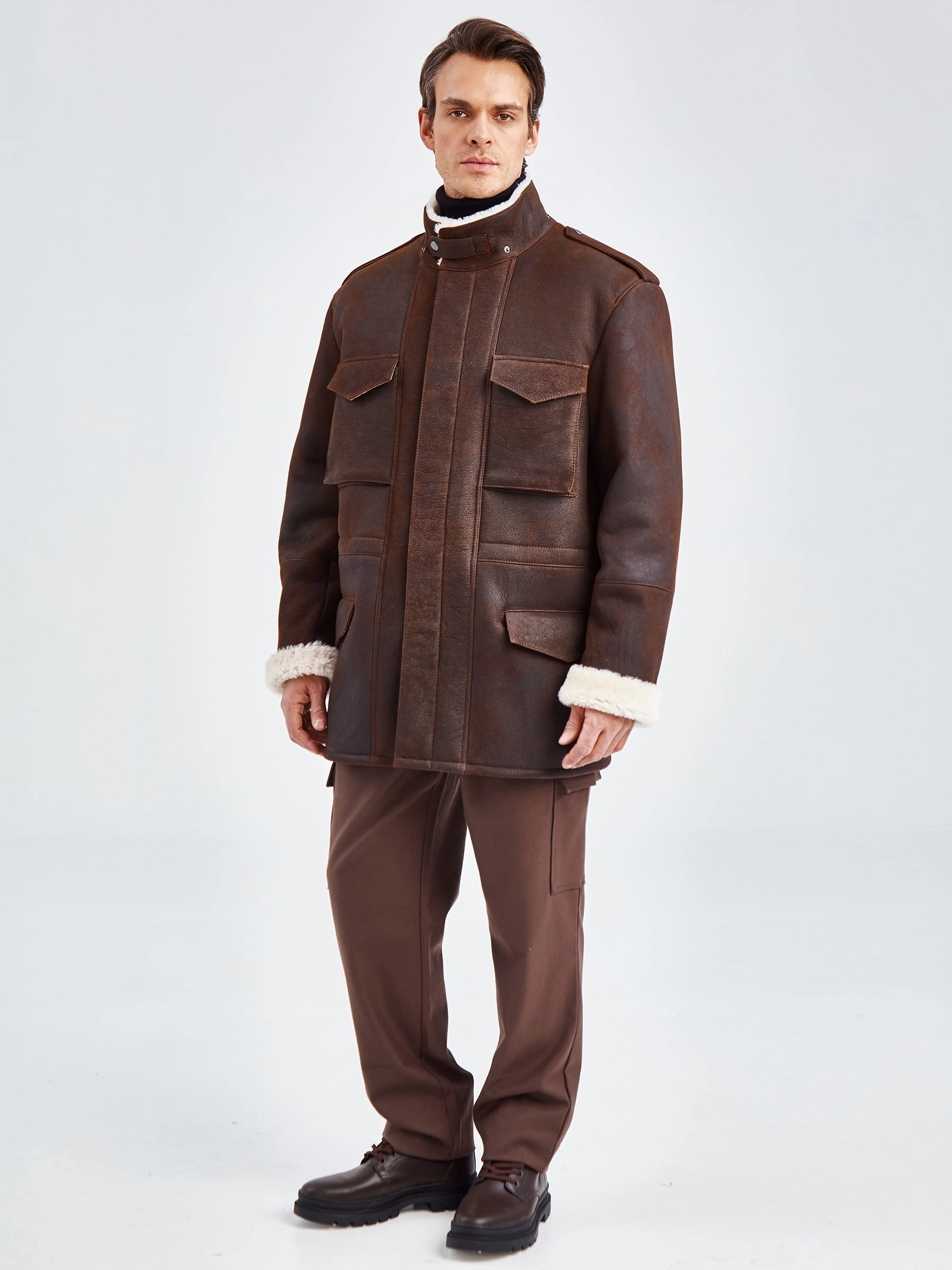 Мужская дубленка в стиле милитари. Мастера Primo Vello для изготовления коричневой дубленки выбрали мягкую плотную овчину. Изделие имеет невысокий воротник-стойку с застежкой в виде паты с квадратной пряжкой, а также четыре вместительных кармана. Потайная застежка на молнии, внутри модели пояс-кулиска.