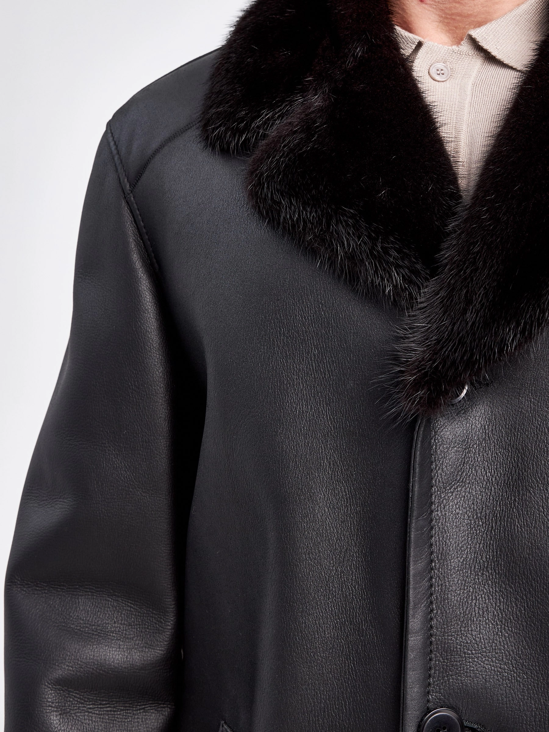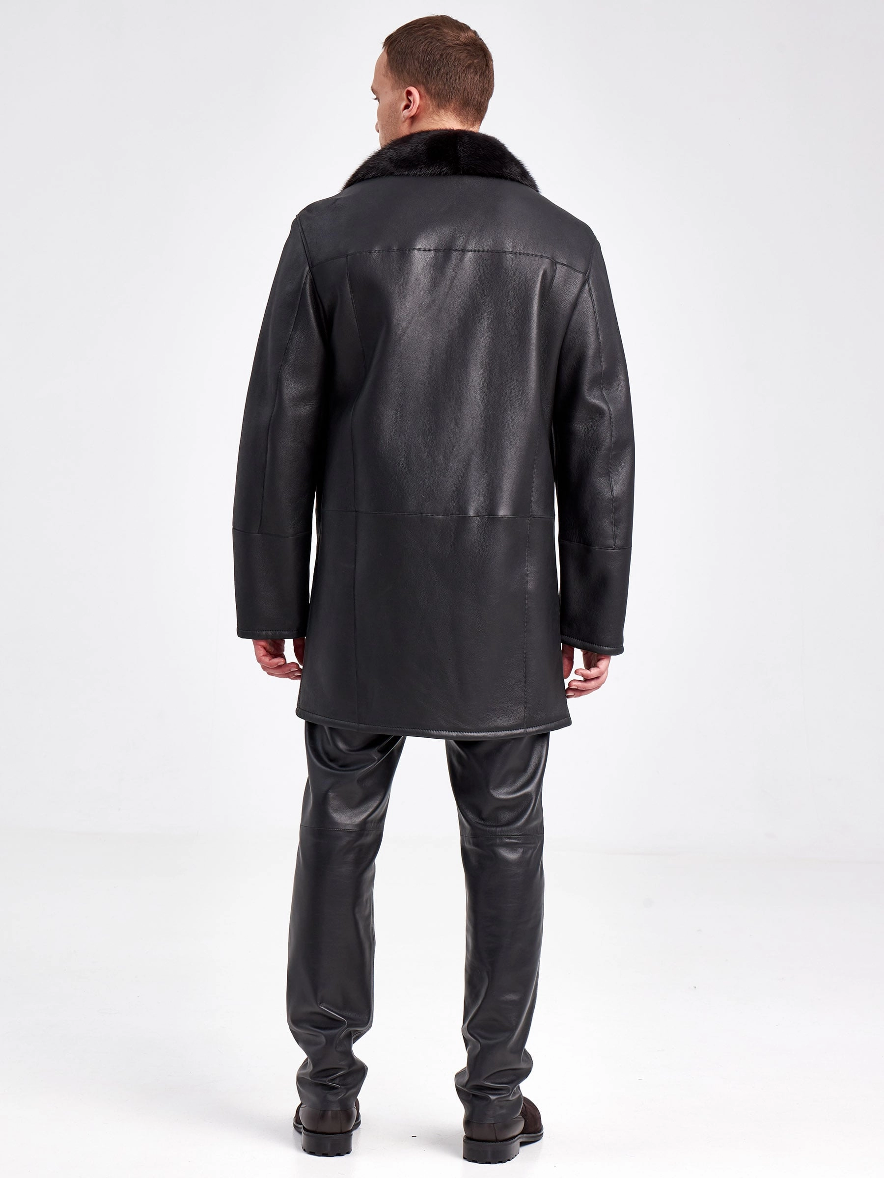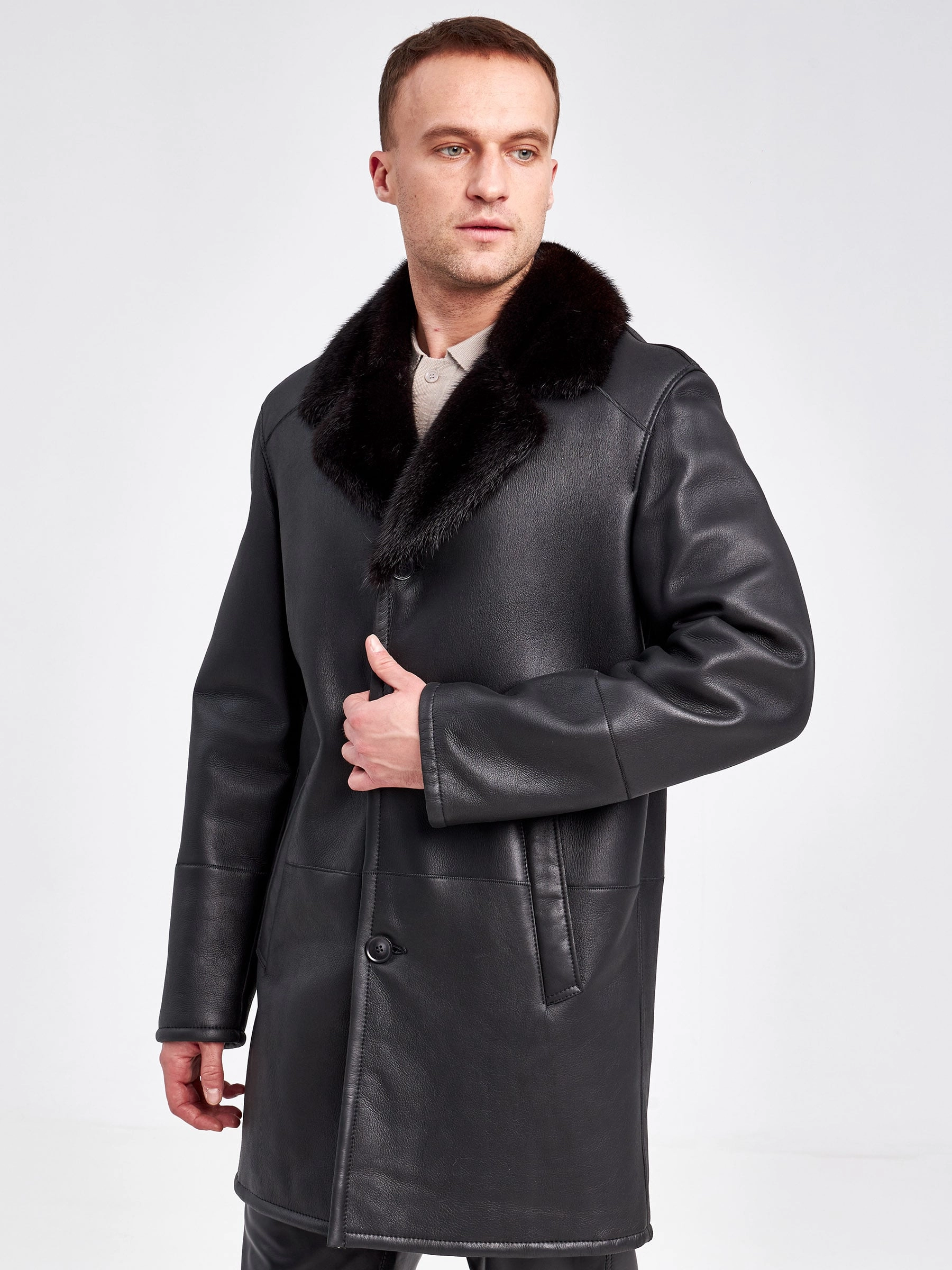 Классическая мужская дубленка (пальто) премиального качества из натурального меха овчины с покрытием "silk" и норковым воротником.