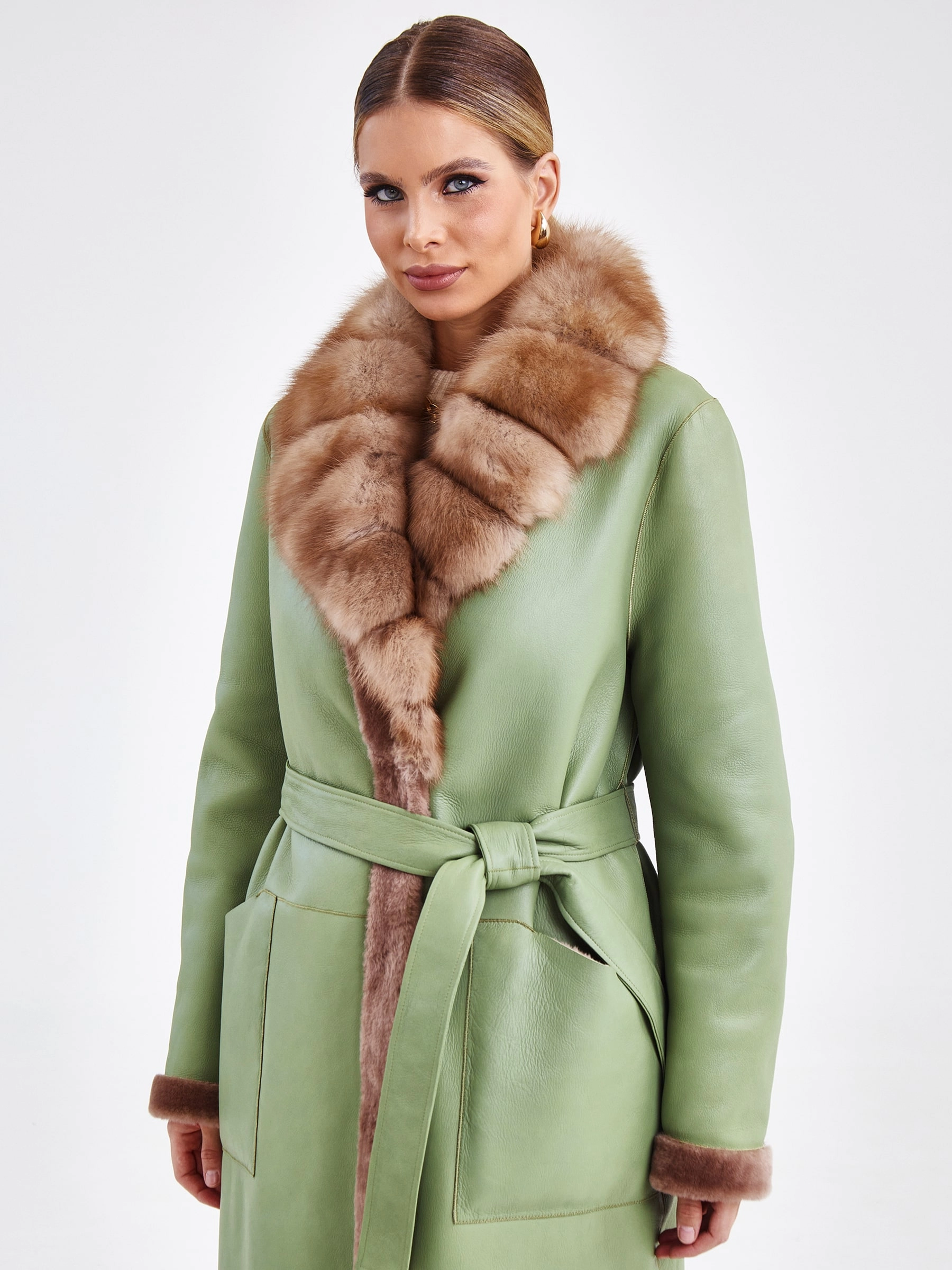 Эта дубленка- воплощение женственности и элегантности. Для пошива модели мастера использовали мягкую плотную овчину, сочетая два цвета: бежевый и оливковый. Изделие получилось легким и теплым. Прямой силуэт, комфортная посадка. Английский воротник выполнили из царского меха куницы.Застежка-кнопки. Манжеты и борт дополнили тонкой шелковистой овчиной. Длинный пояс поможет изменить силуэт, сделав его приталенным.