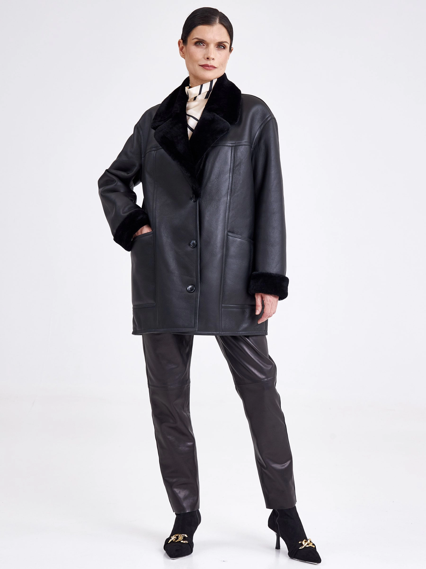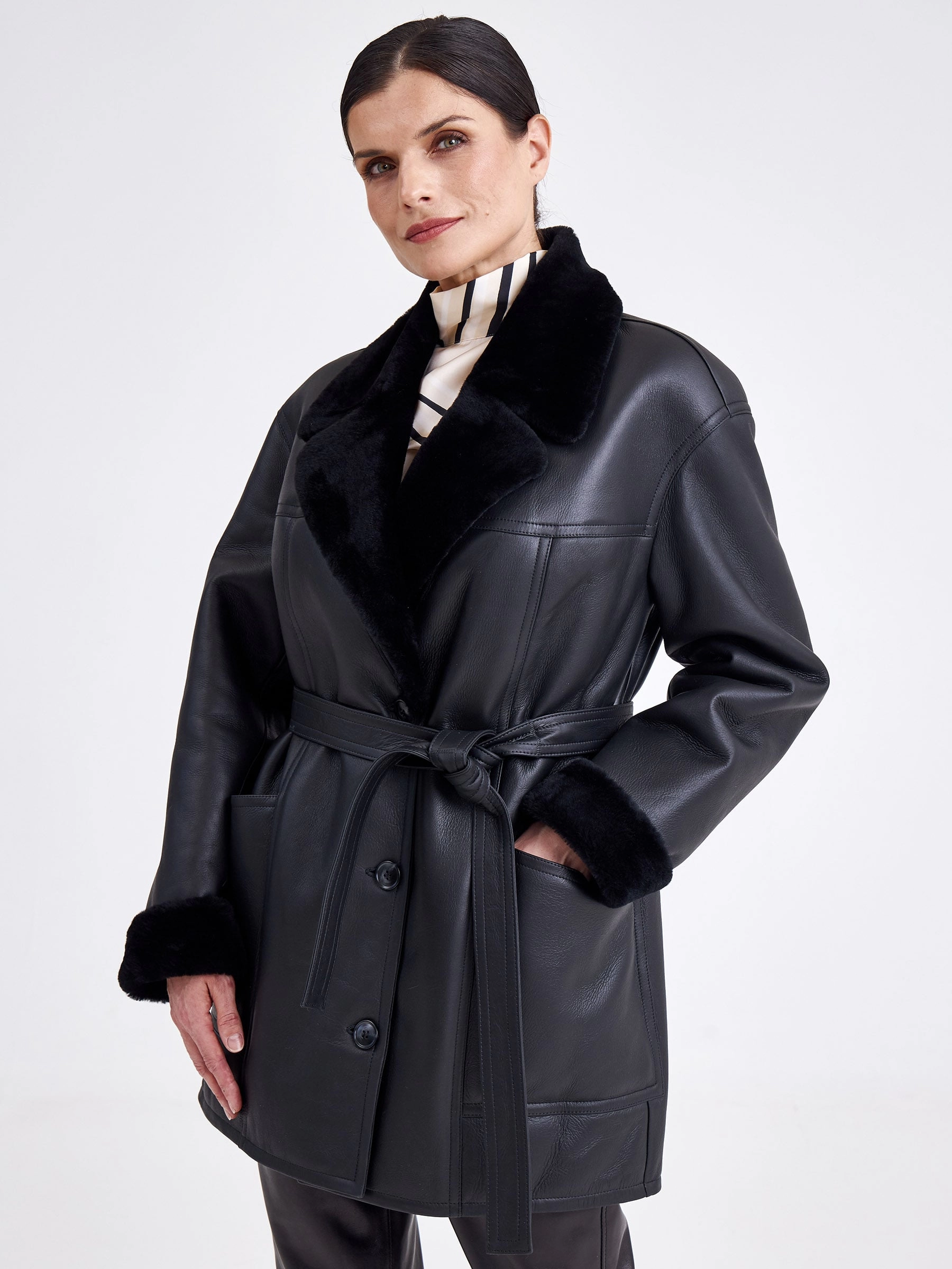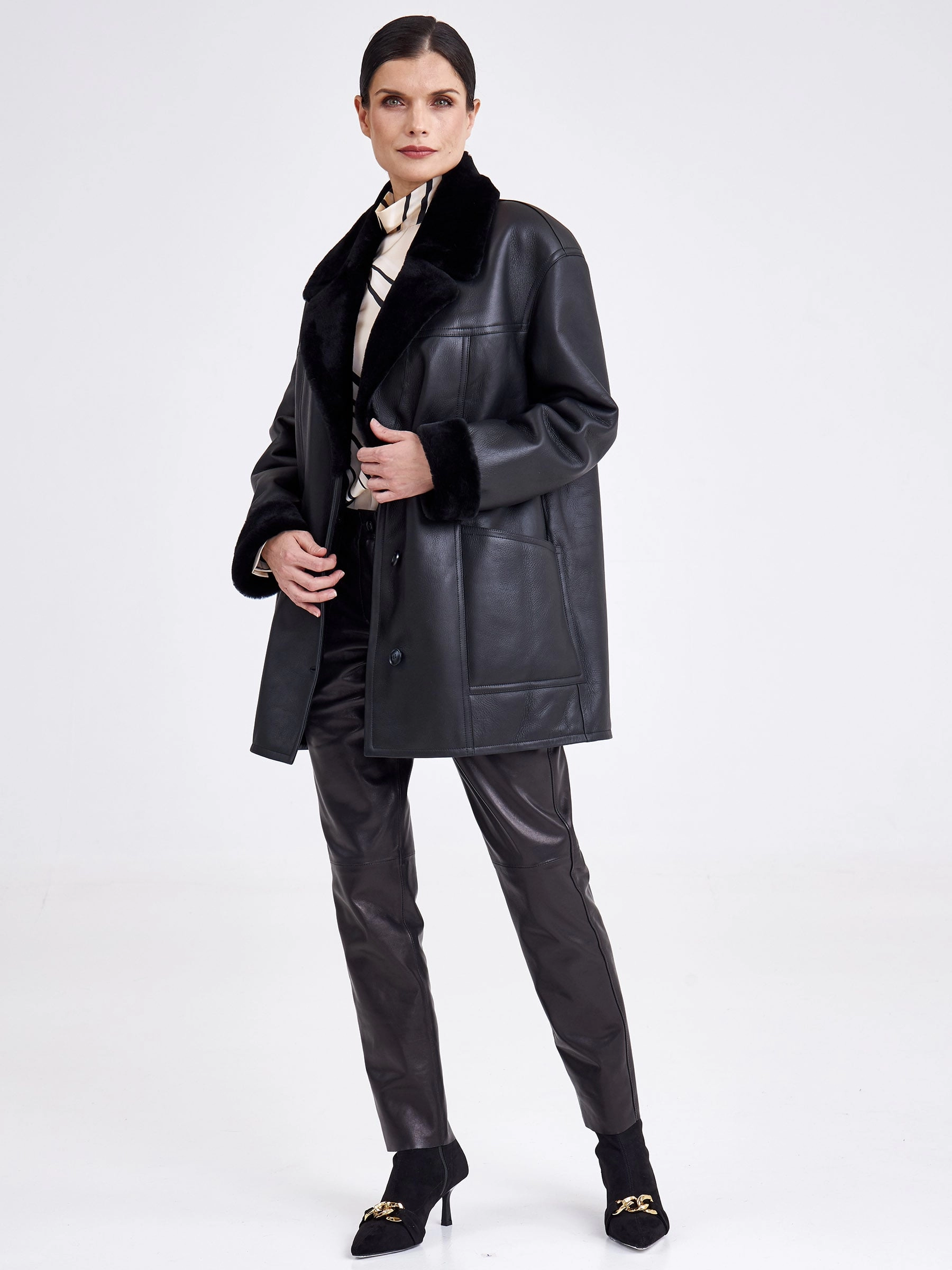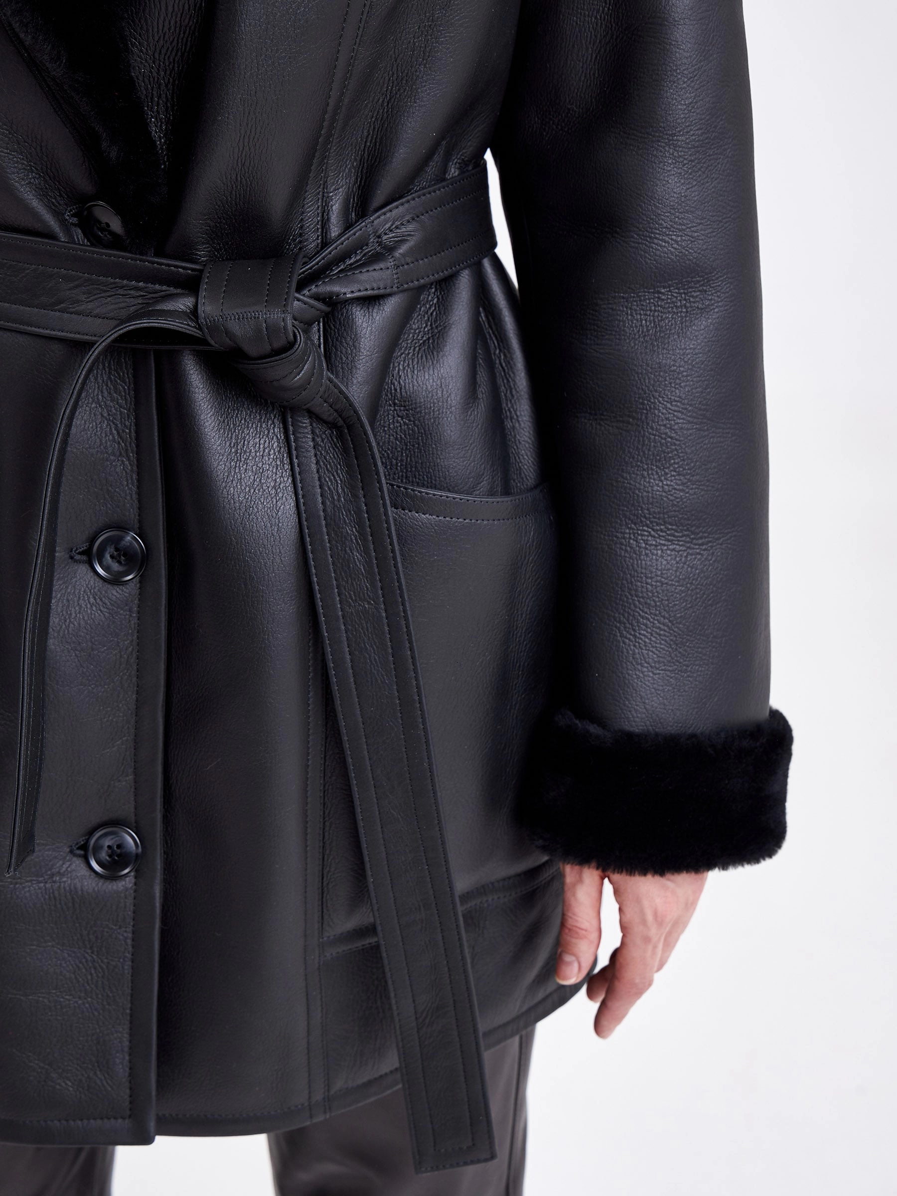 Безупречная элегантность и актуальная классика читается в этой модели. Изделие выполнили в универсальном черном цвете используя плотную овчину бережной выделки. Внутренняя сторона хорошо сохраняет тепло. Прямой крой, английский воротник, застежка-пуговицы.Завершили модель двумя большими карманами и широким поясом, который поможет изменить силуэт.