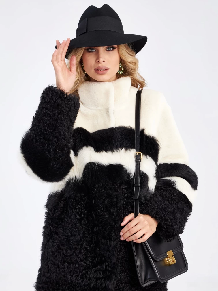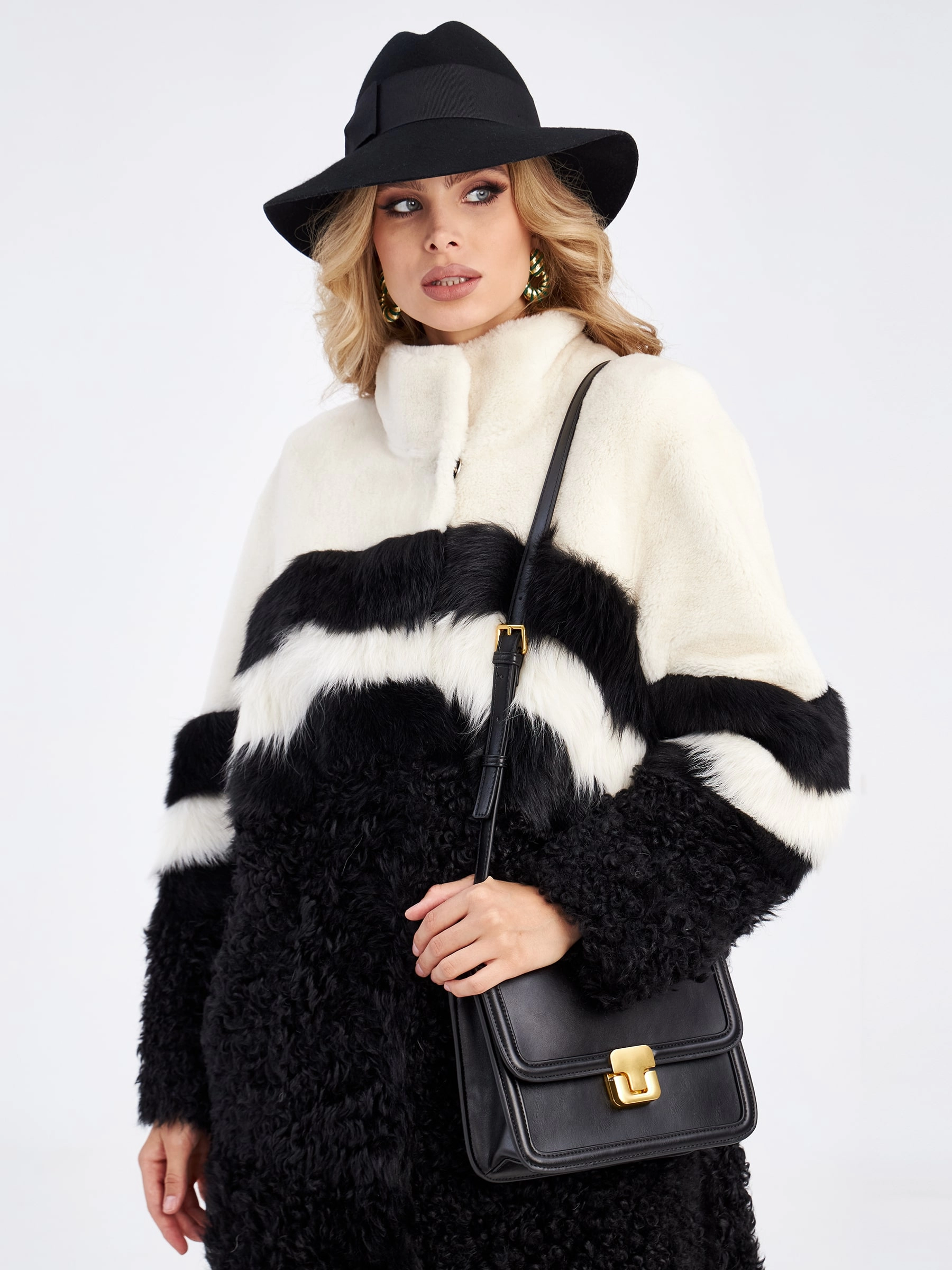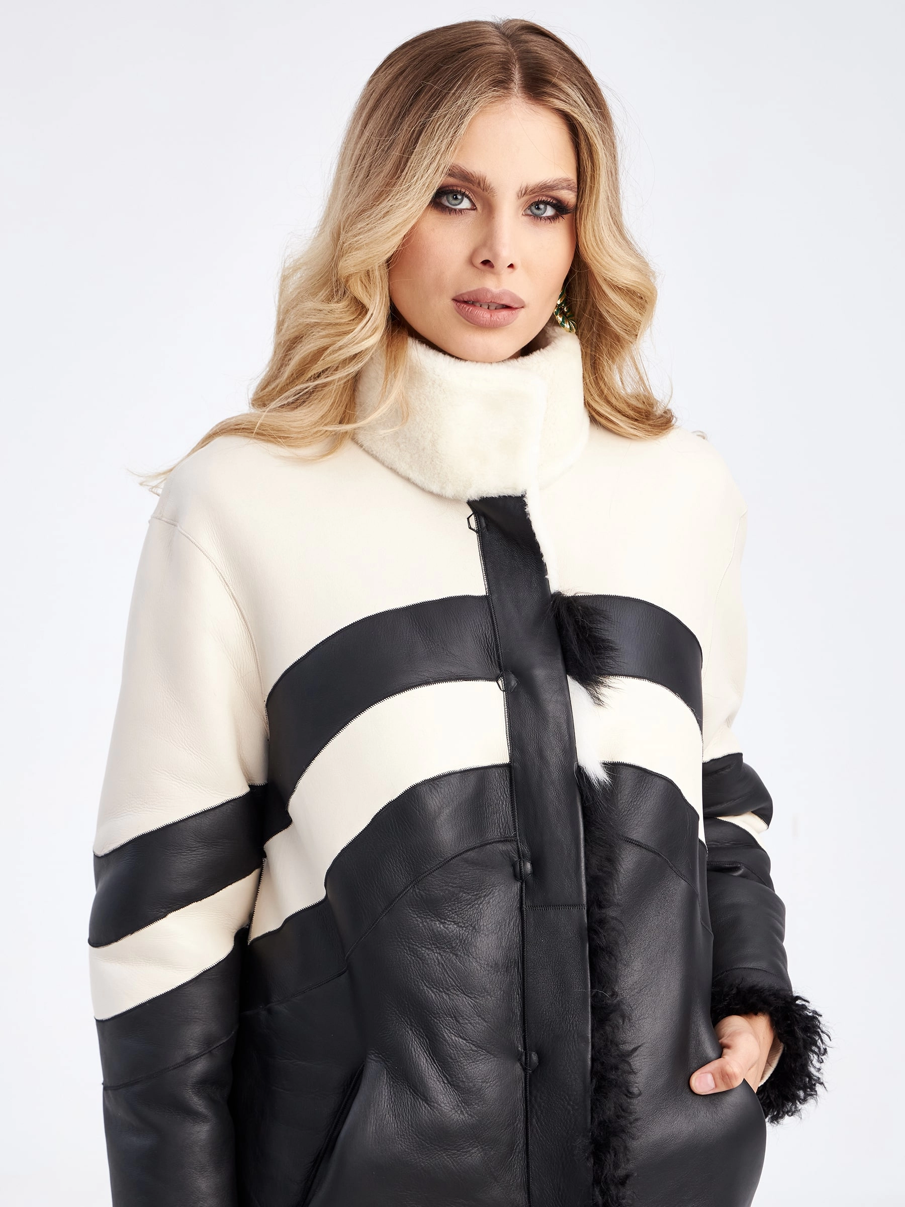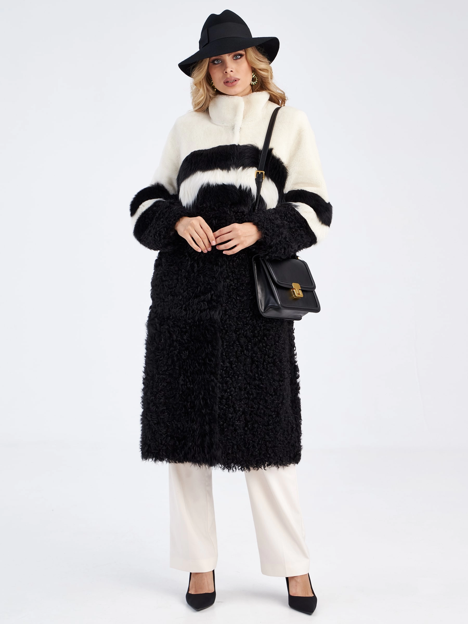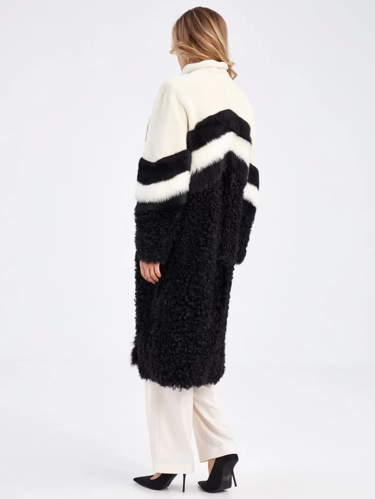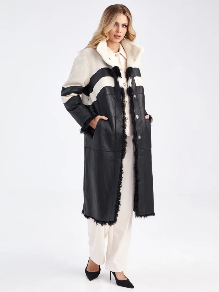Длинная дубленка прямого кроя в черно-белом оттенке, станет доказательством того, что можно найти компромисс между красотой и удобством. Выполняя эту модель мастера использовали плотную мягкую овчину в комбинации с шелковистым мехом тиградо. Материал хорошо сохраняет тепло даже в сильный мороз, а воротник - стойка обеспечит особый комфорт в непогоду.