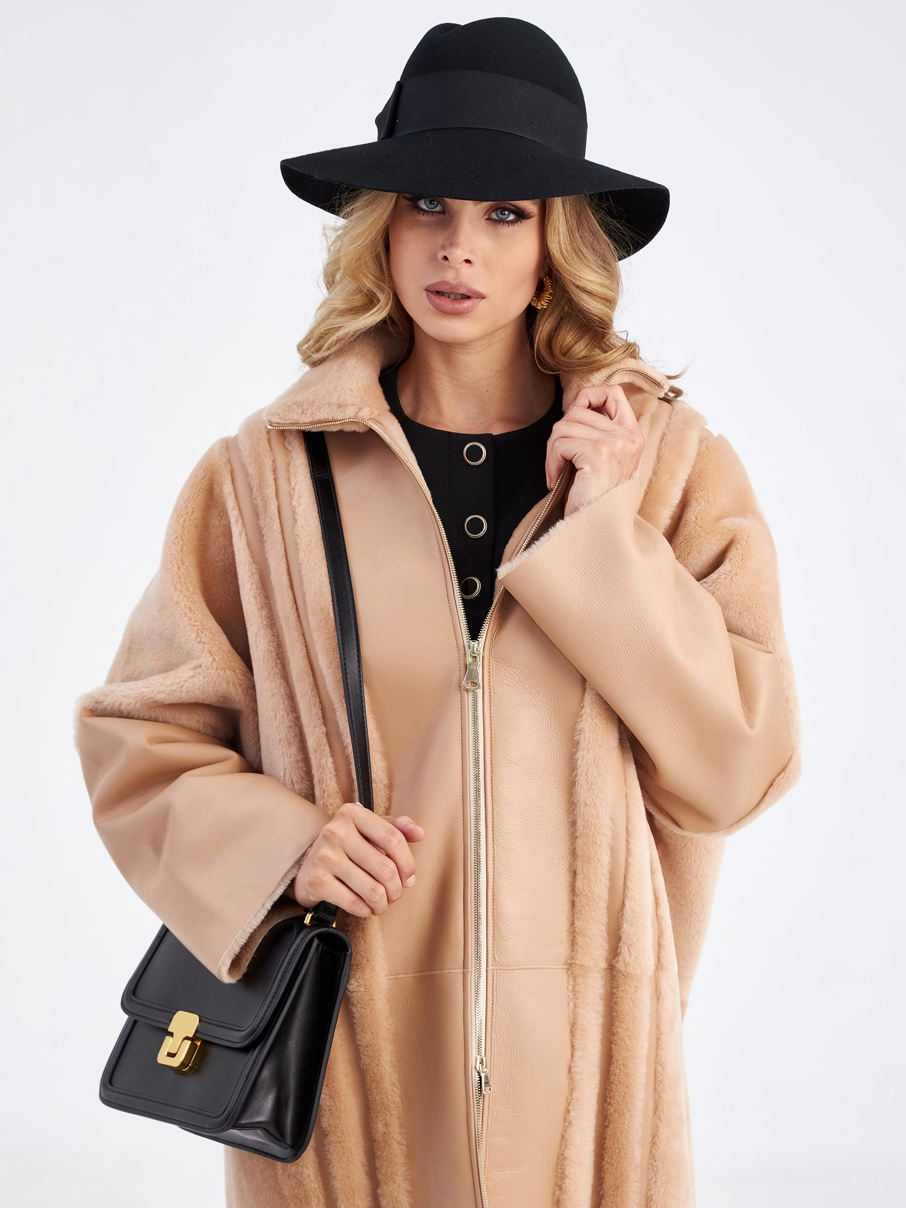 Эта женская дубленка на молнии с норковым воротником премиум-класса в нежном бежевом цвете — прямое доказательство того, что элегантной можно оставаться даже в самые холодные и морозные дни. Модель свободного прямого кроя со спущенным плечом и длиной 110 см выполнена из стриженой овчины мерино с гладкой благородной фактурой, а для выразительной отделки мастера использовали изнаночные бархатистые полосы, которые добавляют изделию графичности и объема. Дополнительной защитой от ветра и главным акцентом дубленки служит роскошный воротник-стойка из нежной пушистой норки бежевого оттенка — он эффектно контрастирует с основой, придавая образу утонченность и визуальное тепло. Два вместительных боковых кармана, как и центральная застежка всего изделия, закрываются на крупные молнии в цвете золото, что подчеркивает премиальный статус модели и добавляет ей современного шика. Чтобы создать сбалансированный и по-настоящему элегантный образ, стилисты рекомендуют носить эту дубленку с одеждой в монохромной бежевой, молочно