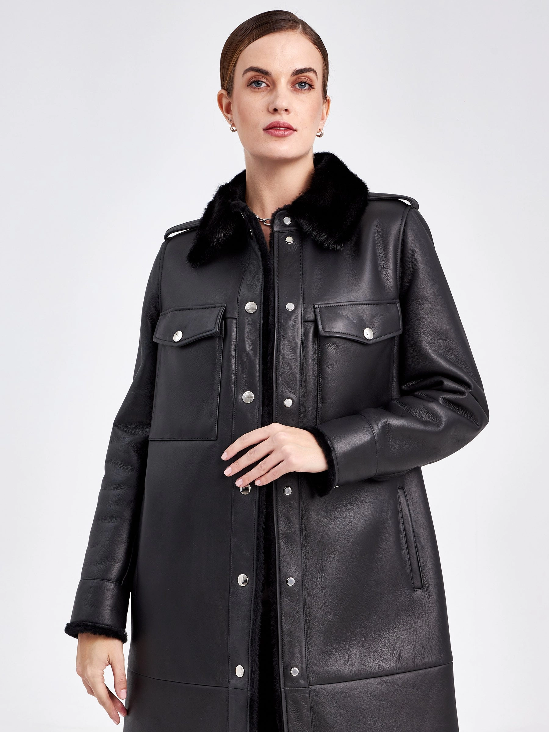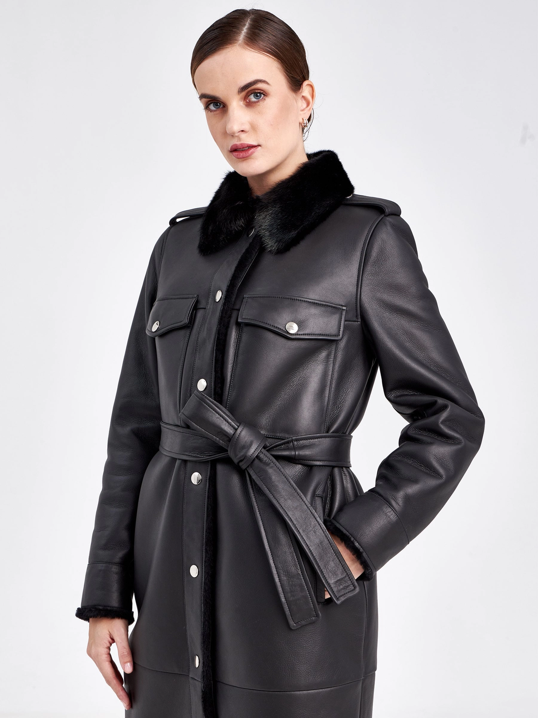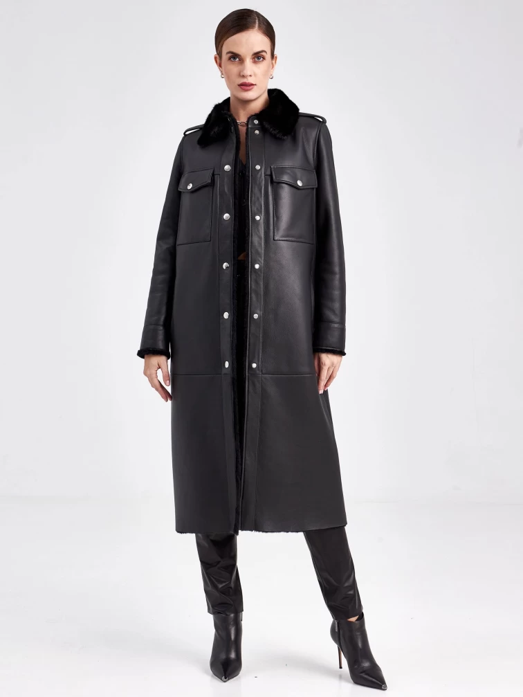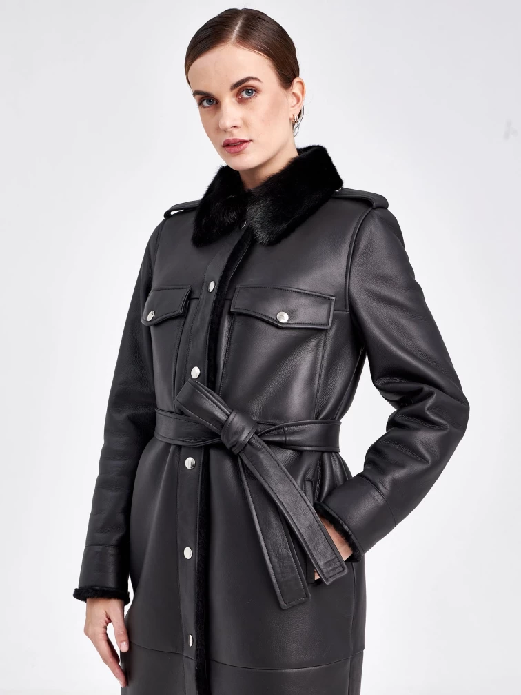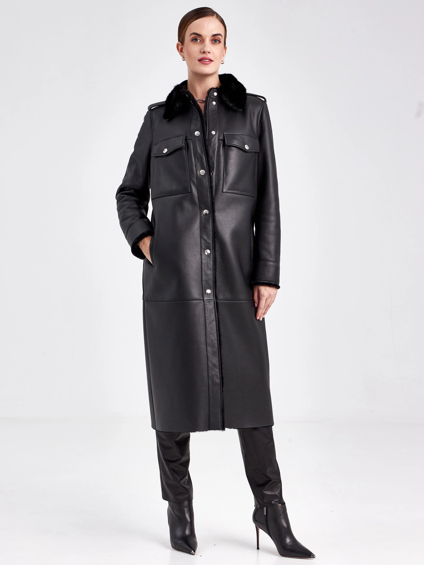 Товар женская дубленка рубашка с воротником из меха норки премиум класса 2016, черная, размер 44, артикул 62731 выполнен из овчина "мерино" с застежкой кнопки. Рассчитан на сезон: осень-зима. Длина изделия свыше 90 см, силуэт прямой.