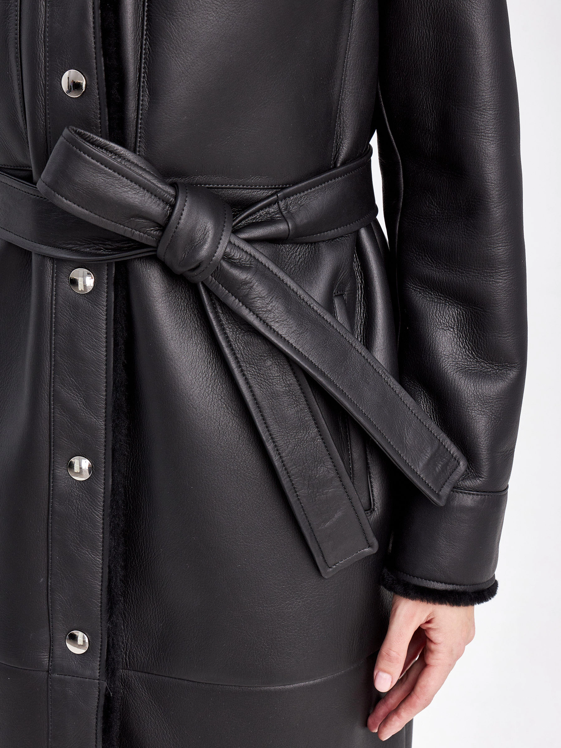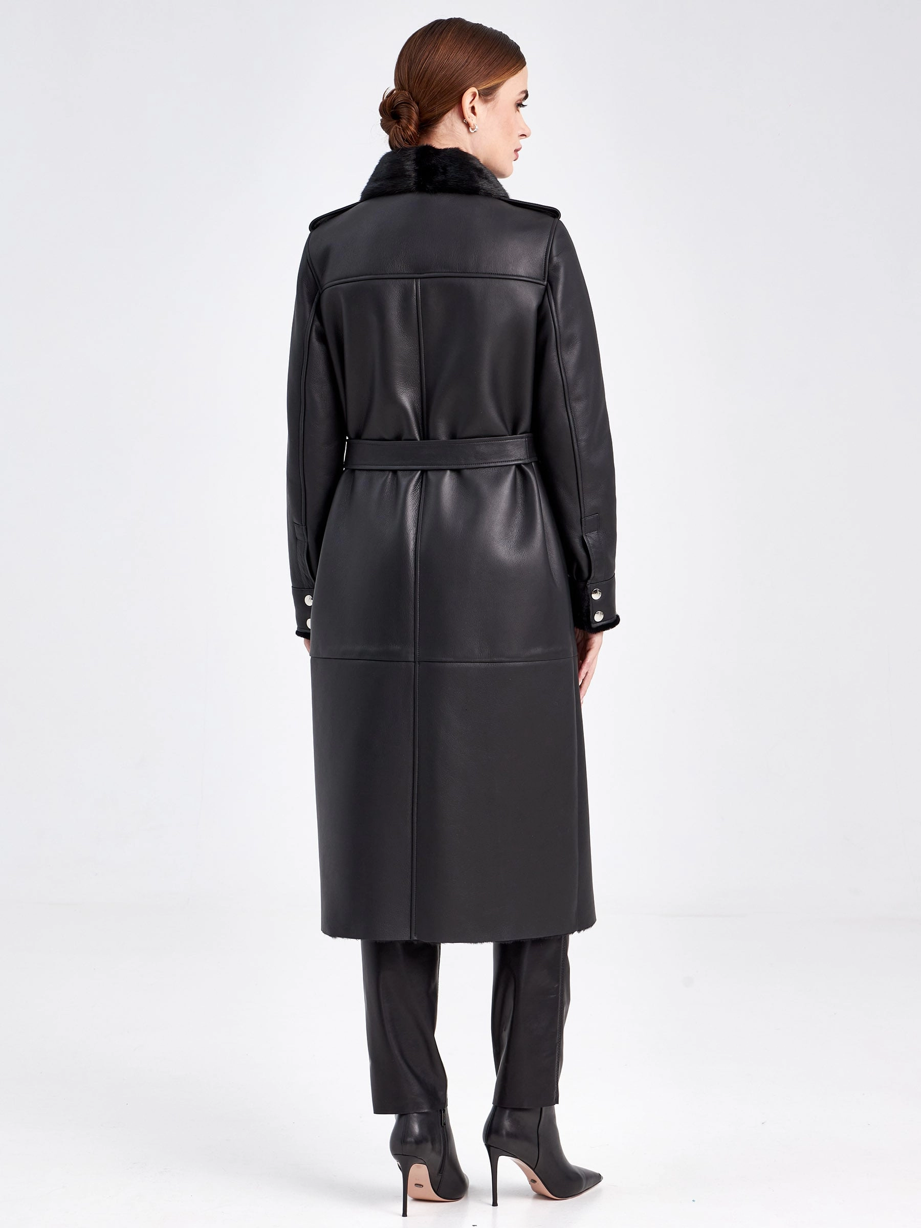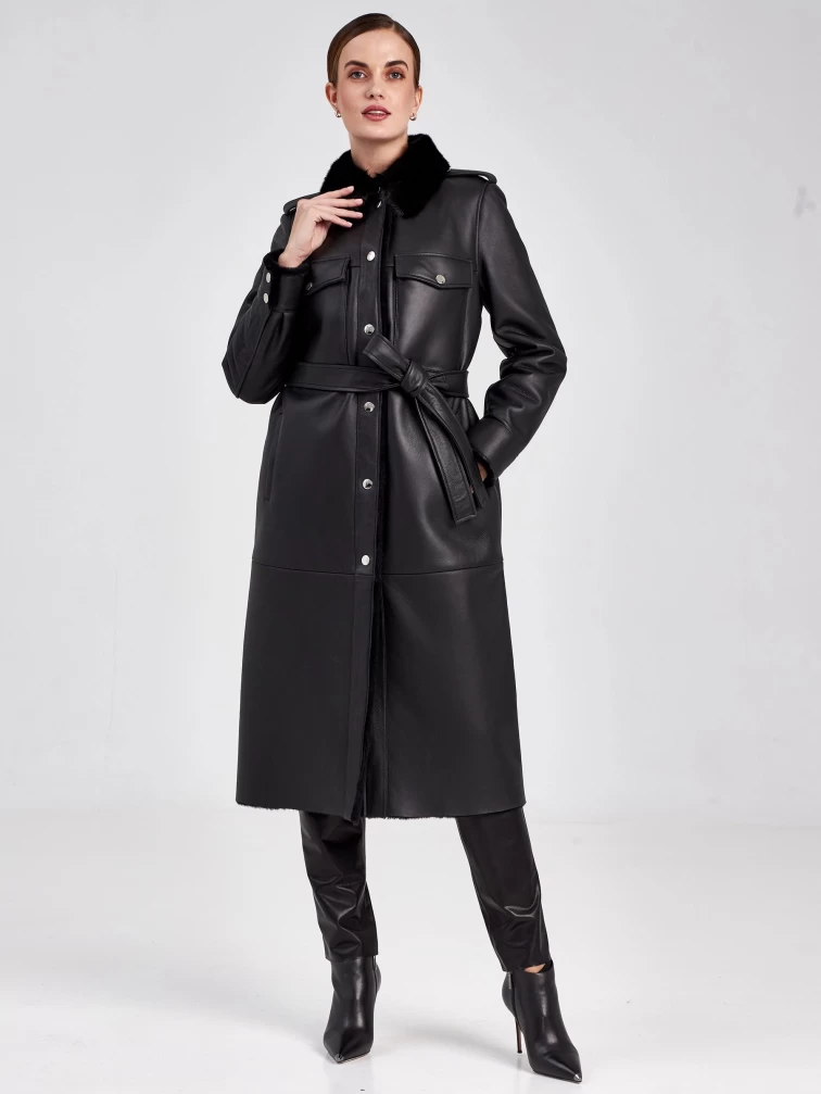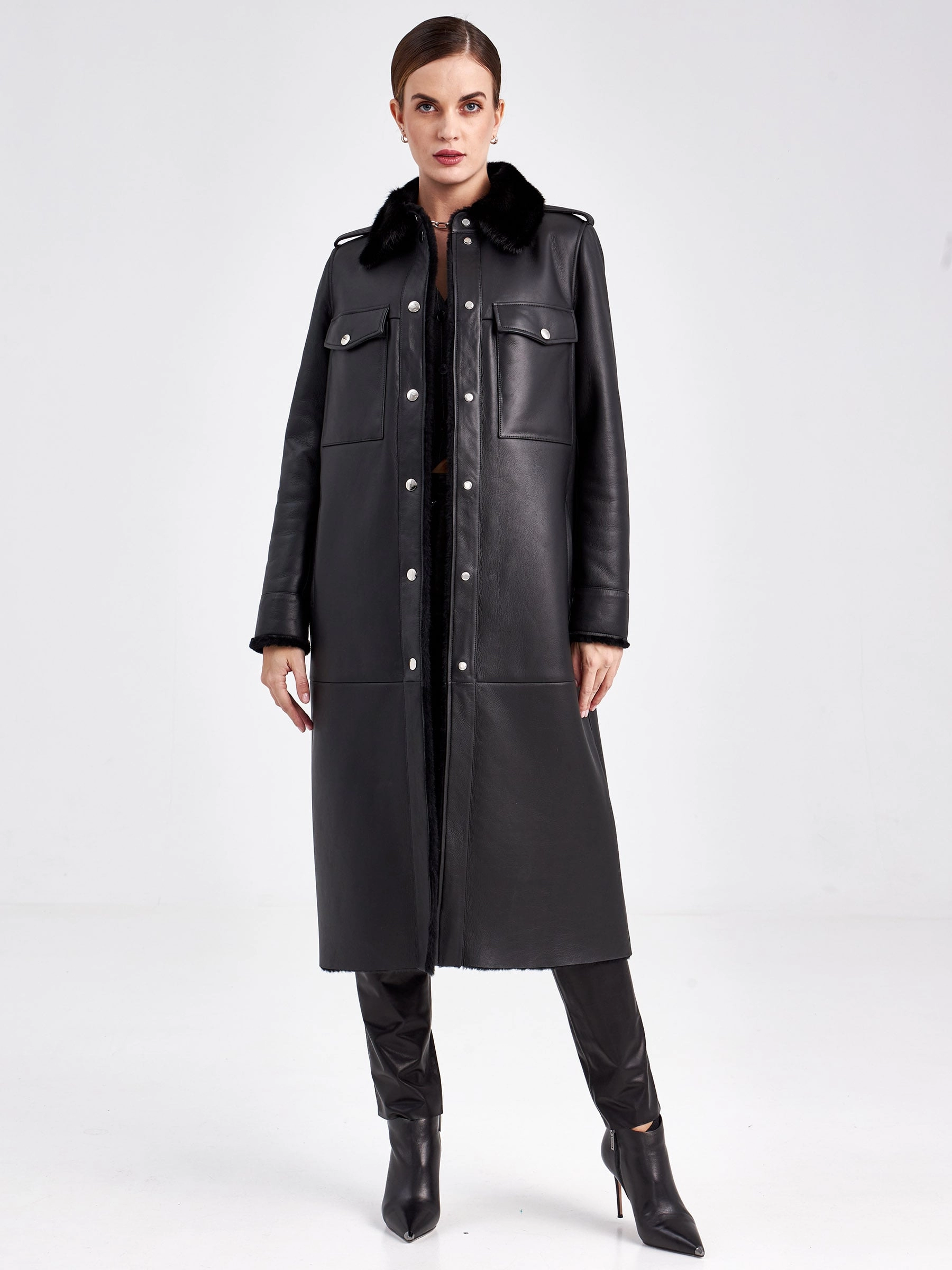 Товар женская дубленка рубашка с воротником из меха норки премиум класса 2016, черная, размер 44, артикул 62731 выполнен из овчина "мерино" с застежкой кнопки. Рассчитан на сезон: осень-зима. Длина изделия свыше 90 см, силуэт прямой.