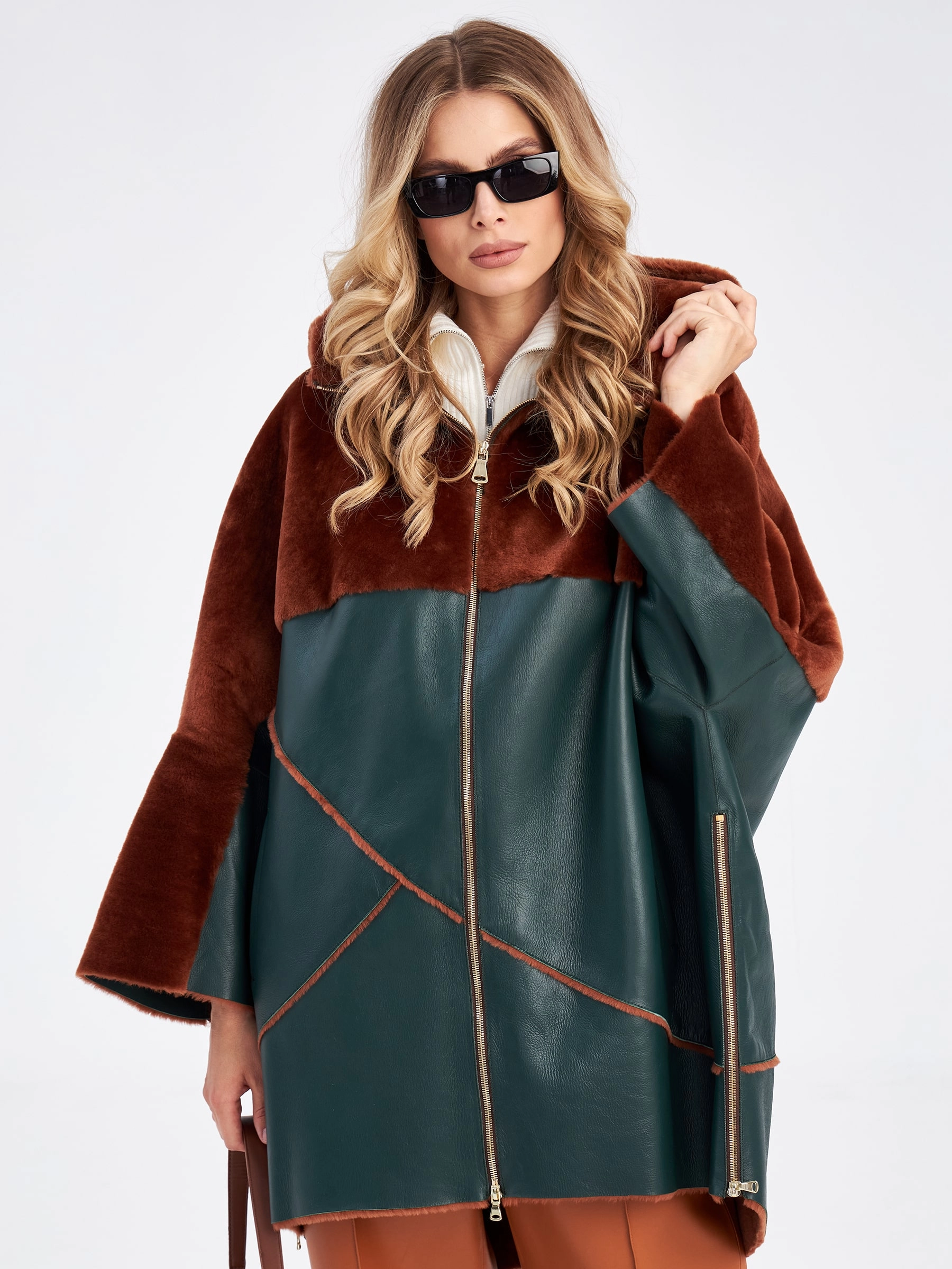 Нельзя оставить без внимания дубленку свободного кроя выполненную из нежного меха ягненка. Создавая эту модель, мастера словно поделили ее пополам используя два контрастных оттенка:коричневый и зеленый. Верхнюю часть и широкий рукав выделили мехом наружу. Для нижней - использовали плотную овчину из которой сшили модель, обработав ее так, чтобы с внешней стороны она напоминала гладкую кожу. Изделие дополнили объемным капюшоном. Застежкой боковых разрезов и самой модели послужила крупная молния в цвете золото.
