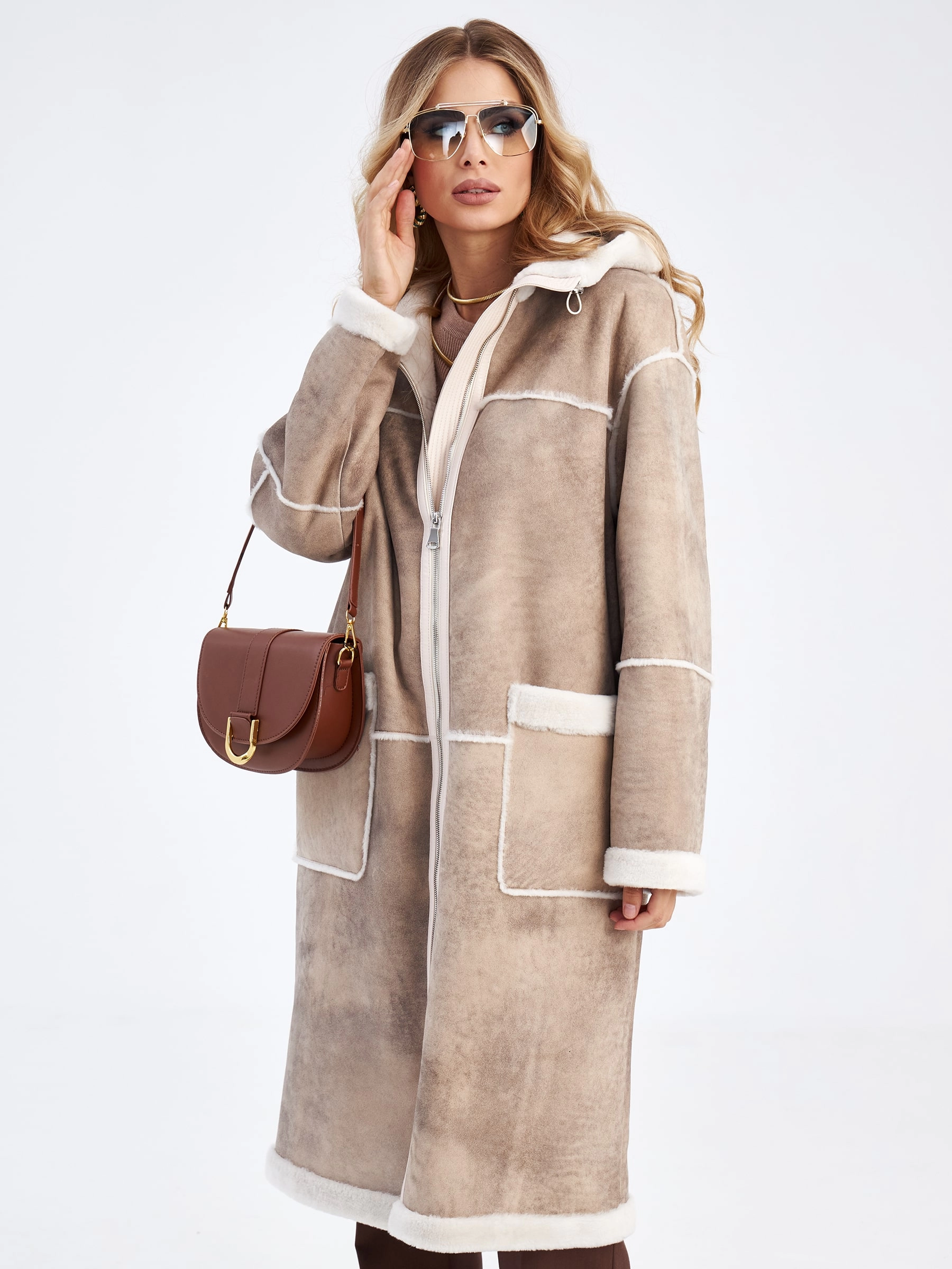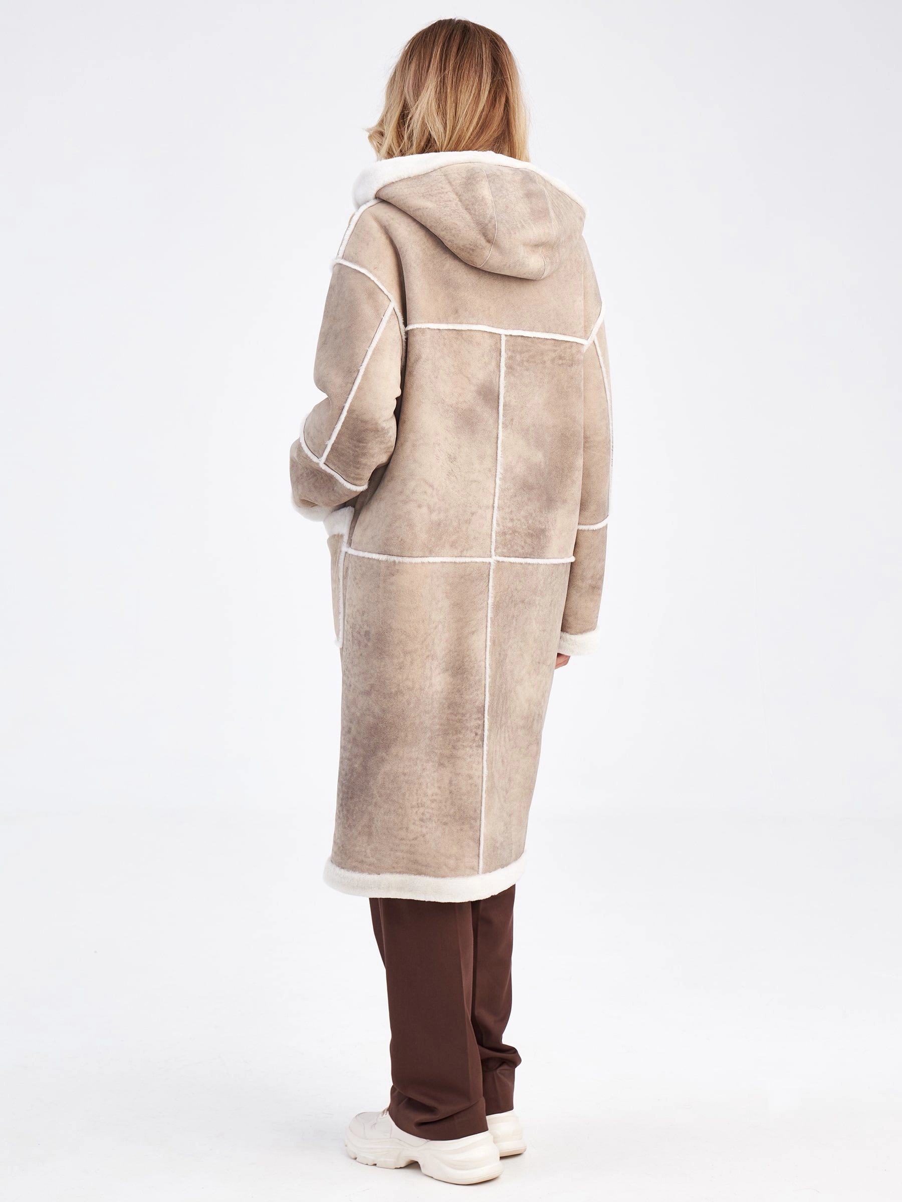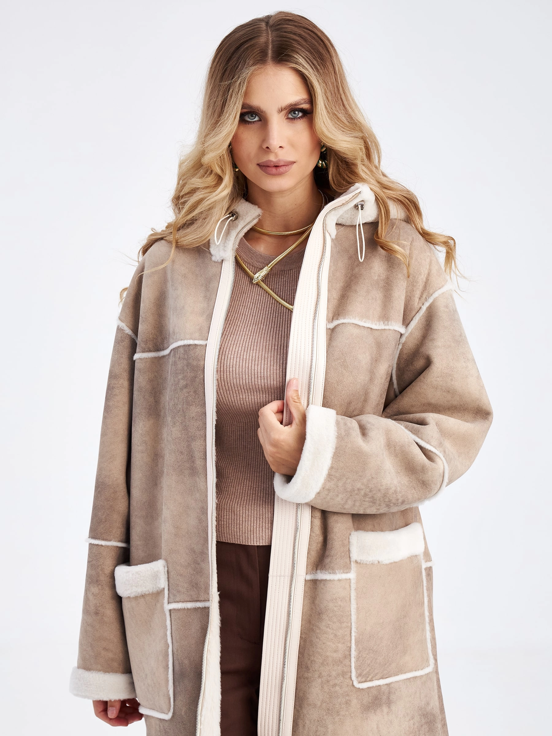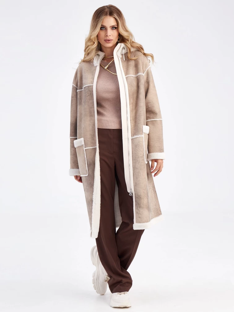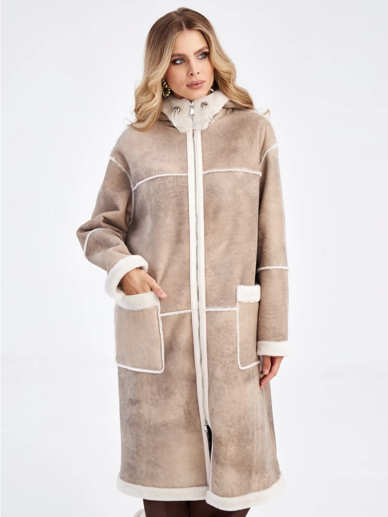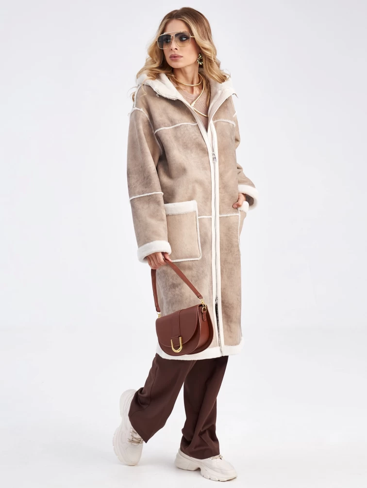 Длинная оверсайз дубленка с капюшоном для женщин премиум класса 2028, бежевая, размер 44, артикул 62990