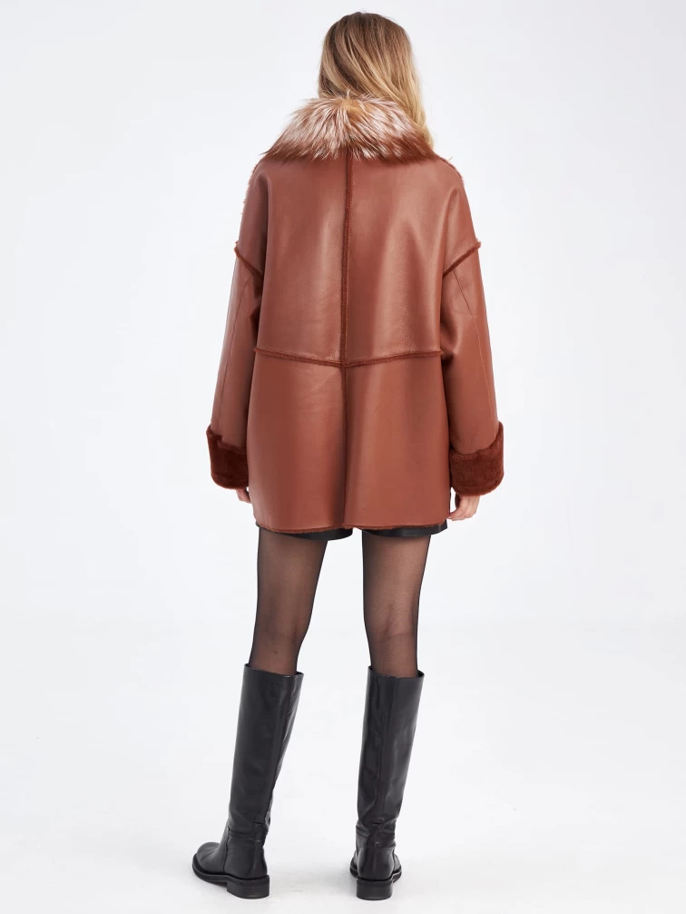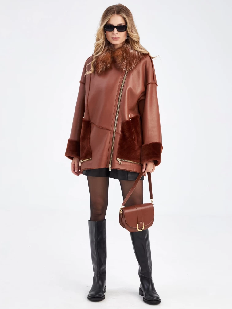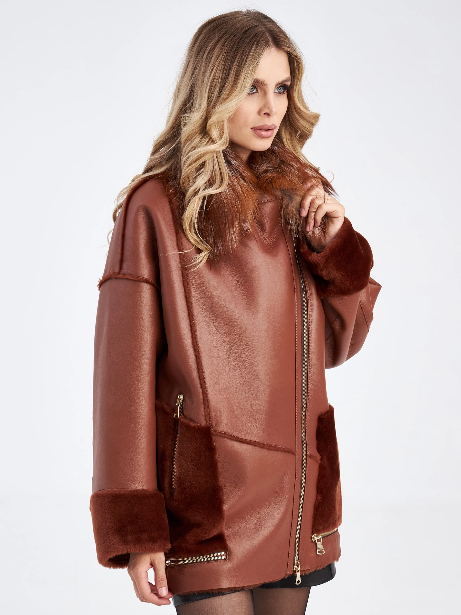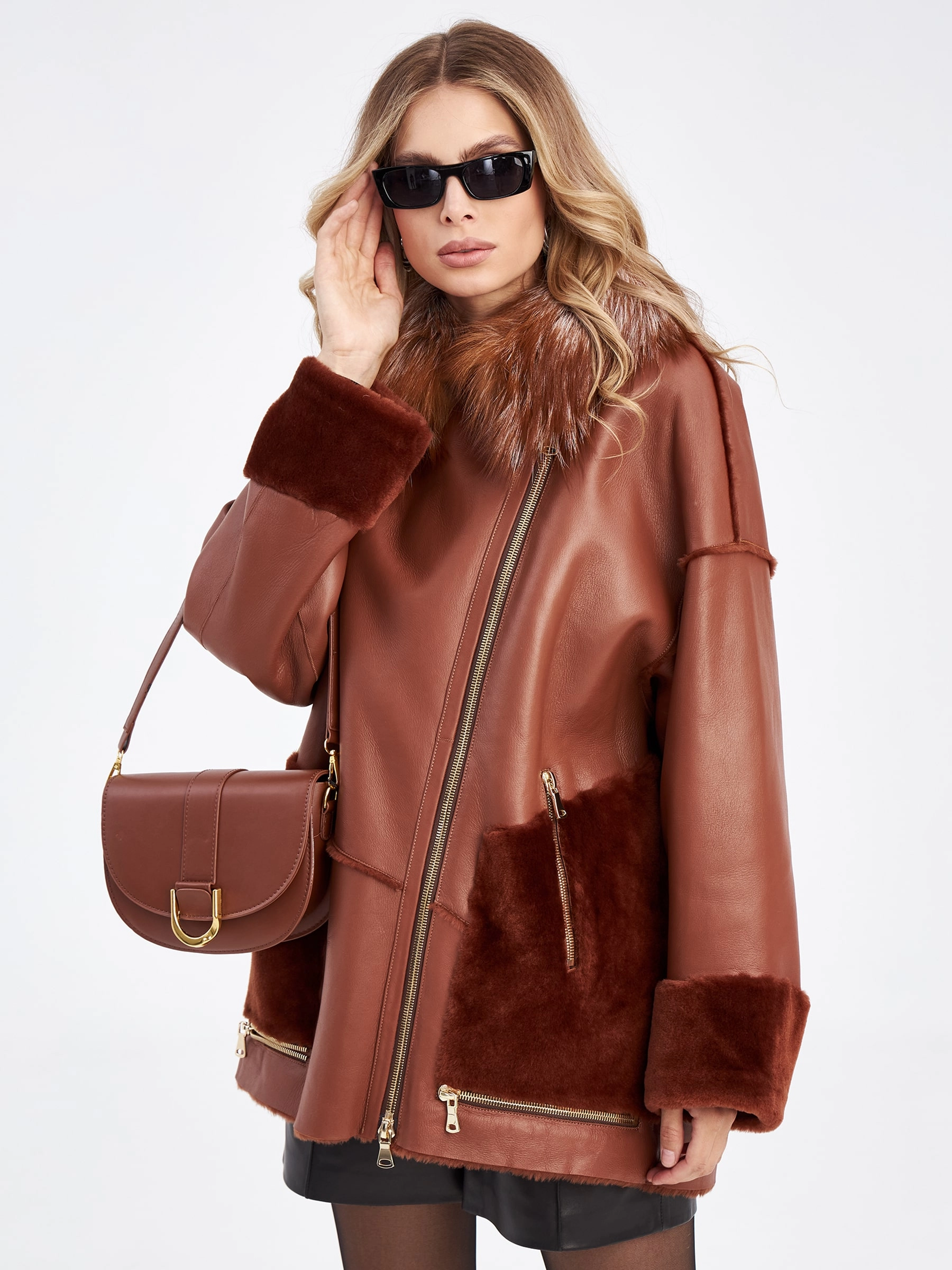 Короткая дубленка оверсайз с воротником лисицы премиум класса для женщин 2042, виски, размер 42, артикул 63190