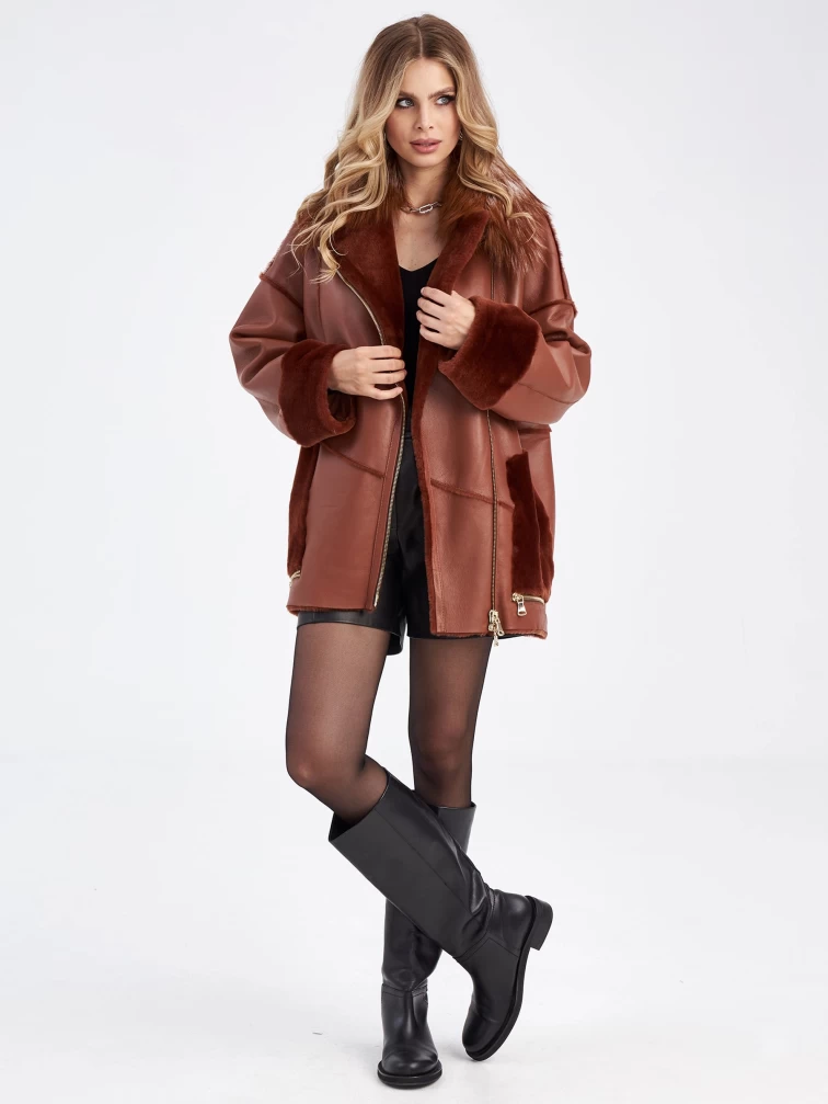 Эту комфортную дубленку мастера позаимствовали крой у косухи, сделав ее более элегантной, добавив воротник меха крашенной лисы. Модель из мягкой овчины в цвете виски. Густая изнаночная сторона хорошо сохраняет тепло, а гладкая лицевая защищает от ветра. Роль декора отдали крупным молниям серебристого оттенка.