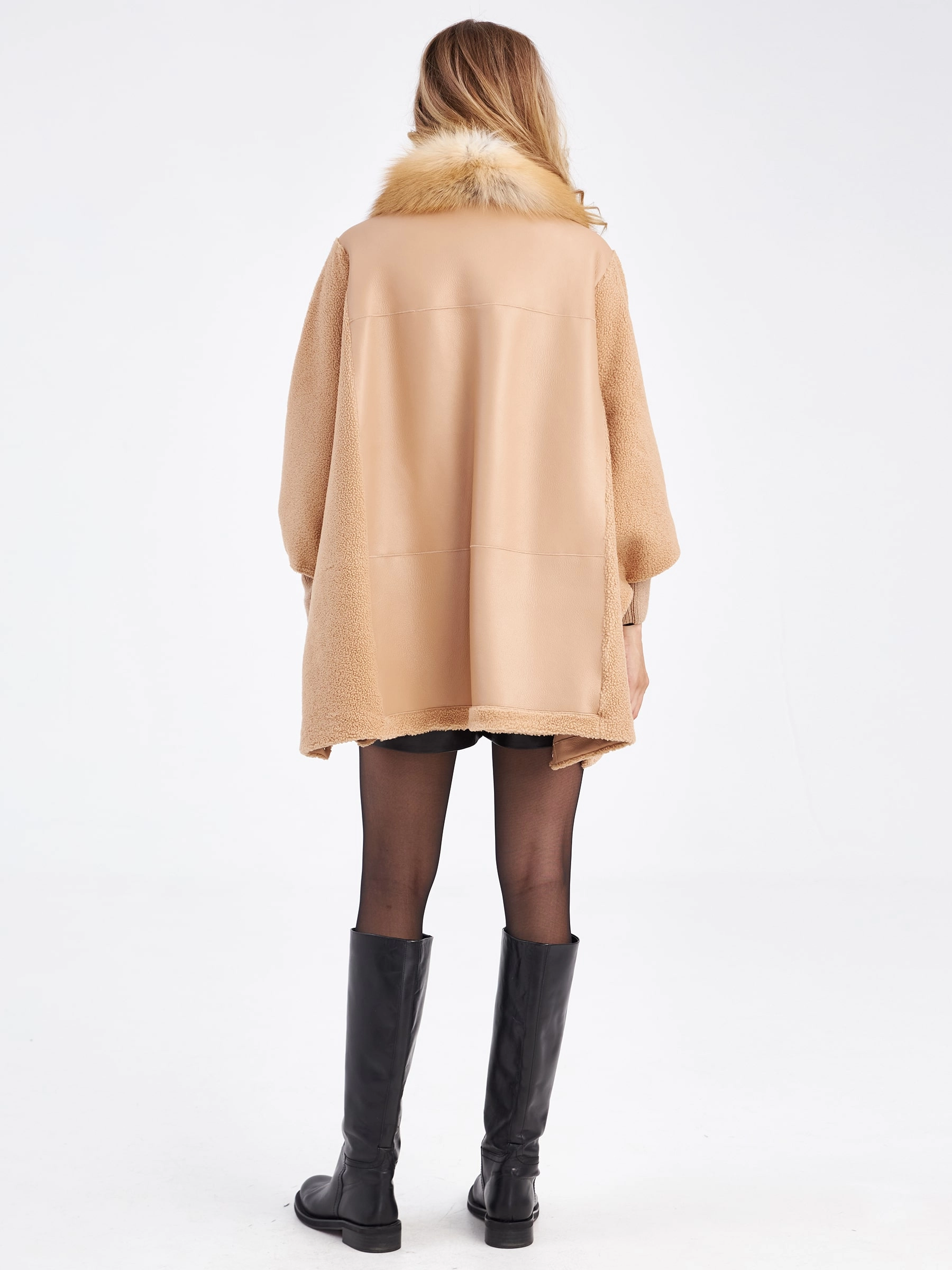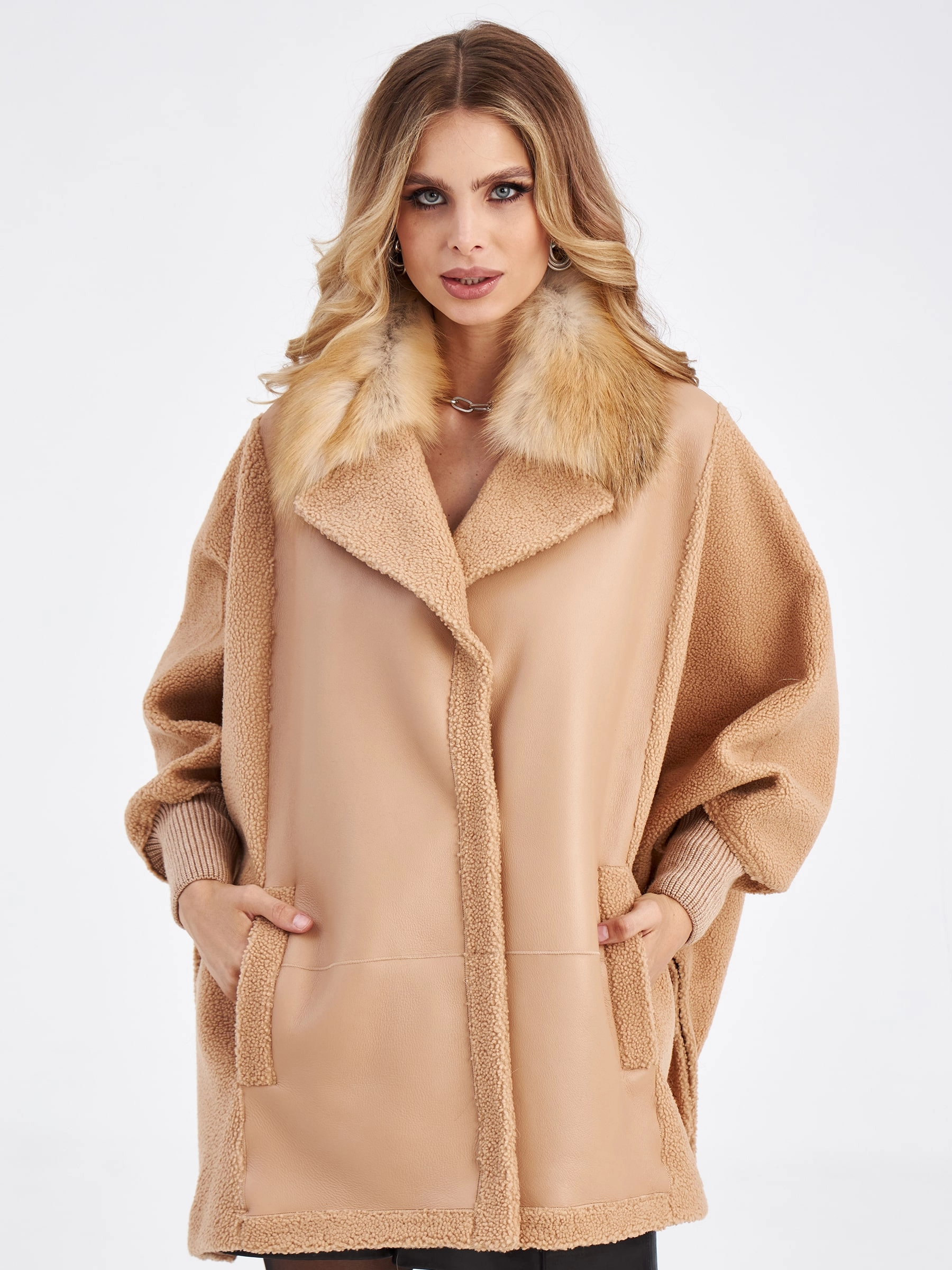 Товар короткая женская дубленка оверсайз с воротником лисицы премиум класса 2026, бежевая, размер 48, артикул 63100 выполнен из овчина "мерино" с застежкой кнопки. Рассчитан на сезон: осень-зима. Длина изделия 75-90 см, силуэт прямой.