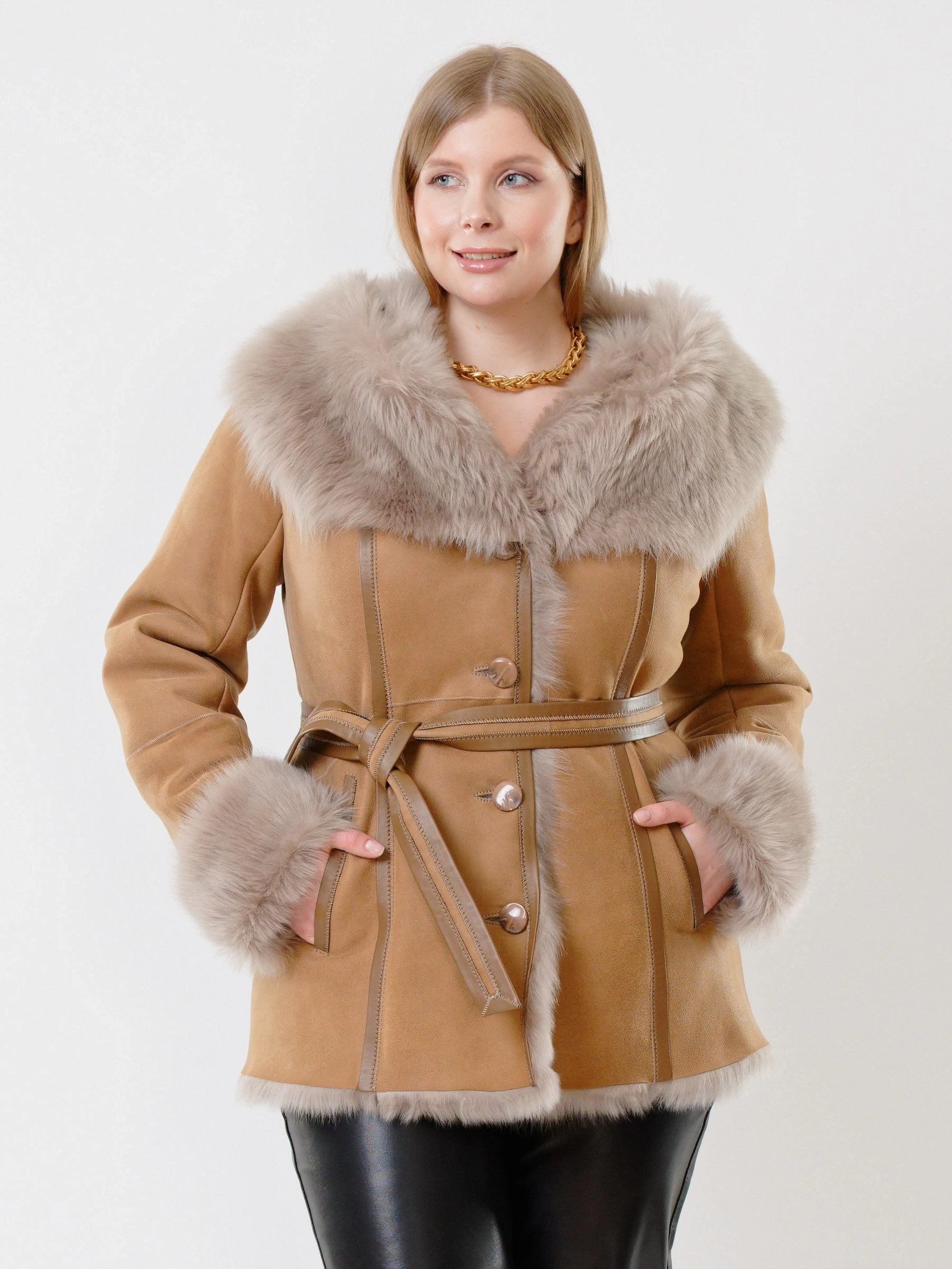 Короткая женская дубленка из тосканы с капюшоном 122, бежевая, размер 40, артикул 61400