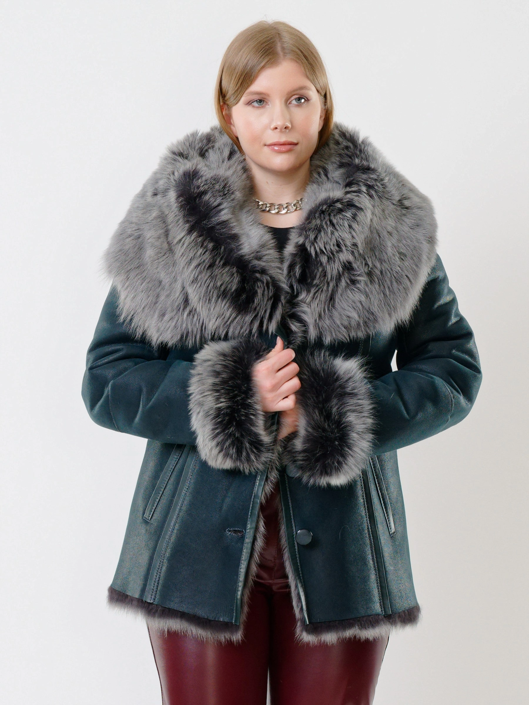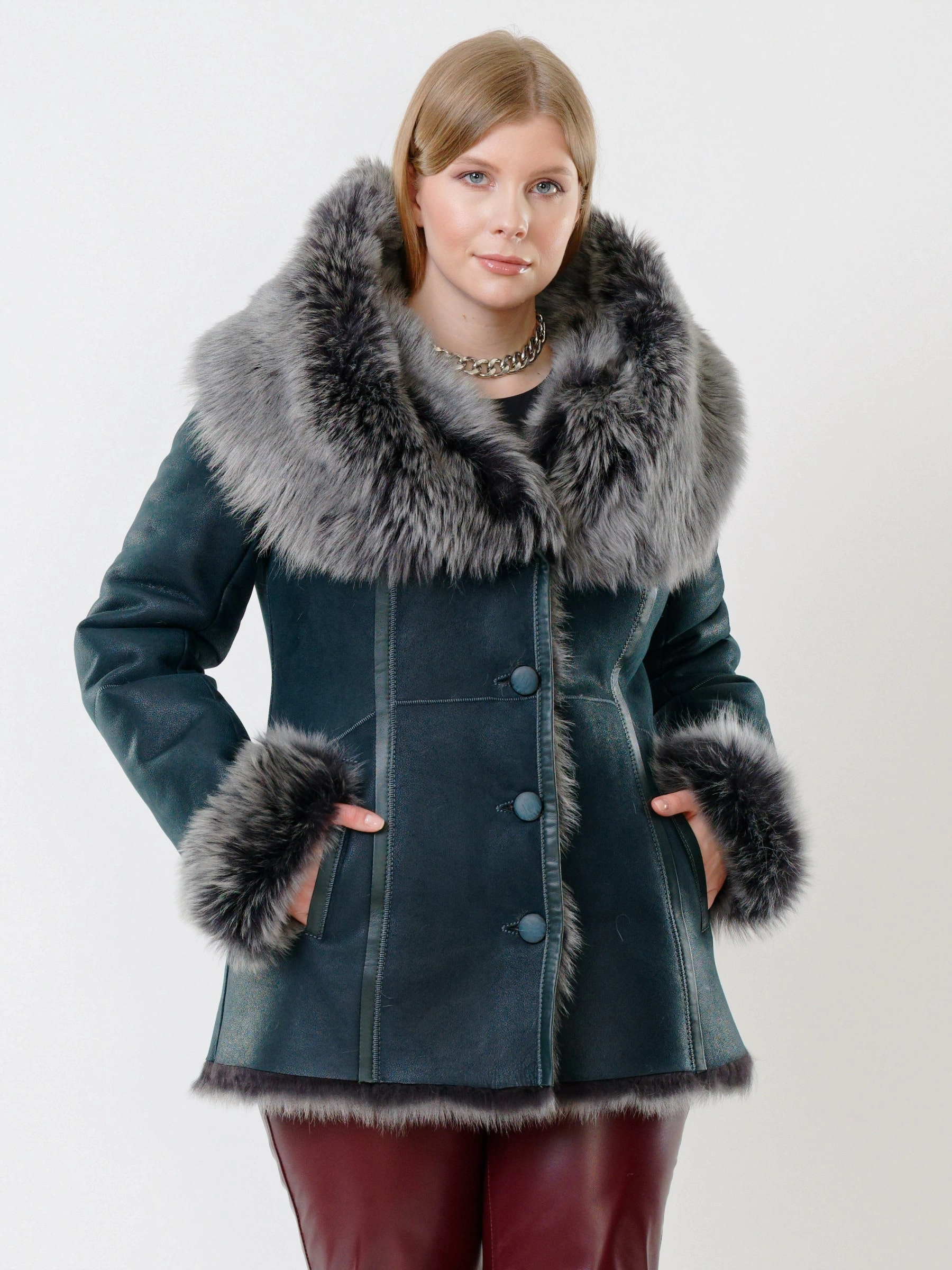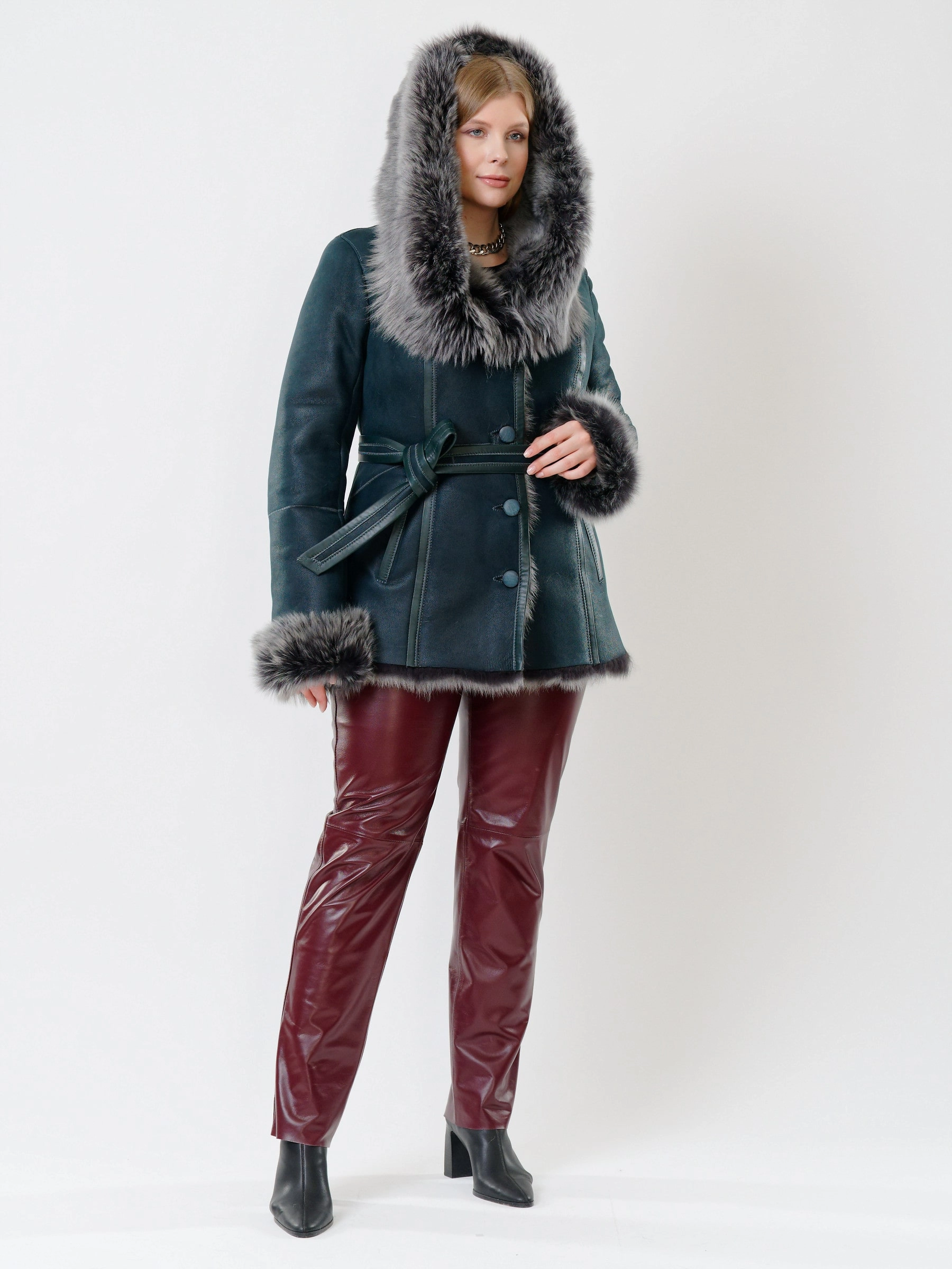 Идеальная полуприлегающая модель премиум-класса: невероятно густой мех тосканской овчины согреет в лютый мороз, а глубокий капюшон-трансформер эффектно завернёт вас в уют или элегантно ляжет шалью на плечи. Защитное покрытие убережёт от царапин, кожаная отделка карманов и борта добавит статусности, а регулируемые манжеты и боковые карманы обеспечат комфорт. Идеальная посадка по фигуре, продуманные швы и длинный пояс подчеркнут силуэт — сочетайте с джинсами, объёмными свитерами или тёмными платьями для дерзкого зимнего образа! Преимущество: короткая длина, полуприлегающий крой - это мобильность для города и элегантность для вечера.