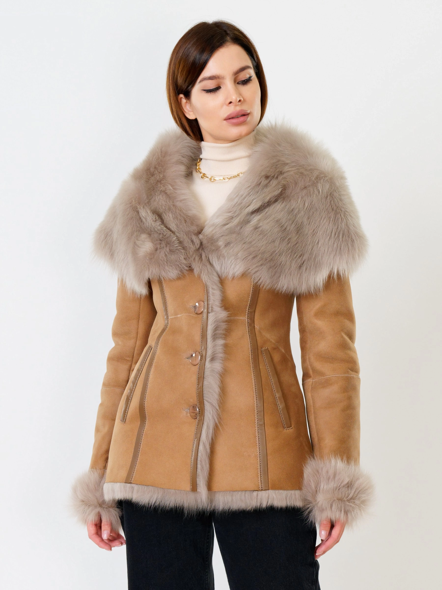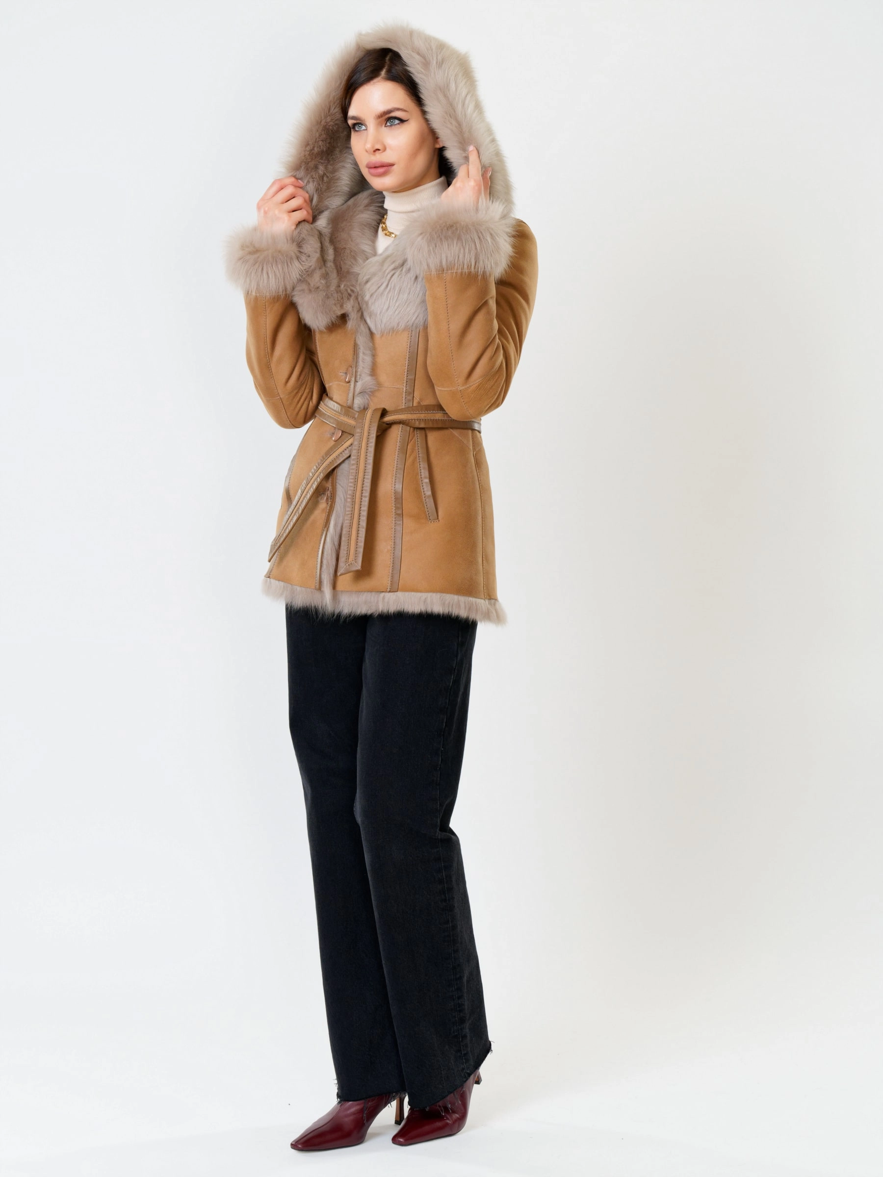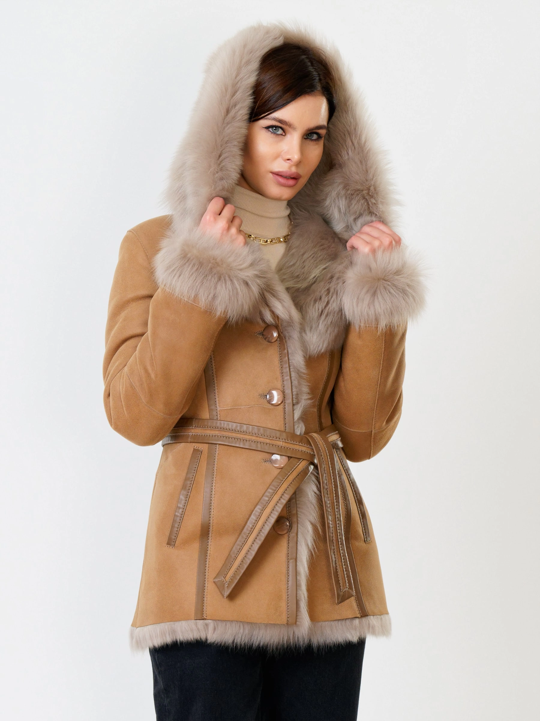 Идеальная полуприлегающая модель премиум-класса: невероятно густой мех тосканской овчины согреет в лютый мороз, а глубокий капюшон-трансформер эффектно завернёт вас в уют или элегантно ляжет шалью на плечи. Защитное покрытие убережёт от царапин, кожаная отделка карманов и борта добавит статусности, а регулируемые манжеты и боковые карманы обеспечат комфорт. Идеальная посадка по фигуре, продуманные швы и длинный пояс подчеркнут силуэт — сочетайте с джинсами, объёмными свитерами или тёмными платьями для дерзкого зимнего образа! Преимущество: короткая длина, полуприлегающий крой - это мобильность для города и элегантность для вечера.