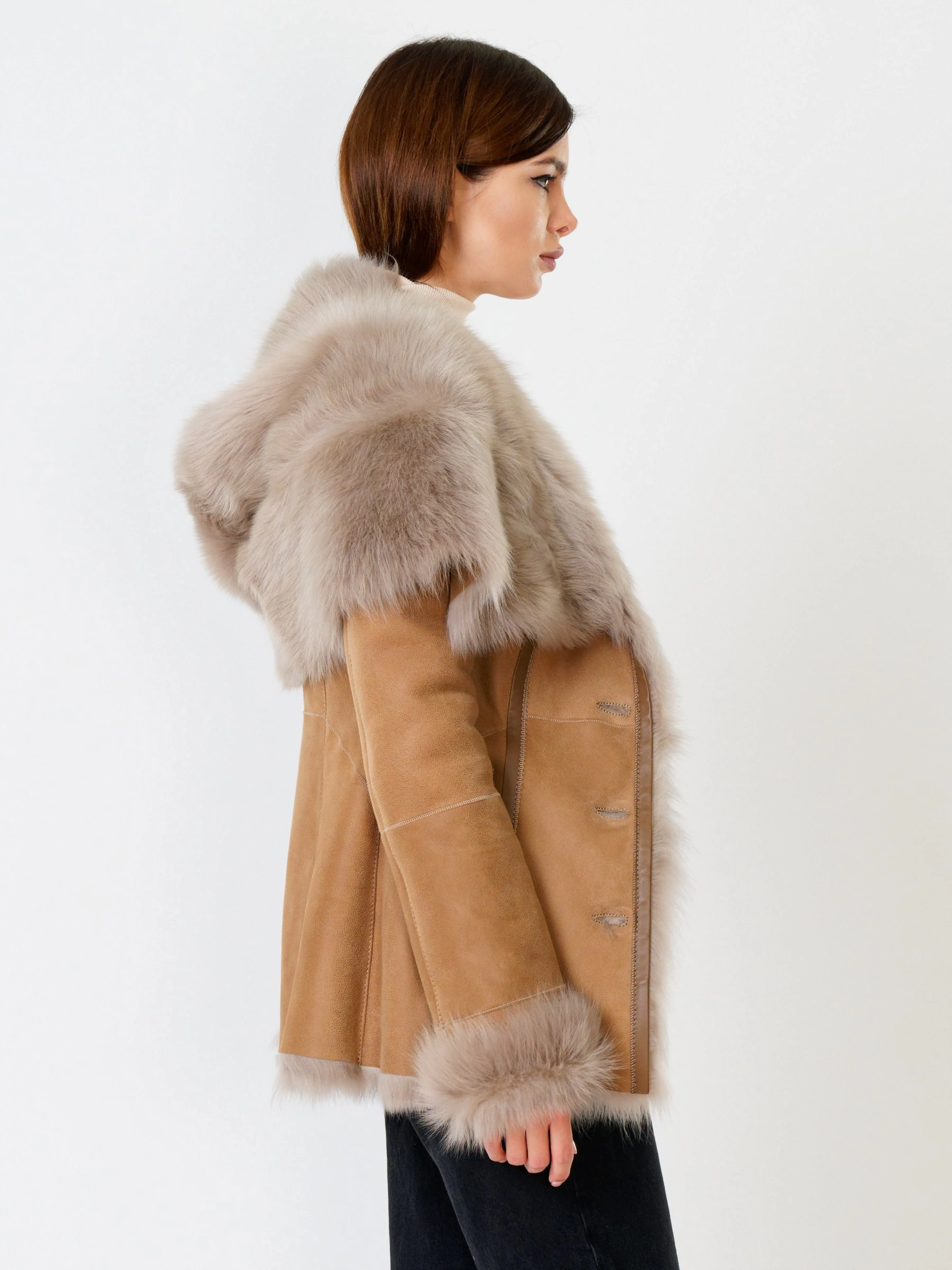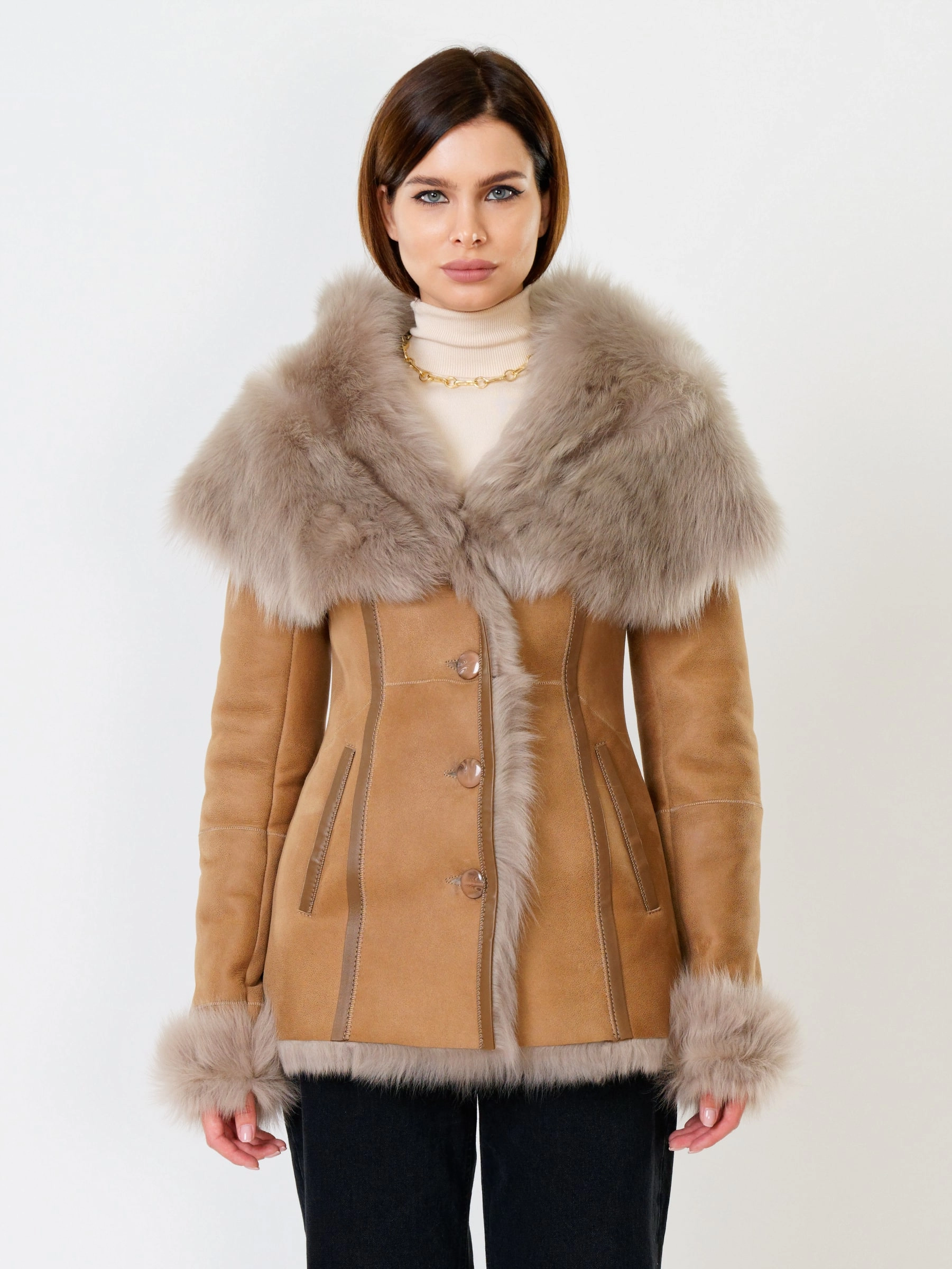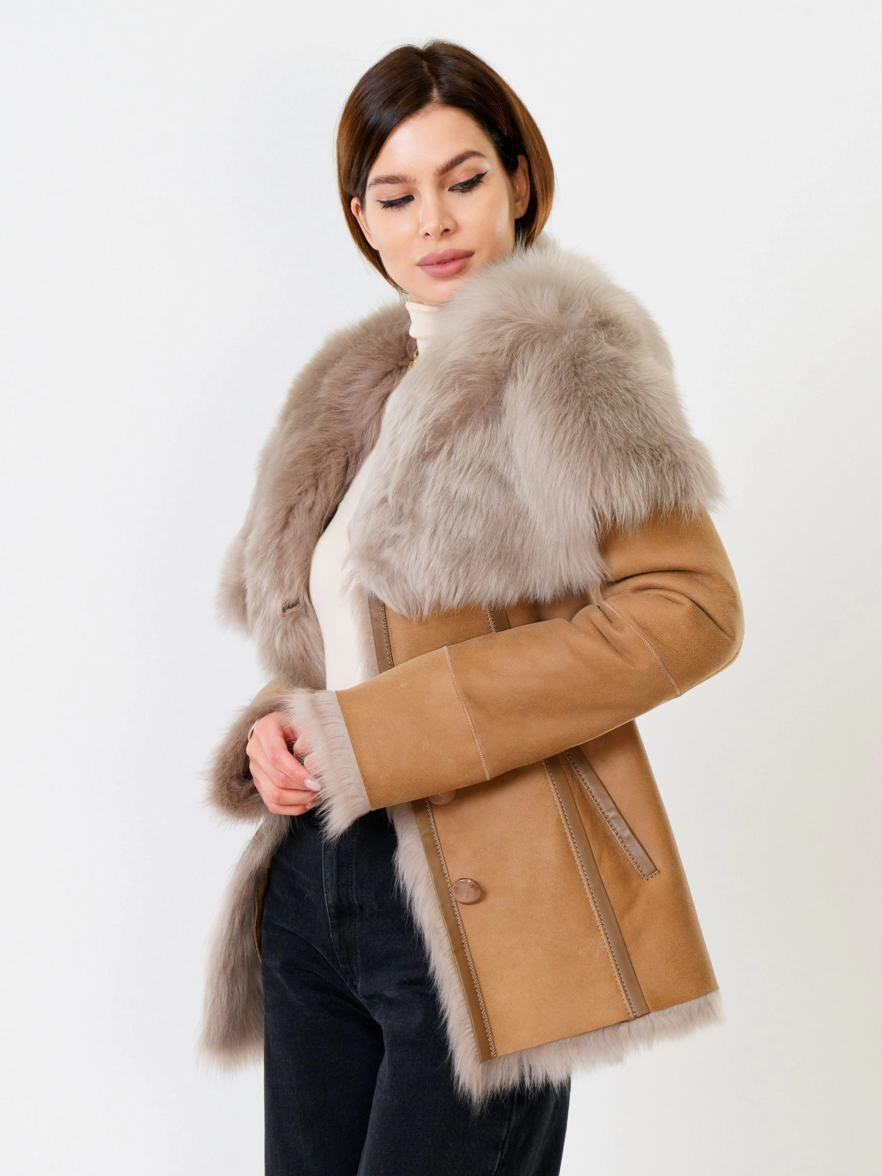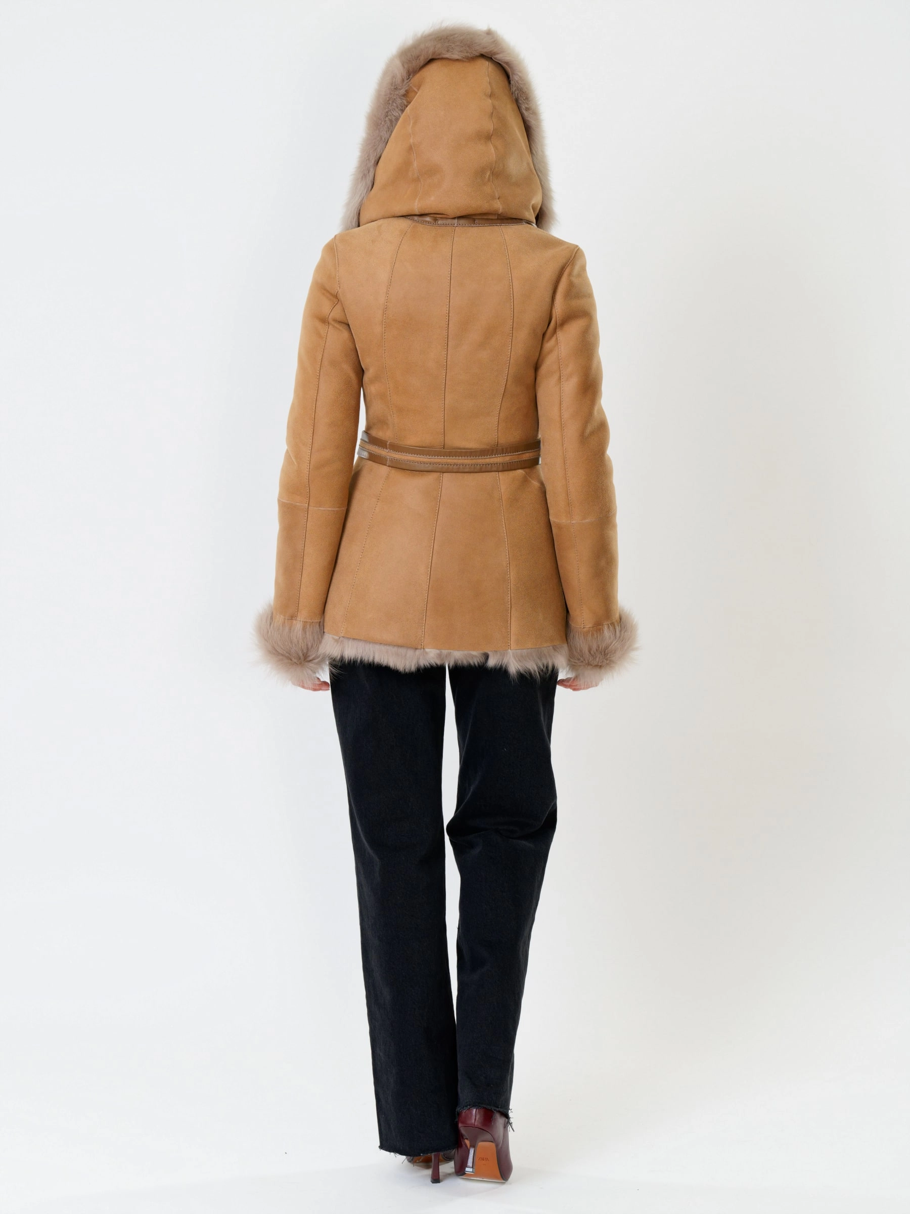 Идеальная полуприлегающая модель премиум-класса: невероятно густой мех тосканской овчины согреет в лютый мороз, а глубокий капюшон-трансформер эффектно завернёт вас в уют или элегантно ляжет шалью на плечи. Защитное покрытие убережёт от царапин, кожаная отделка карманов и борта добавит статусности, а регулируемые манжеты и боковые карманы обеспечат комфорт. Идеальная посадка по фигуре, продуманные швы и длинный пояс подчеркнут силуэт — сочетайте с джинсами, объёмными свитерами или тёмными платьями для дерзкого зимнего образа! Преимущество: короткая длина, полуприлегающий крой - это мобильность для города и элегантность для вечера.