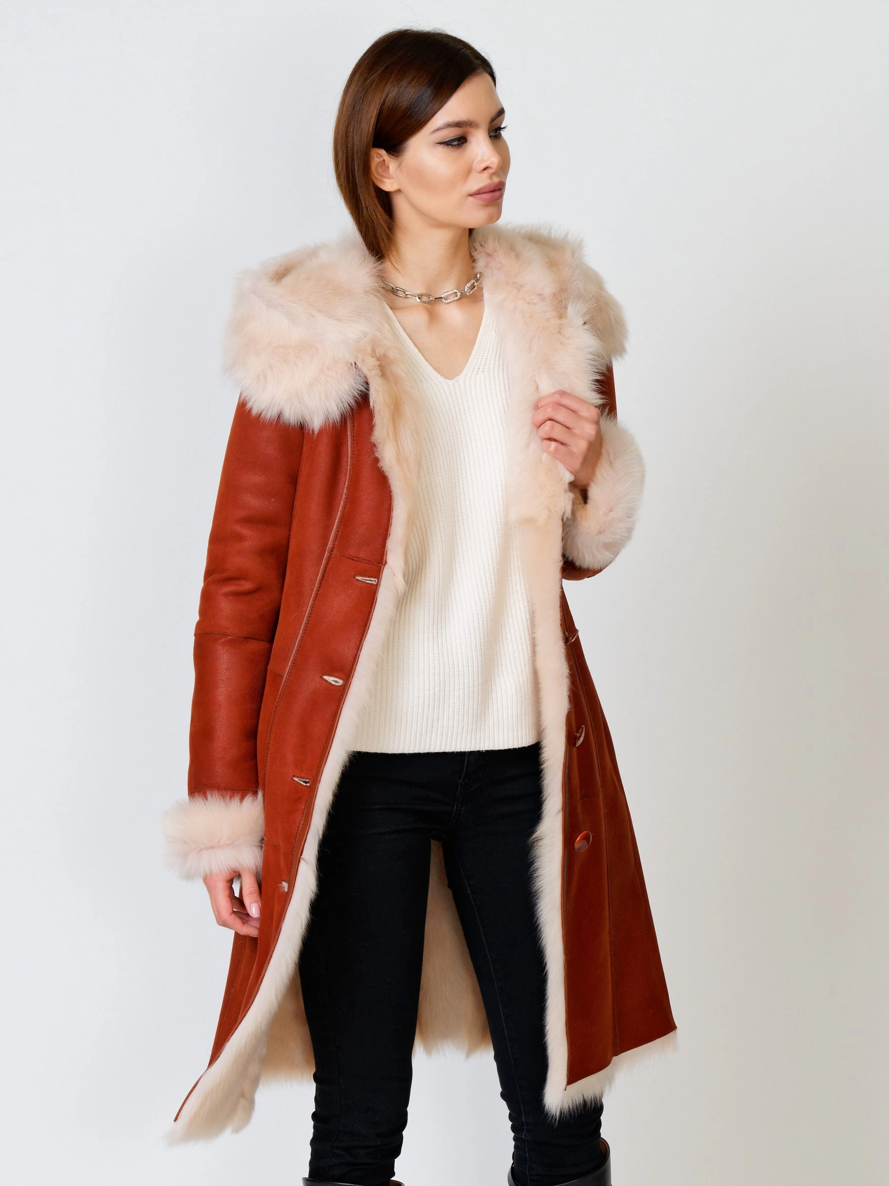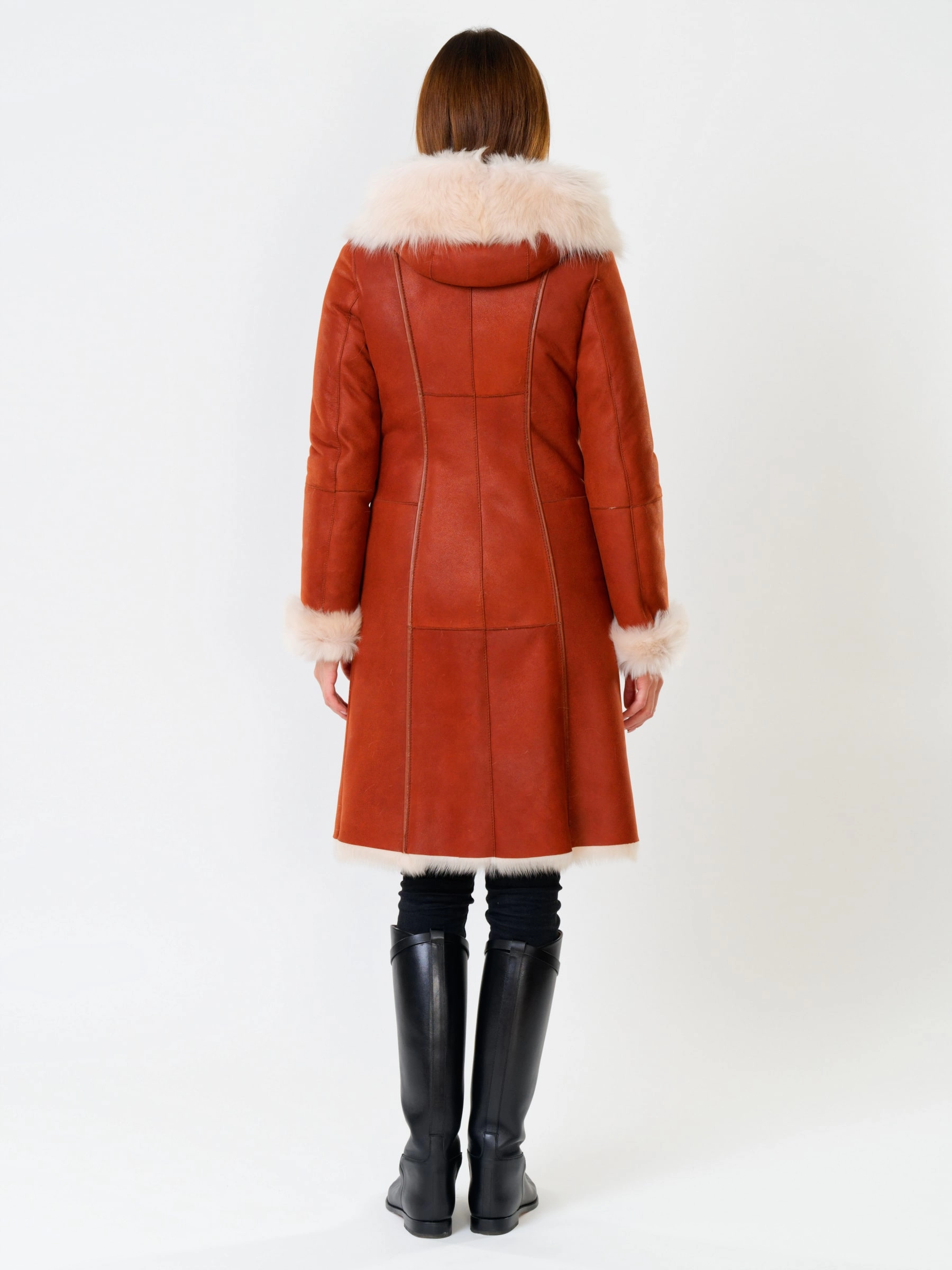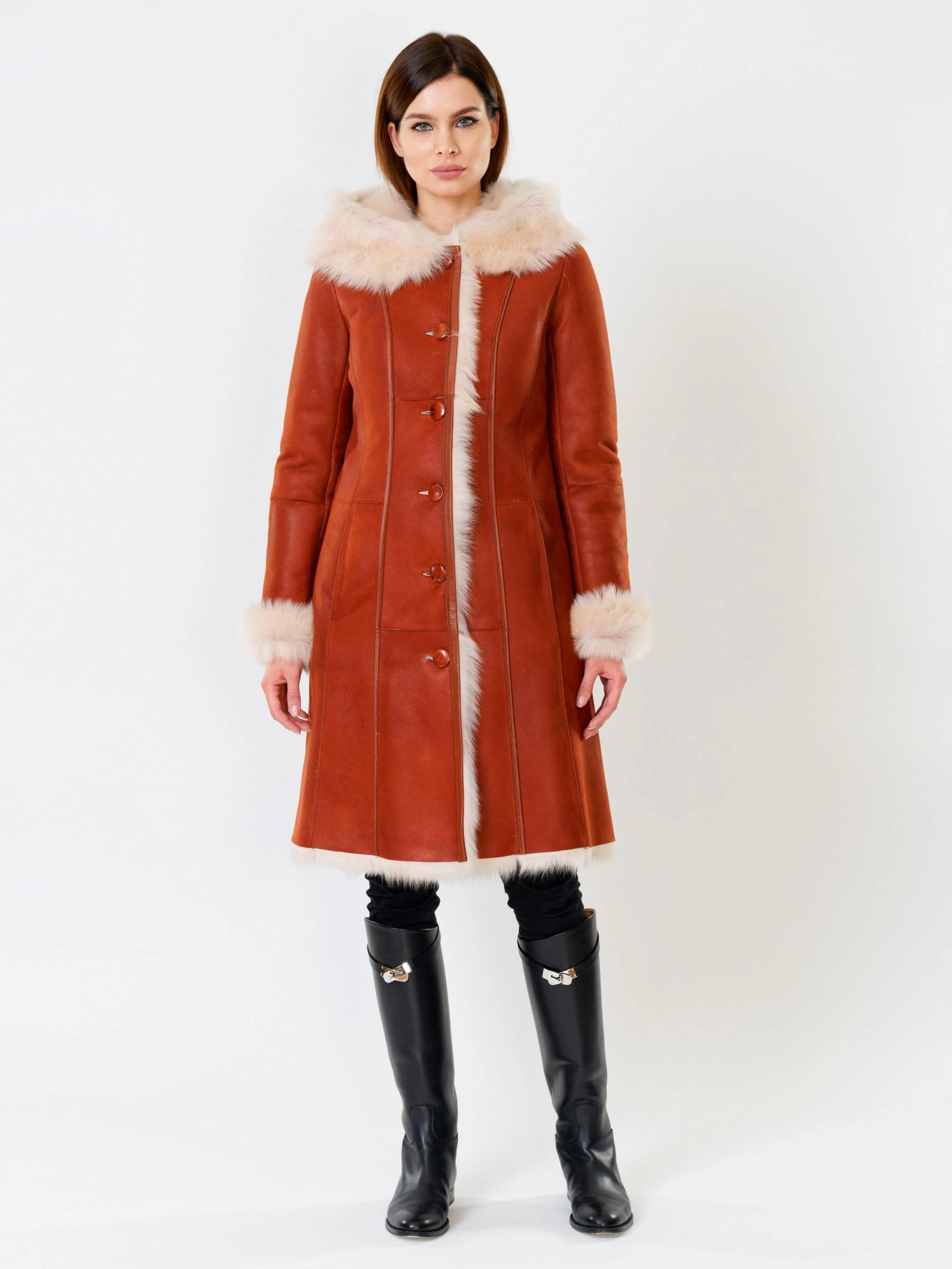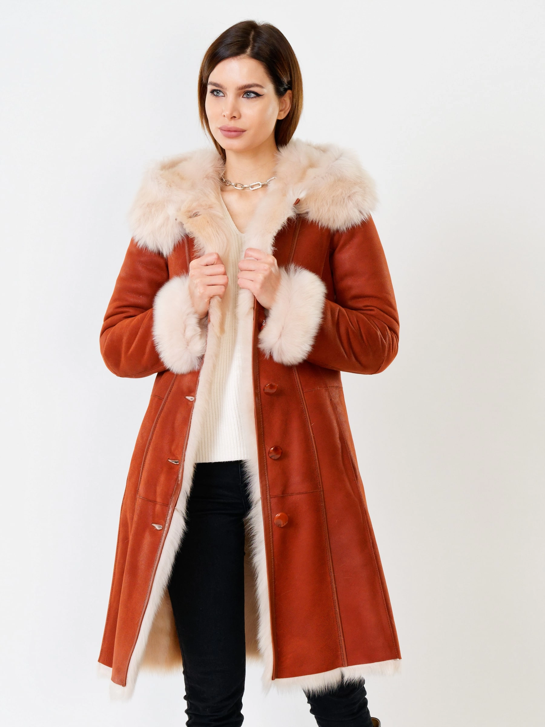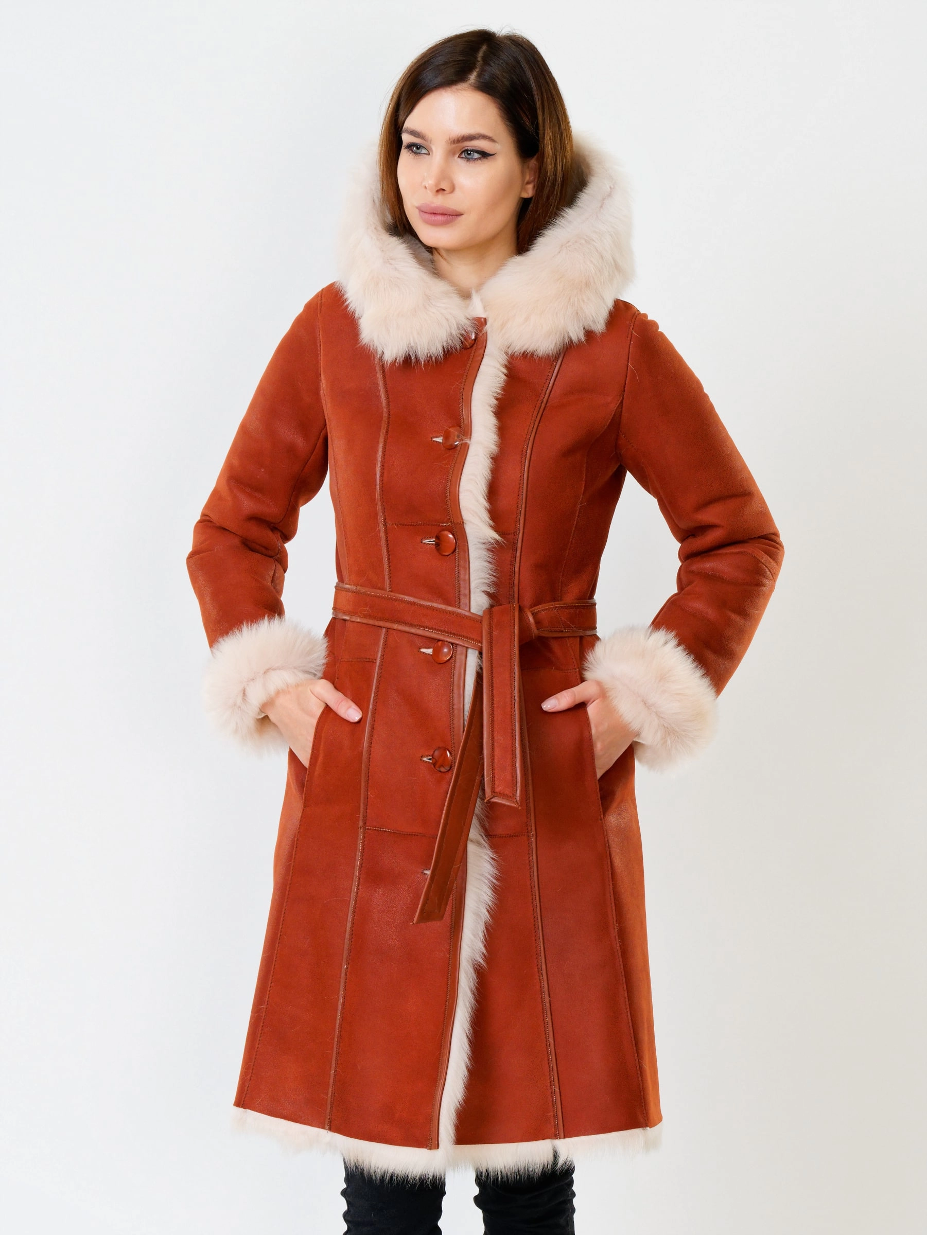 Длинная дублёнка с капюшоном из тосканской овчины. Роскошная полуприлегающая модель премиум-класса: густой нежнейший мех глубокого оттенк подарит королевское тепло даже в лютый мороз, а объёмный капюшон создаст уютный кокон от непогоды или элегантно ниспадет на плечи. Защитное покрытие убережёт от царапин, а идеальная посадка по фигуре, боковые карманы и длинный пояс подчеркнут силуэт — сочетайте с чёрными джинсами, вязаными платьями или кожаными брюками для безупречного зимнего образа! Преимущество: короткая длина, полуприлегающий крой - это мобильность для города и элегантность для вечера.