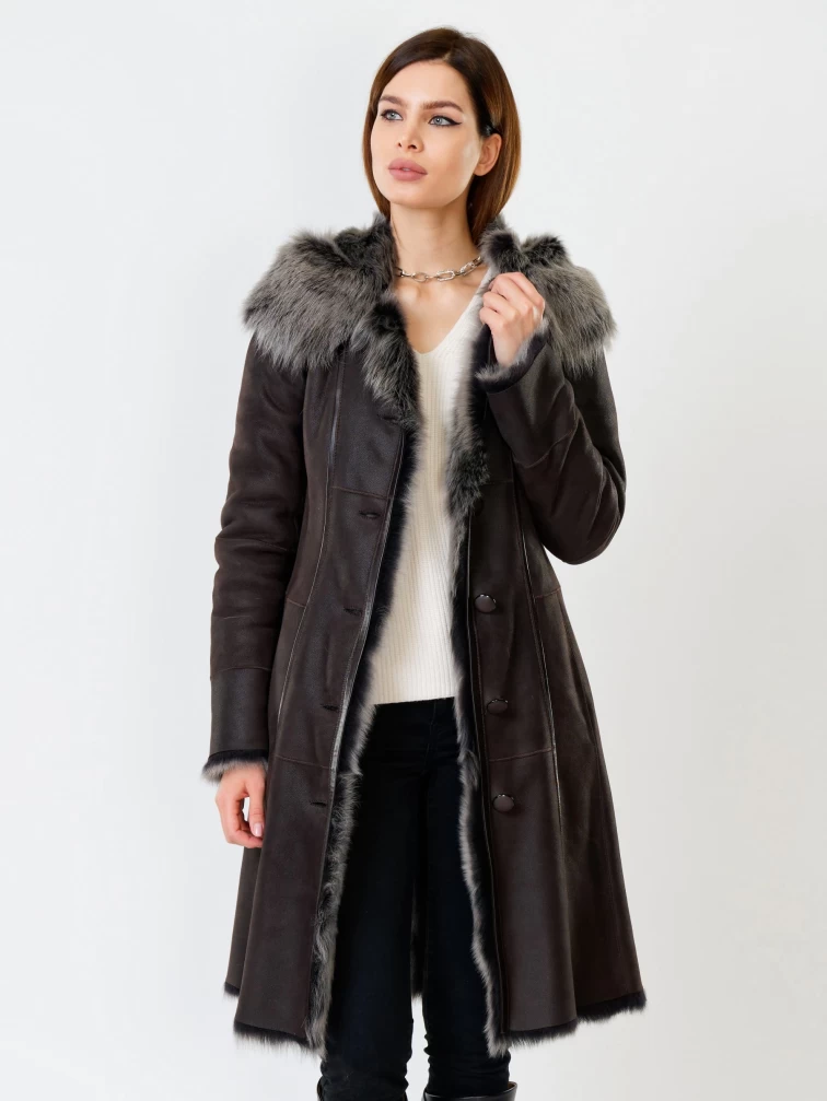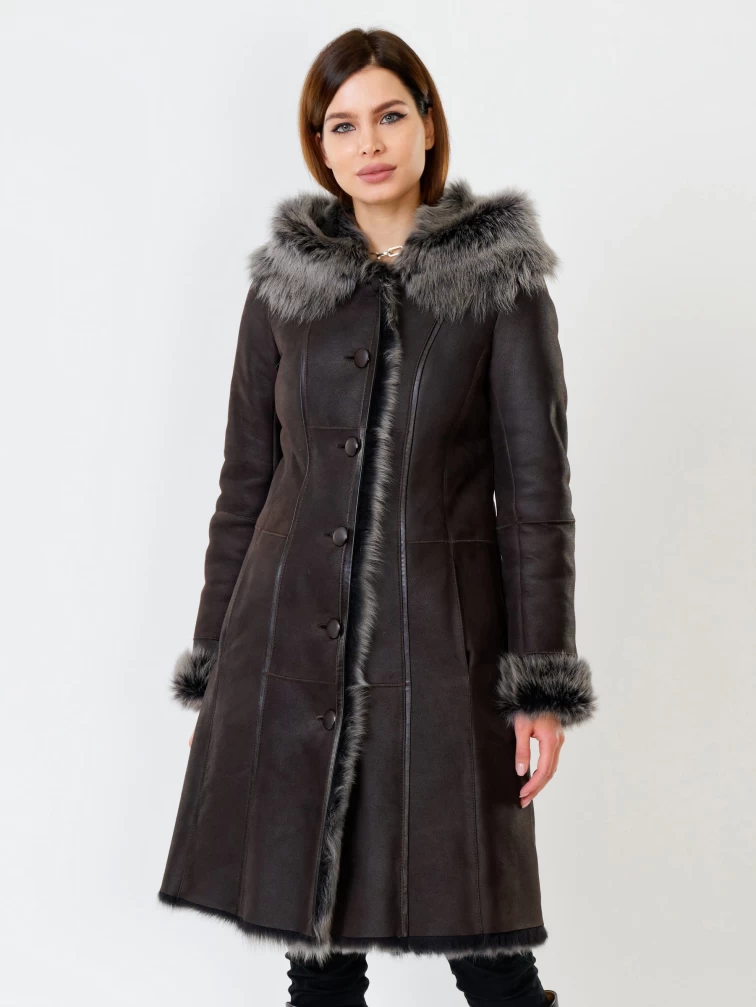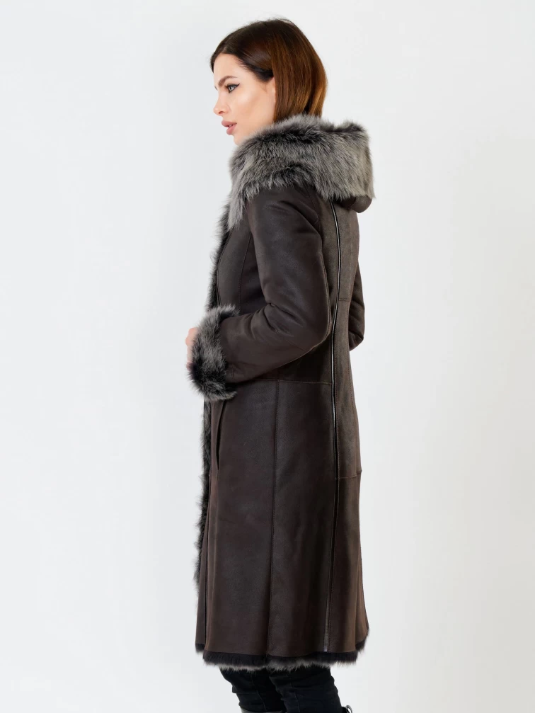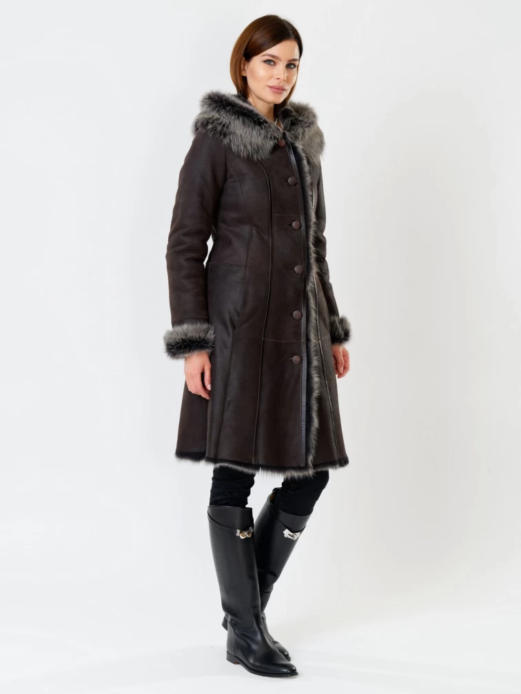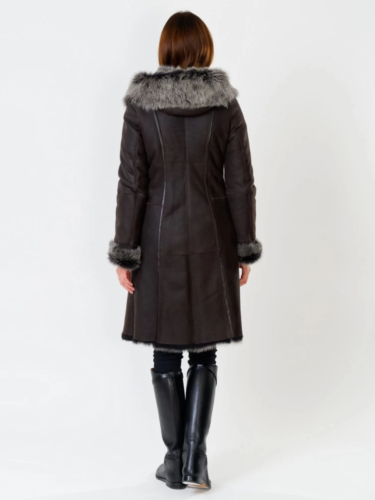 Длинная дублёнка с капюшоном из тосканской овчины. Роскошная полуприлегающая модель премиум-класса: густой нежнейший мех глубокого оттенк подарит королевское тепло даже в лютый мороз, а объёмный капюшон создаст уютный кокон от непогоды или элегантно ниспадет на плечи. Защитное покрытие убережёт от царапин, а идеальная посадка по фигуре, боковые карманы и длинный пояс подчеркнут силуэт — сочетайте с чёрными джинсами, вязаными платьями или кожаными брюками для безупречного зимнего образа! Преимущество: короткая длина, полуприлегающий крой - это мобильность для города и элегантность для вечера.
