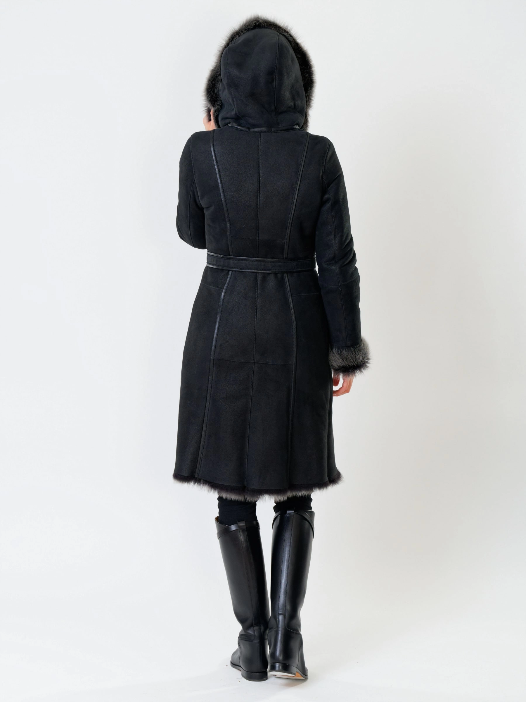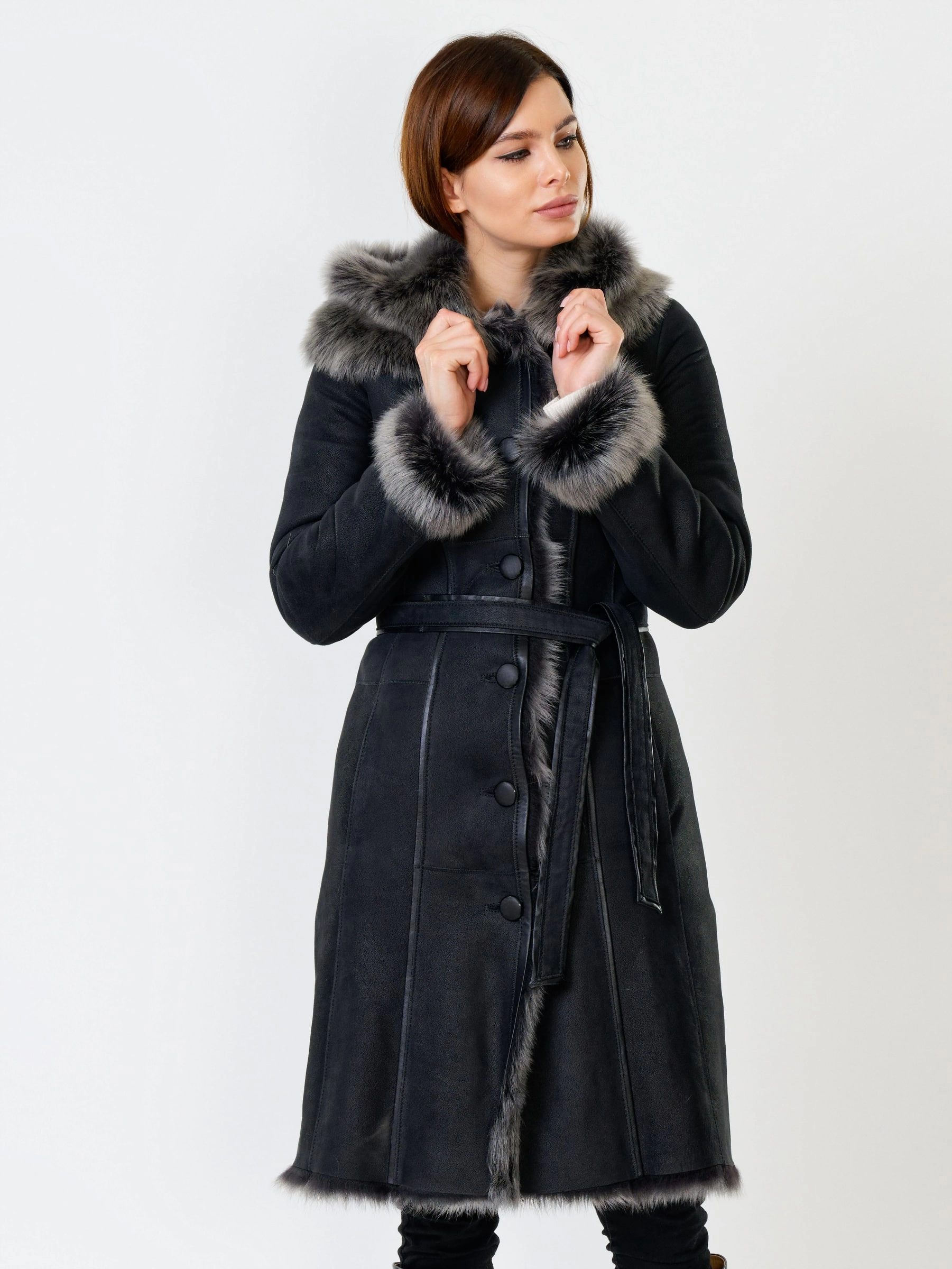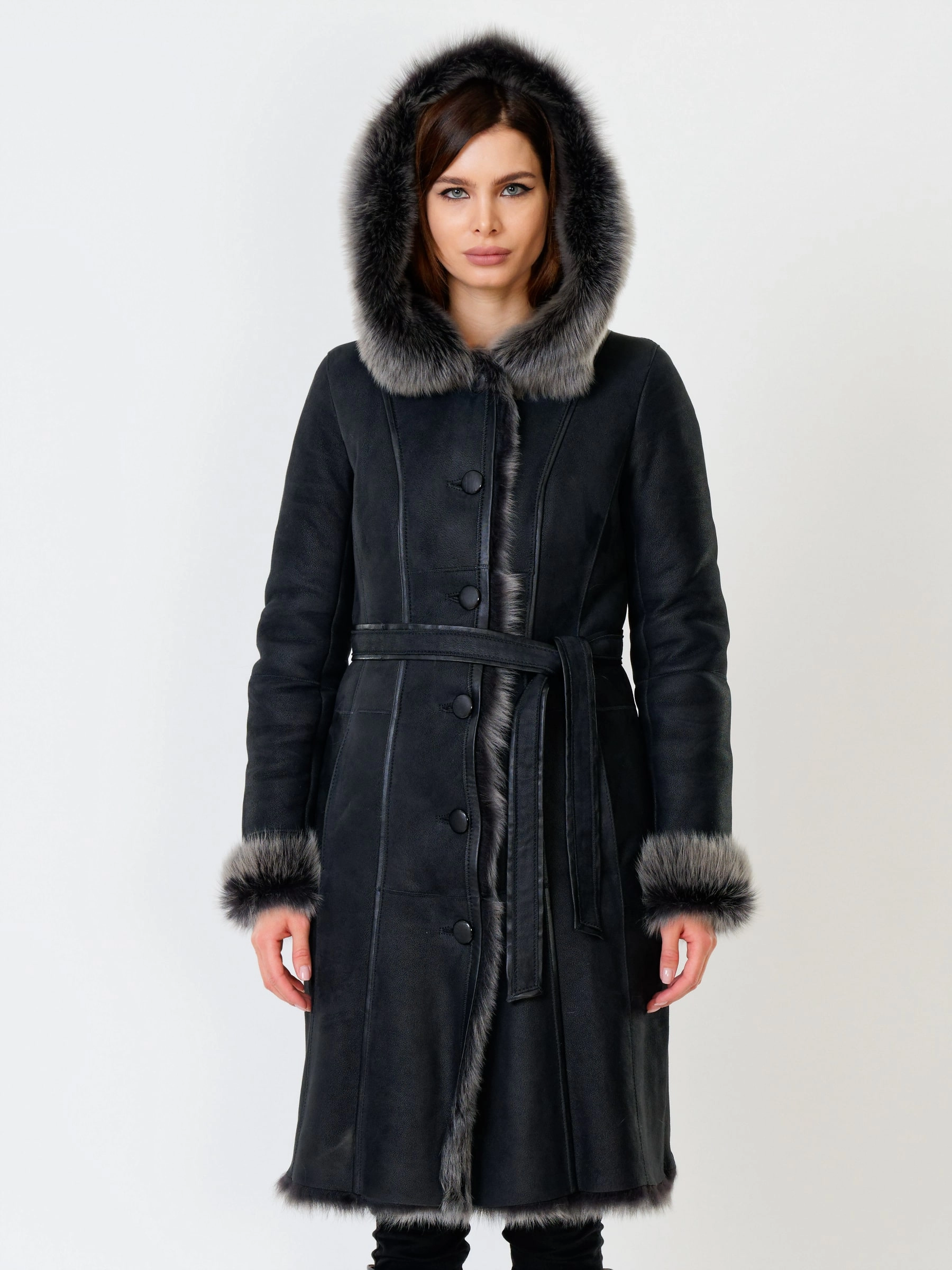 Длинная дублёнка с капюшоном из тосканской овчины. Роскошная полуприлегающая модель премиум-класса: густой нежнейший мех глубокого оттенк подарит королевское тепло даже в лютый мороз, а объёмный капюшон создаст уютный кокон от непогоды или элегантно ниспадет на плечи. Защитное покрытие убережёт от царапин, а идеальная посадка по фигуре, боковые карманы и длинный пояс подчеркнут силуэт — сочетайте с чёрными джинсами, вязаными платьями или кожаными брюками для безупречного зимнего образа! Преимущество: короткая длина, полуприлегающий крой - это мобильность для города и элегантность для вечера.
