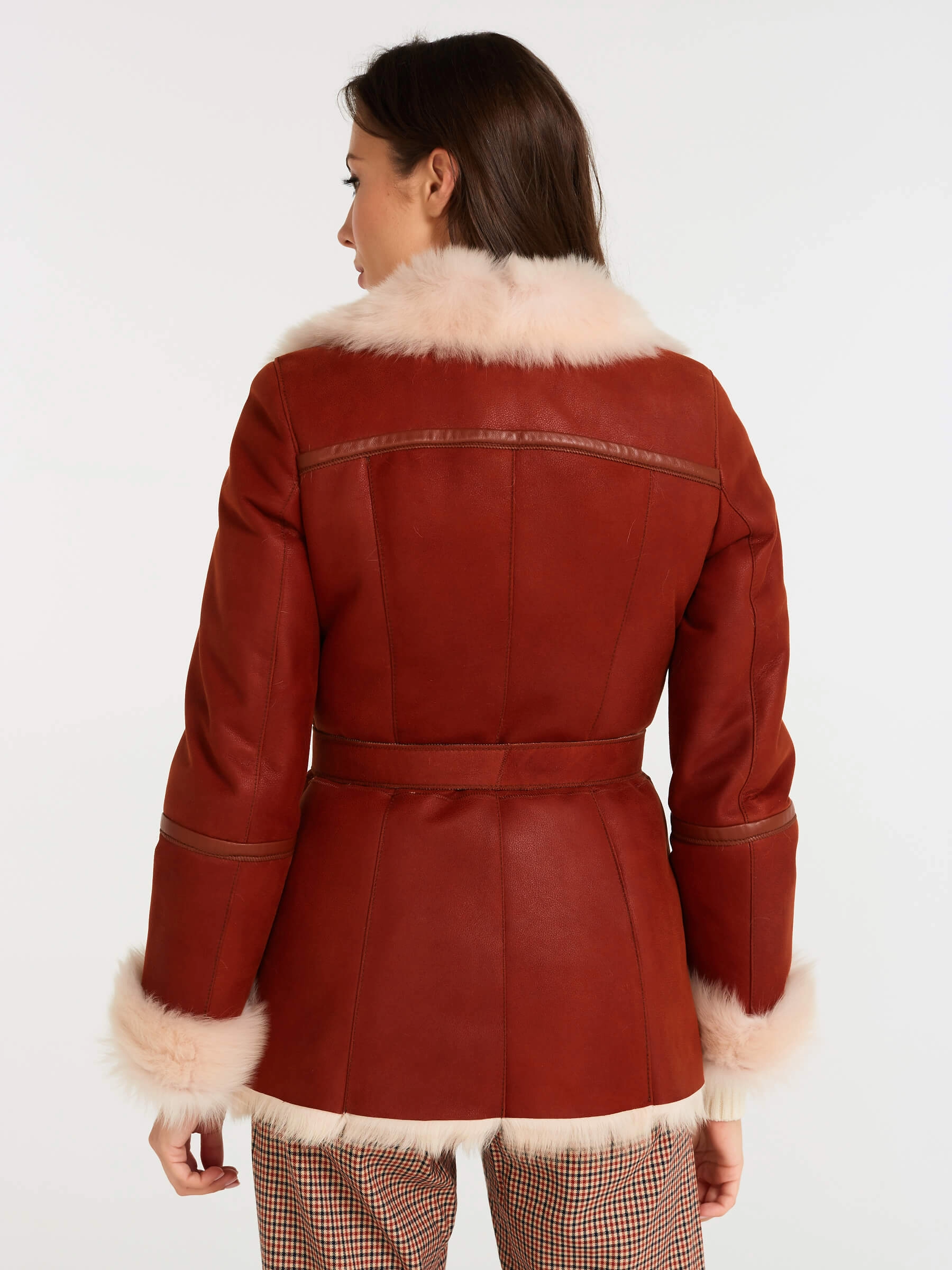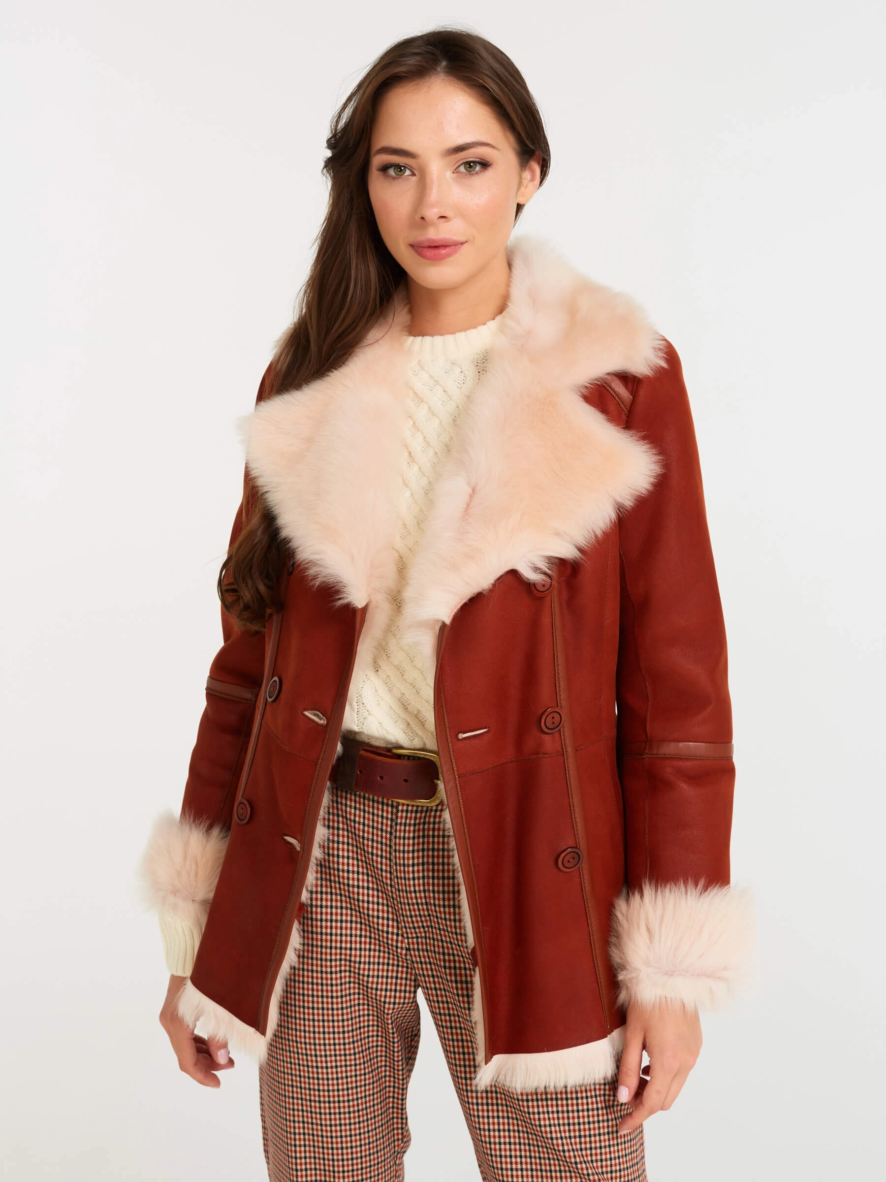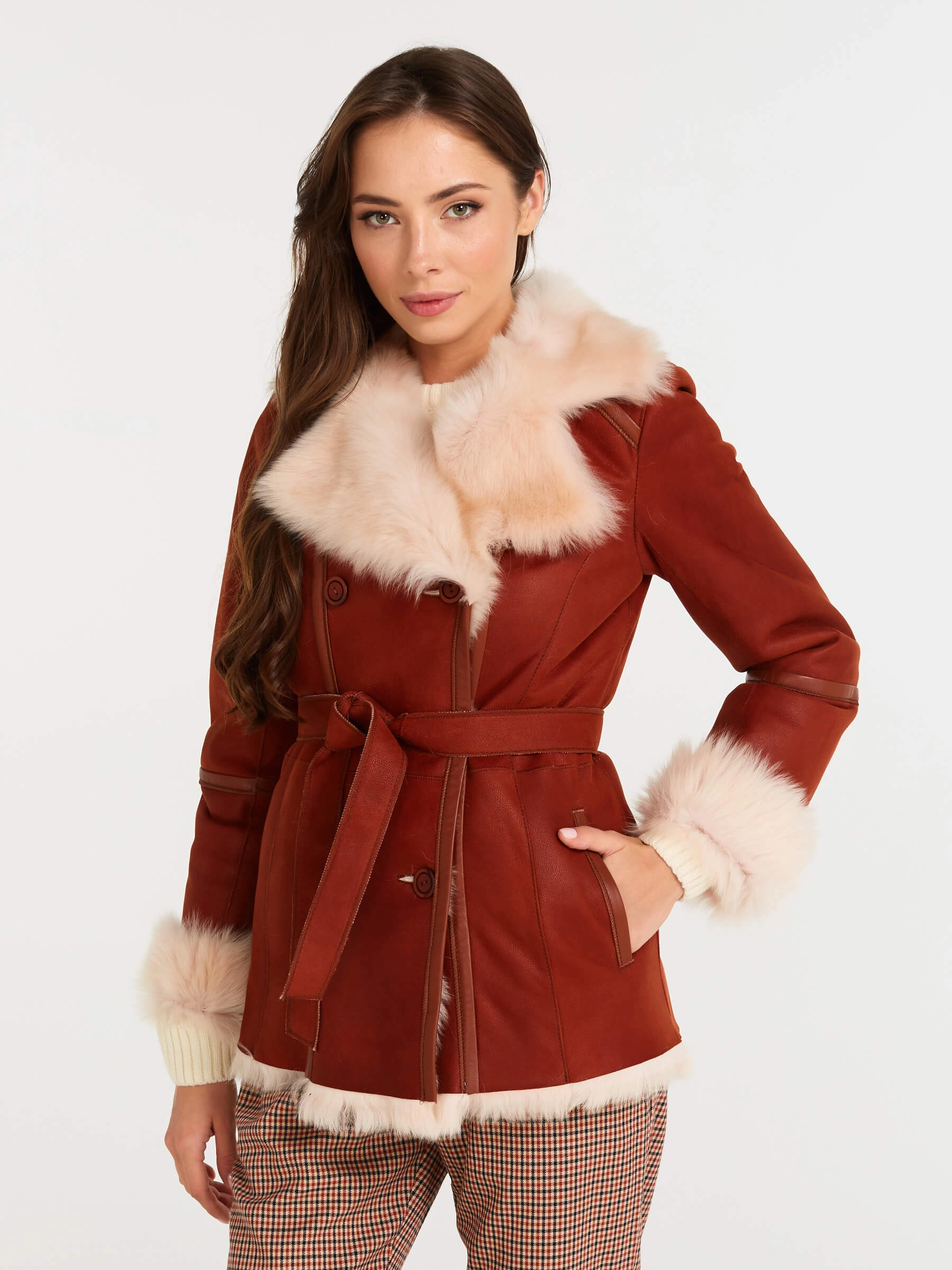 Двубортная короткая женская дубленка из овчины "Тоскана" на пуговицах, в цвете "виски", с английским воротником, полуприлегающим силуэтом, двумя врезными карманами, длинным поясом и регулируемыми манжетами, сочетает премиальное качество и комфорт; носите ее с джинсами и водолазкой, элегантными брюками и свитером, юбкой-миди и сапогами или поверх брючного костюма, дополняя объемным шарфом и стильной сумкой.