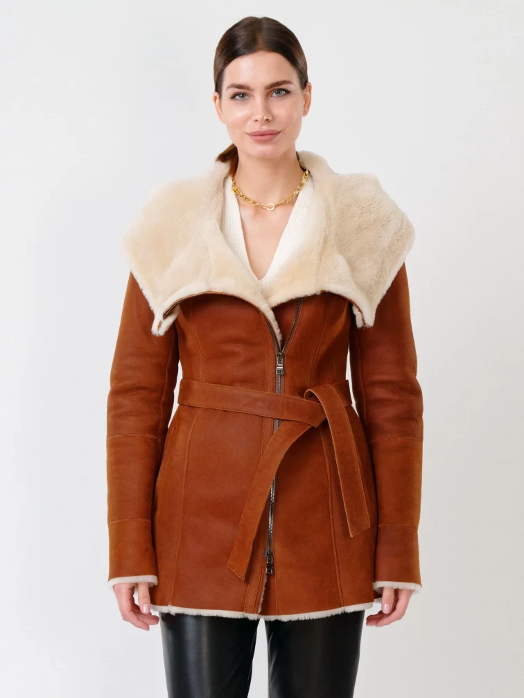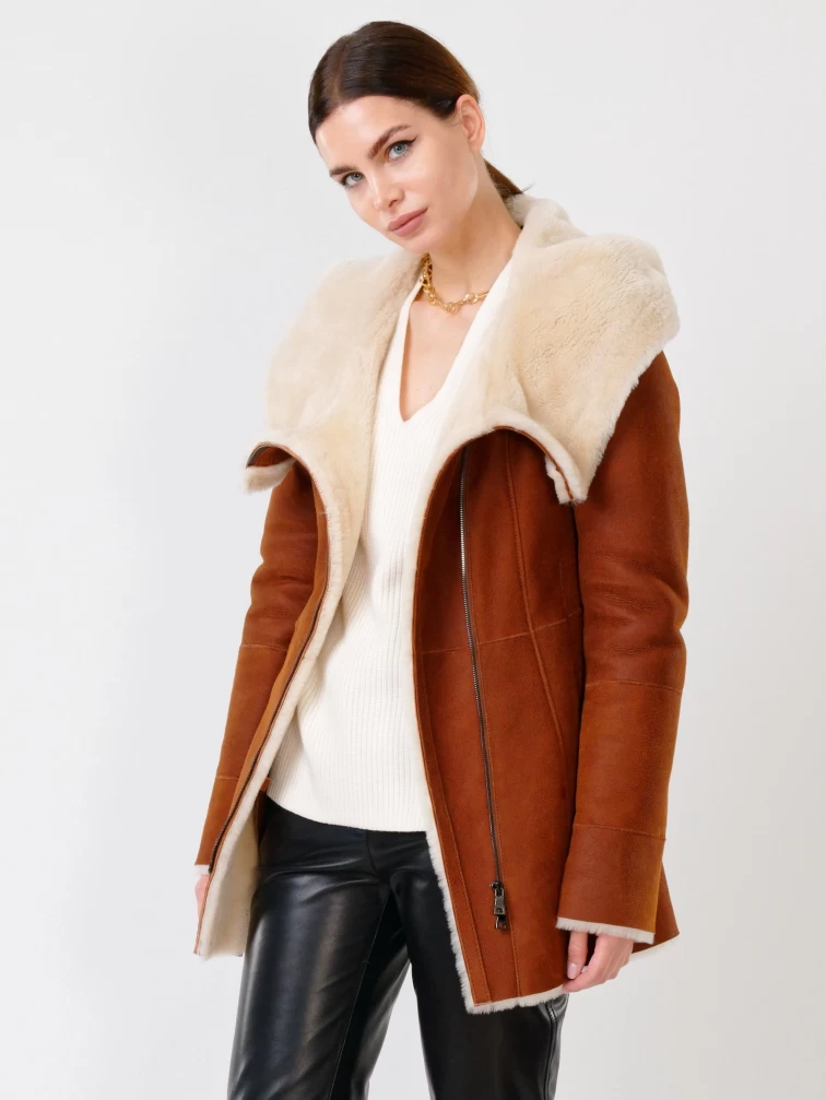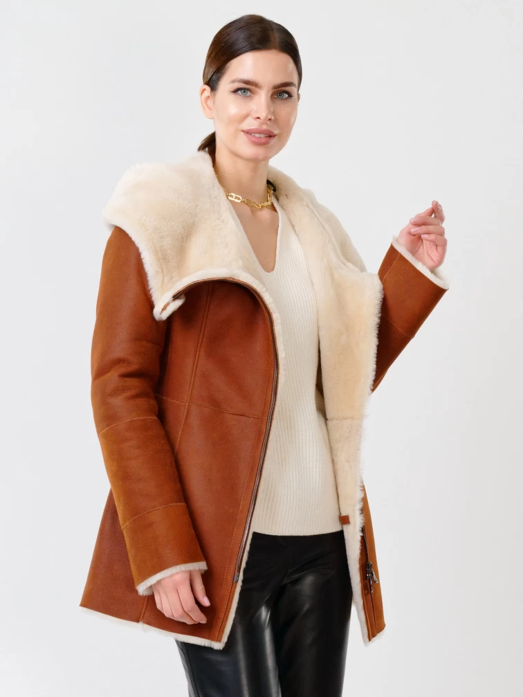 Товар короткая женская дубленка косуха с капюшоном 200, табачно-рыжая, размер 44, артикул 61701 выполнен из овчина "мерино" с застежкой молния. Рассчитан на сезон: осень-зима. Длина изделия 75 см, силуэт полуприлегающий.