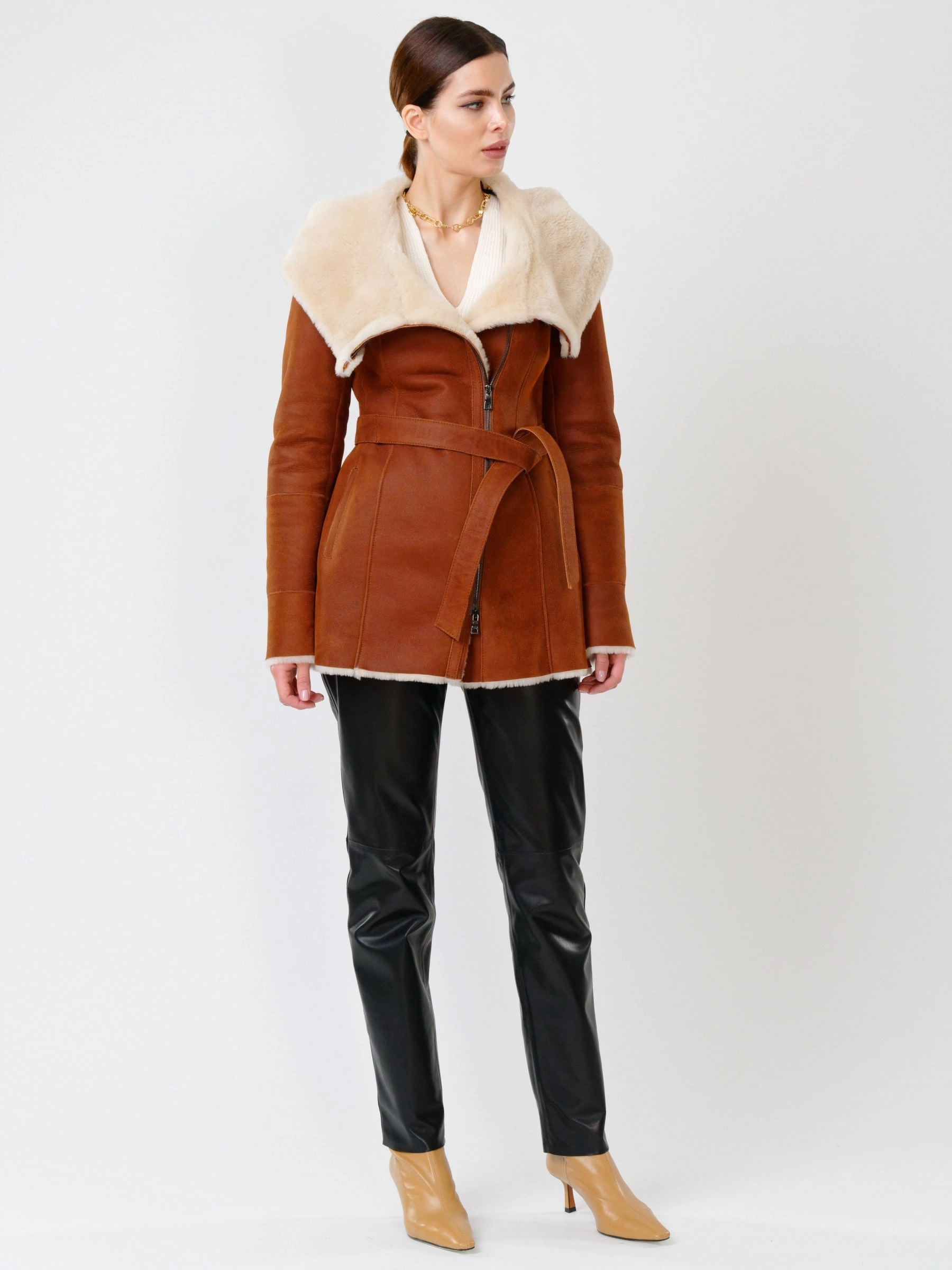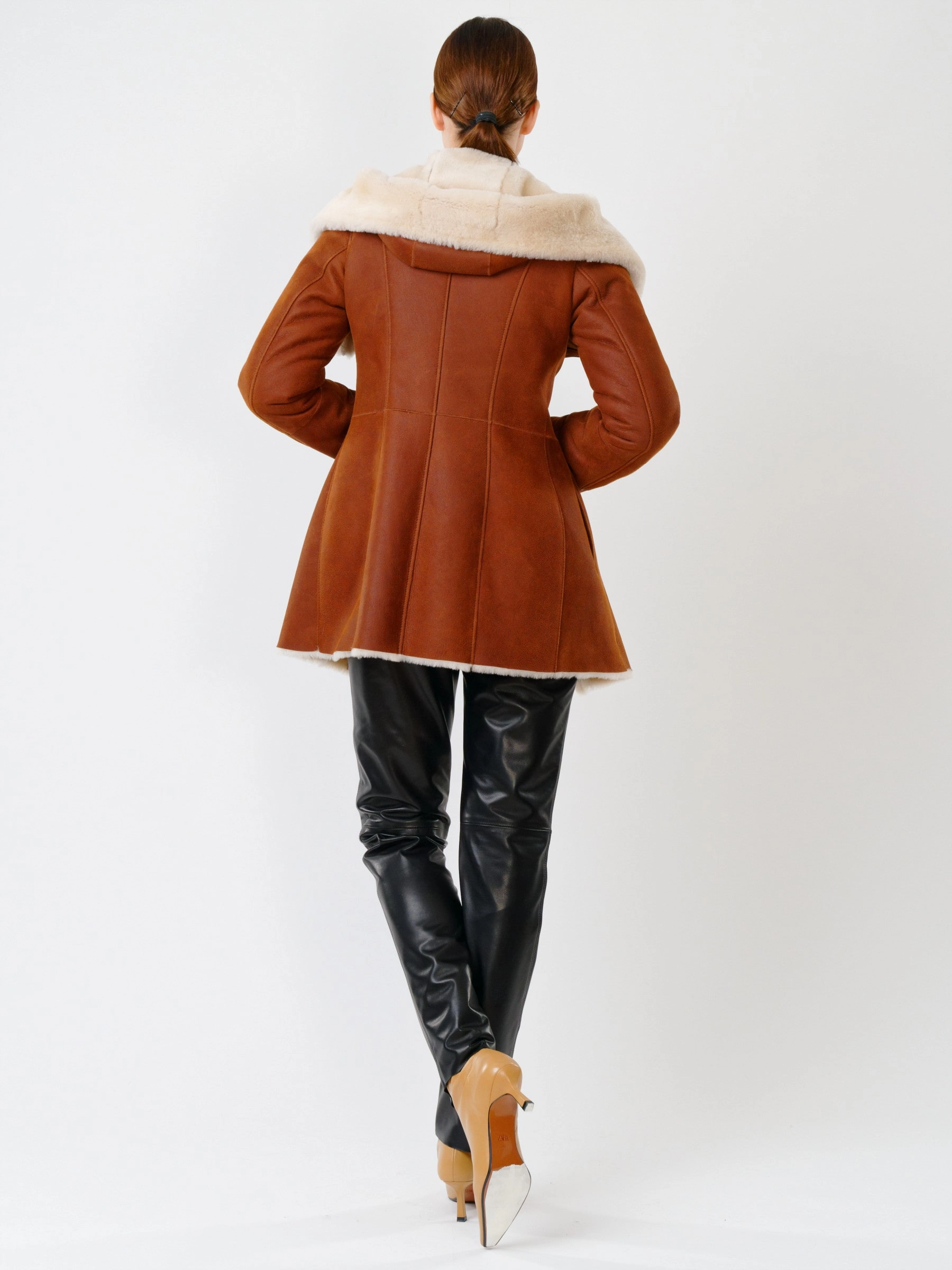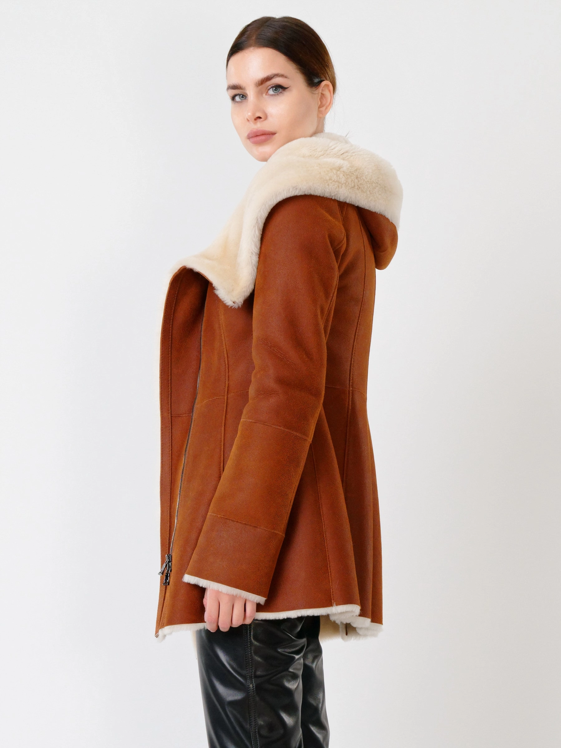 Короткая женская дубленка косуха с капюшоном 200, табачно-рыжая, размер 44, артикул 61701