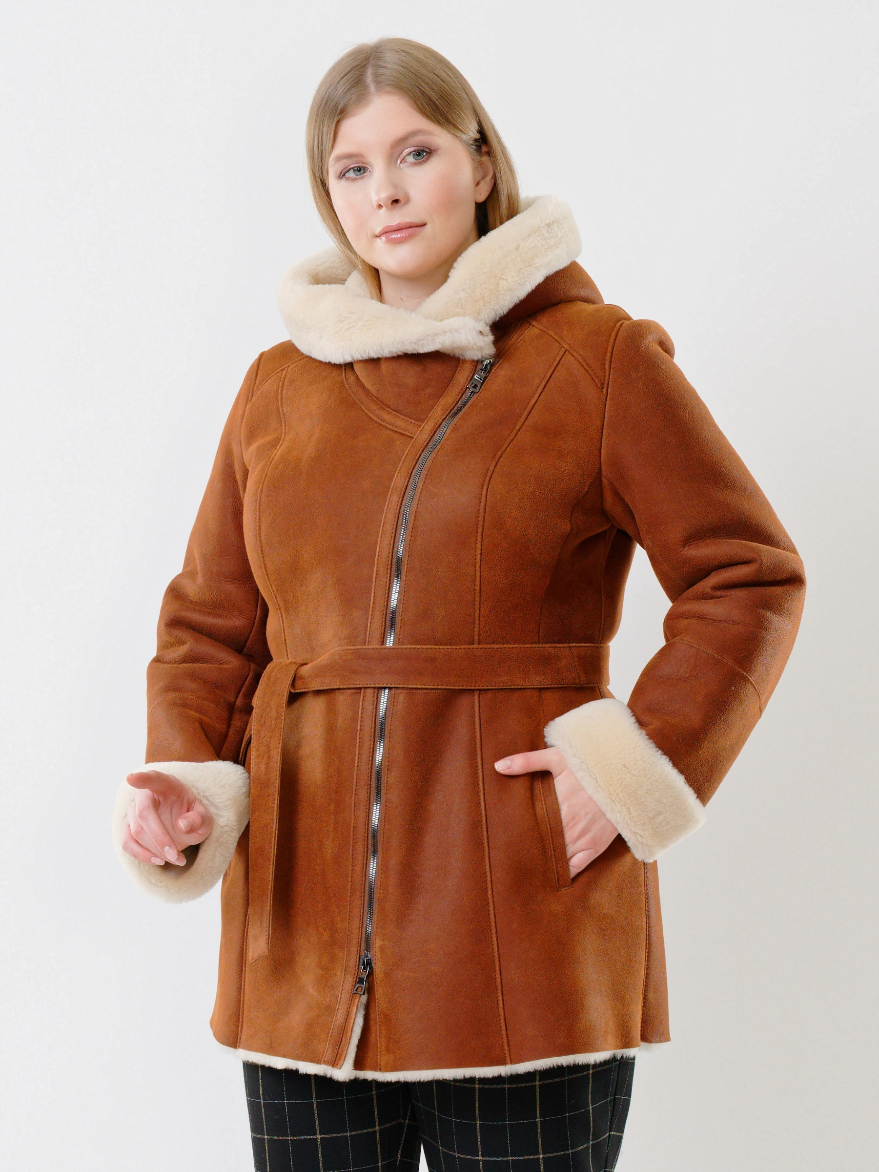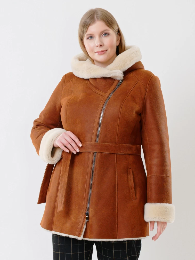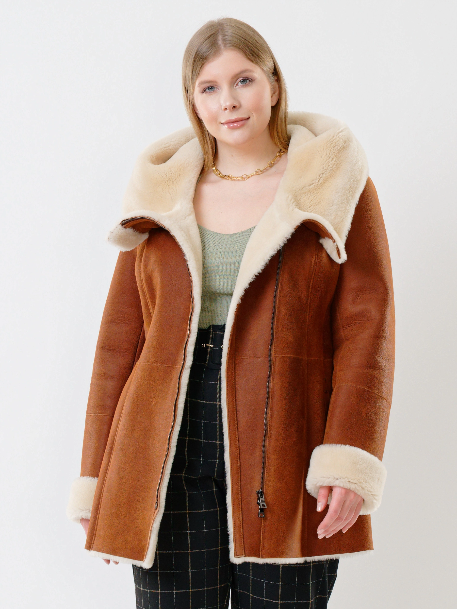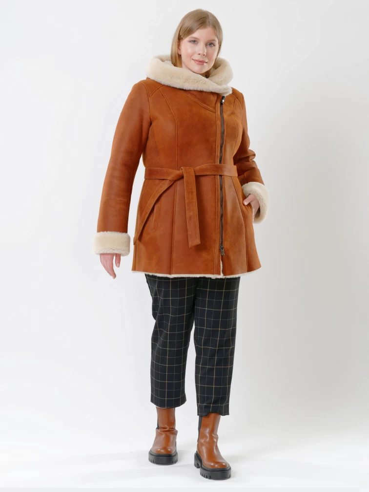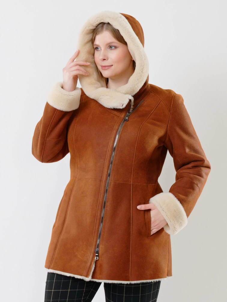 Товар короткая женская дубленка косуха с капюшоном 200, табачно-рыжая, размер 44, артикул 62132 выполнен из овчина "мерино" с застежкой молния. Рассчитан на сезон: осень-зима. Длина изделия 75 см, силуэт полуприлегающий.