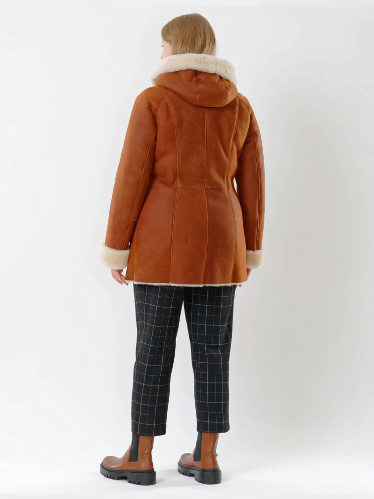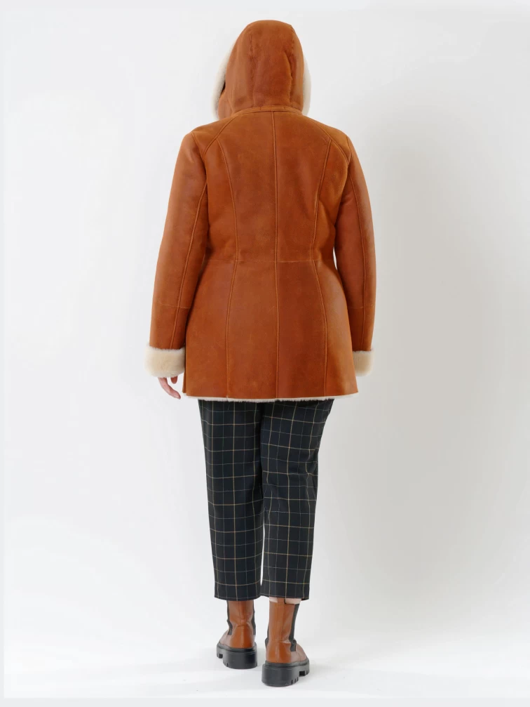 Дубленка-косуха. Удобный объёмный капюшон. Нежнейшая мериносная овчина с максимально густым мехом согреет в любой мороз. Устойчивое защитное покрытие. Абсолютный комфорт. Премиальное качество.