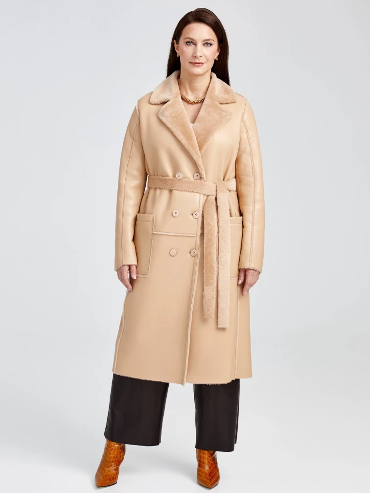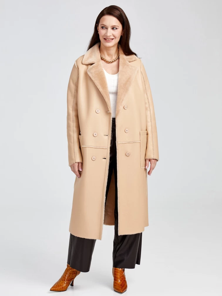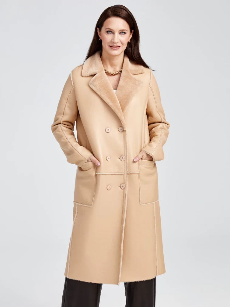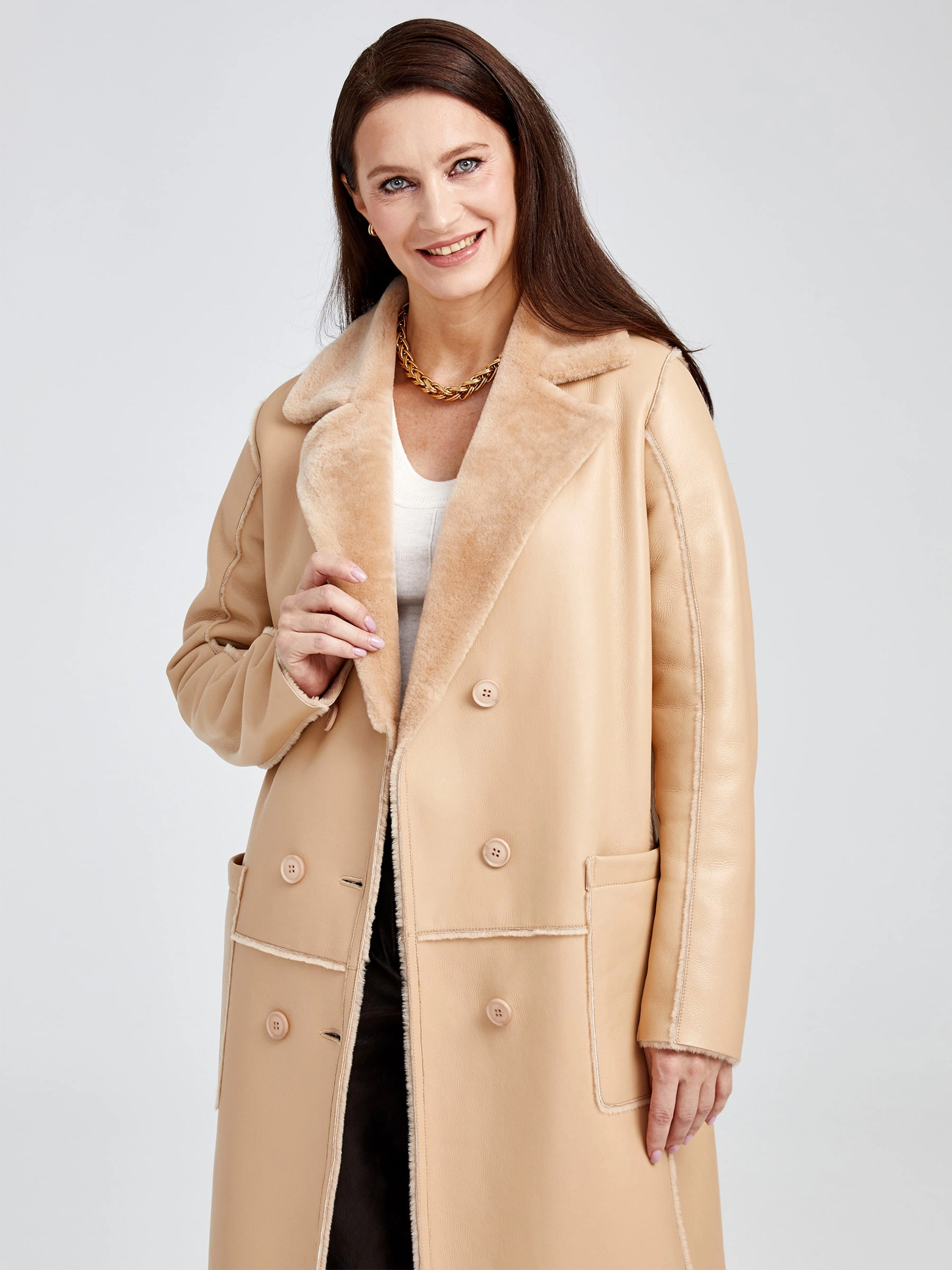 Товар дубленка женская двубортная премиум класса 2000, бежевая, размер 46, артикул 62280 выполнен из овчина "мерино" с застежкой пуговицы. Рассчитан на сезон: осень-зима. Длина изделия 105 см, силуэт прямой.
