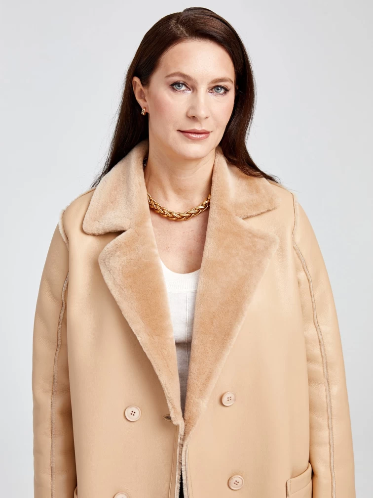 Дубленка женская двубортная премиум класса 2000, бежевая, размер 46, артикул 62280