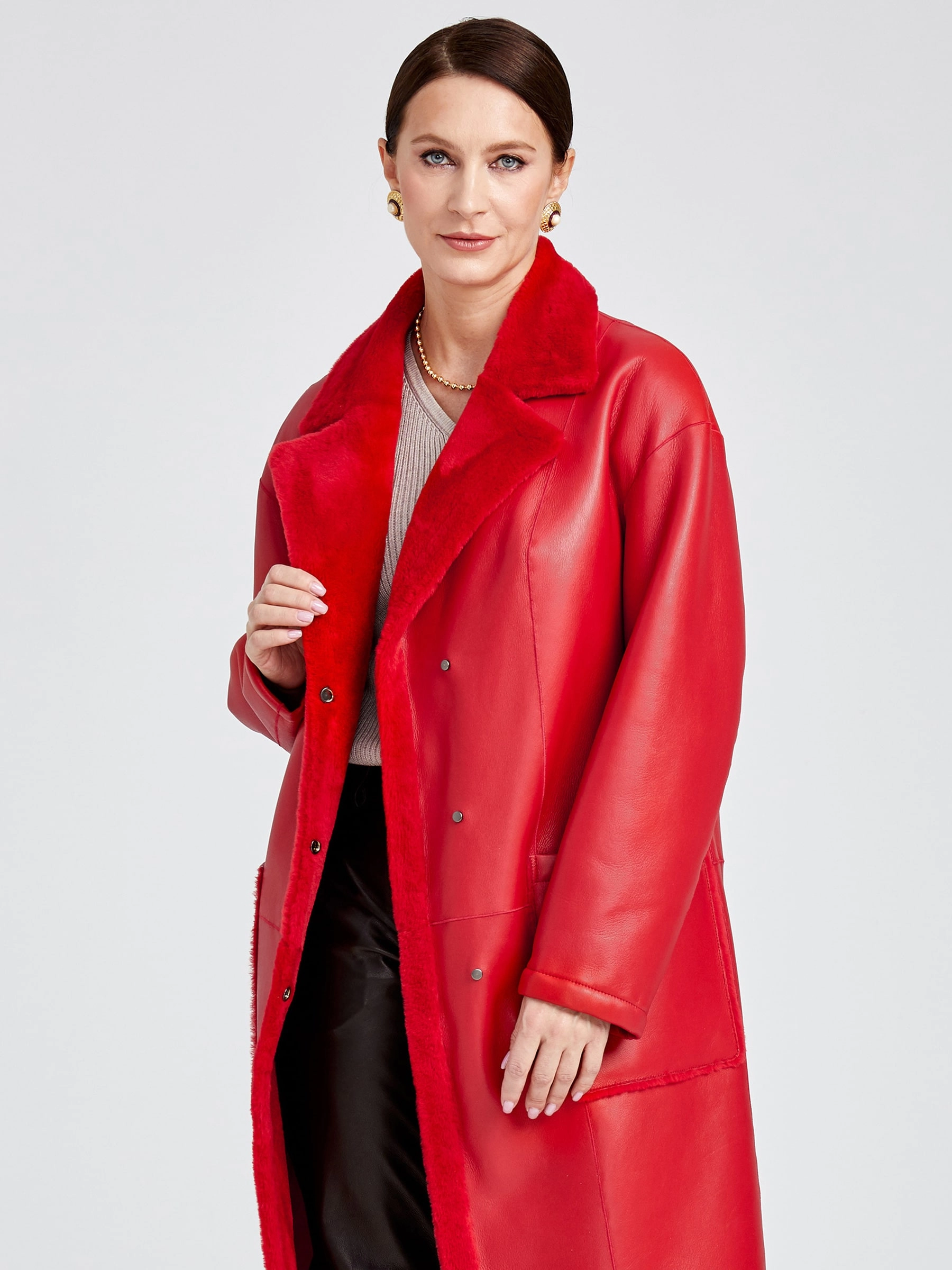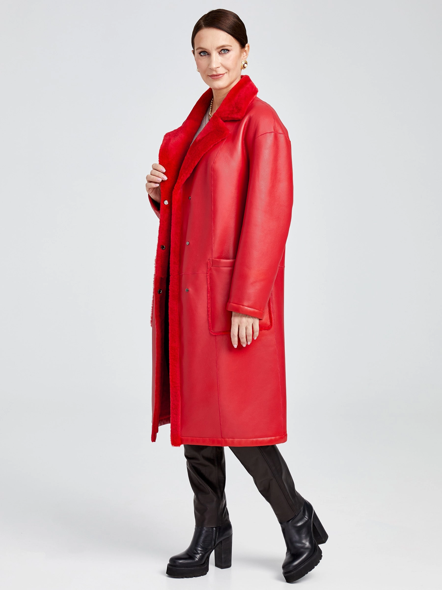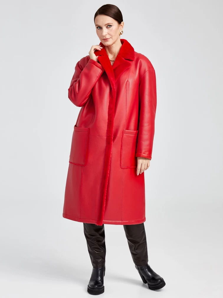 Товар длинная женская дубленка оверсайз премиум класса 2002, красная, размер 46, артикул 62310 выполнен из овчина "мерино" с застежкой кнопки. Рассчитан на сезон: осень-зима. Длина изделия 105 см, силуэт прямой.