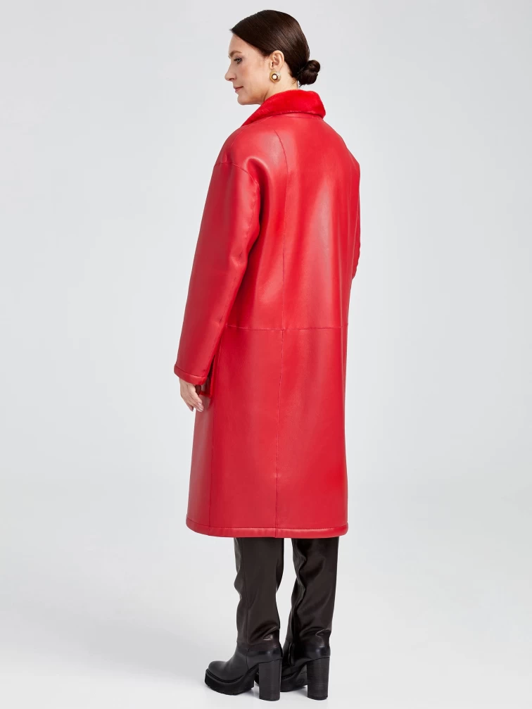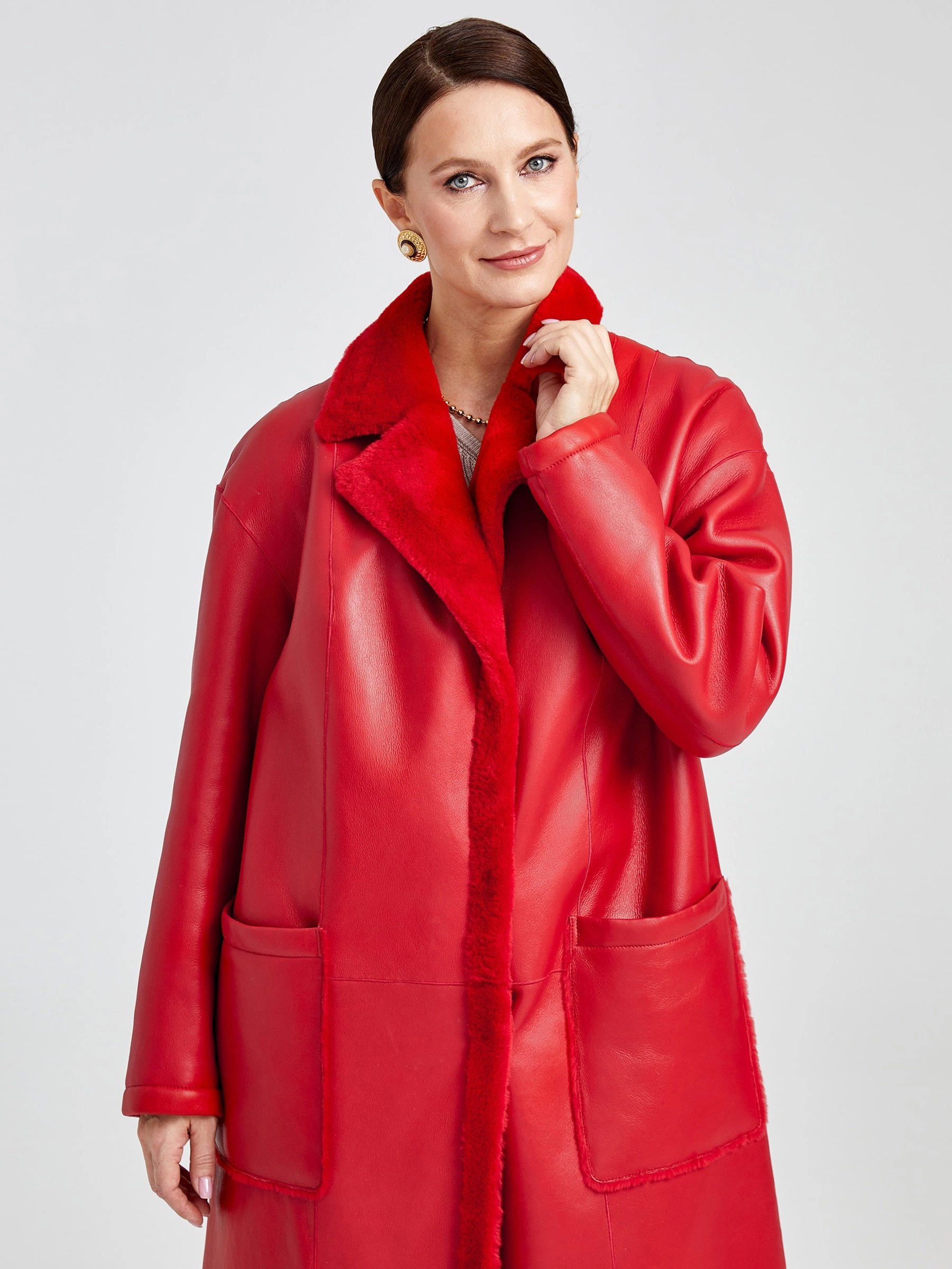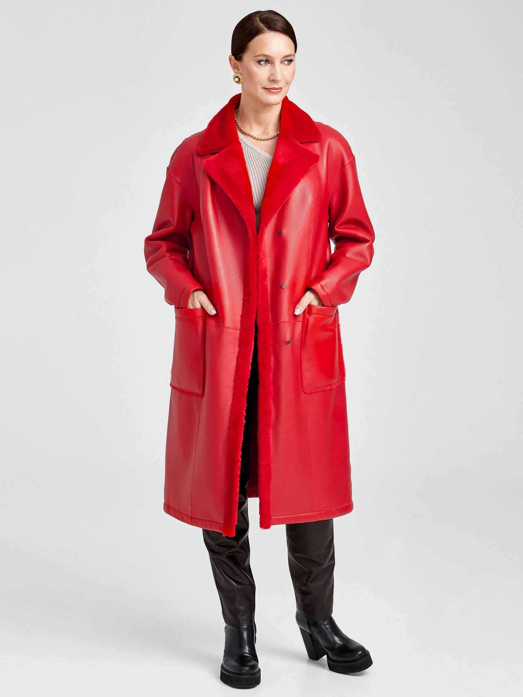 Товар длинная женская дубленка оверсайз премиум класса 2002, красная, размер 46, артикул 62310 выполнен из овчина "мерино" с застежкой кнопки. Рассчитан на сезон: осень-зима. Длина изделия 105 см, силуэт прямой.