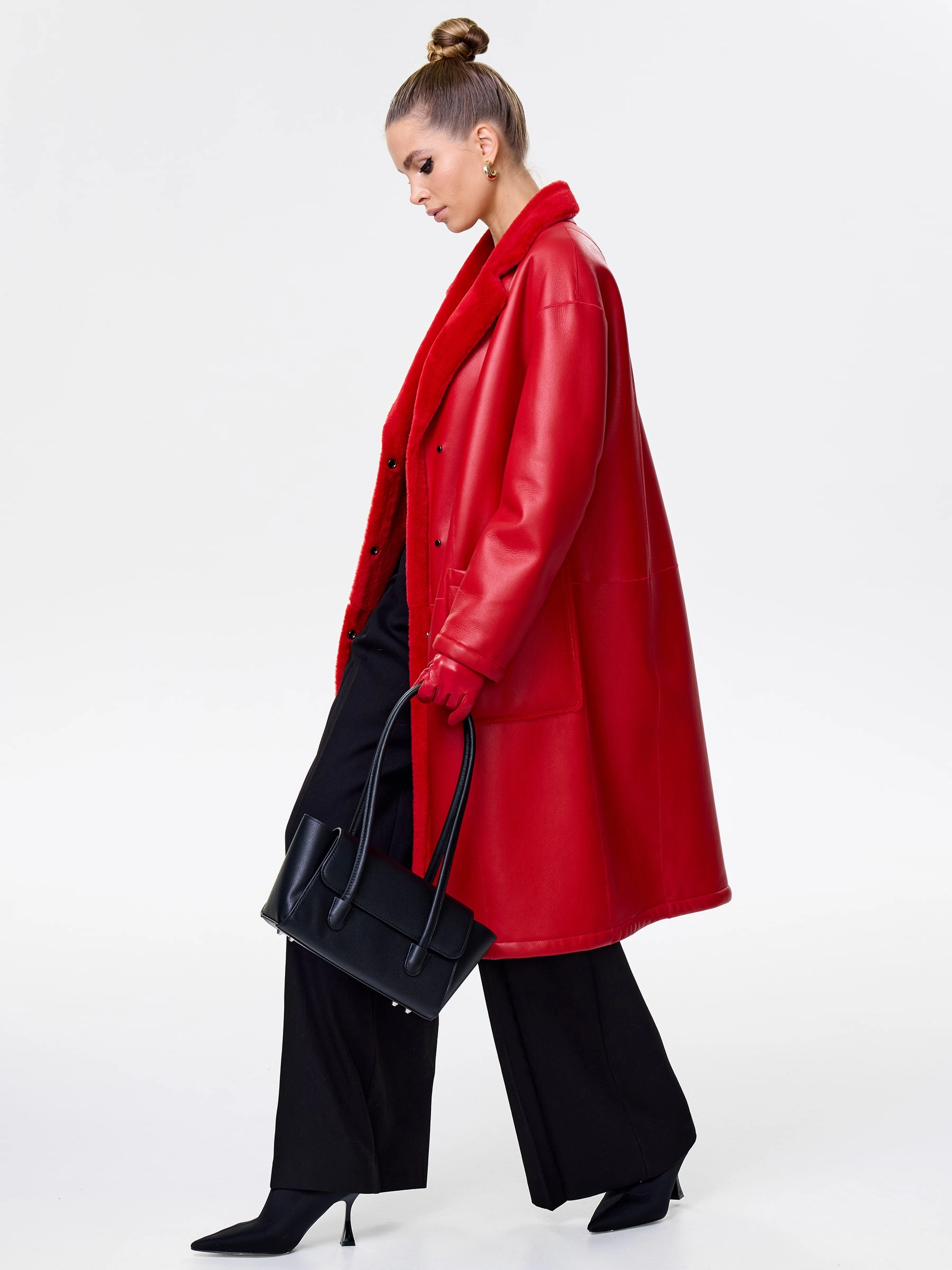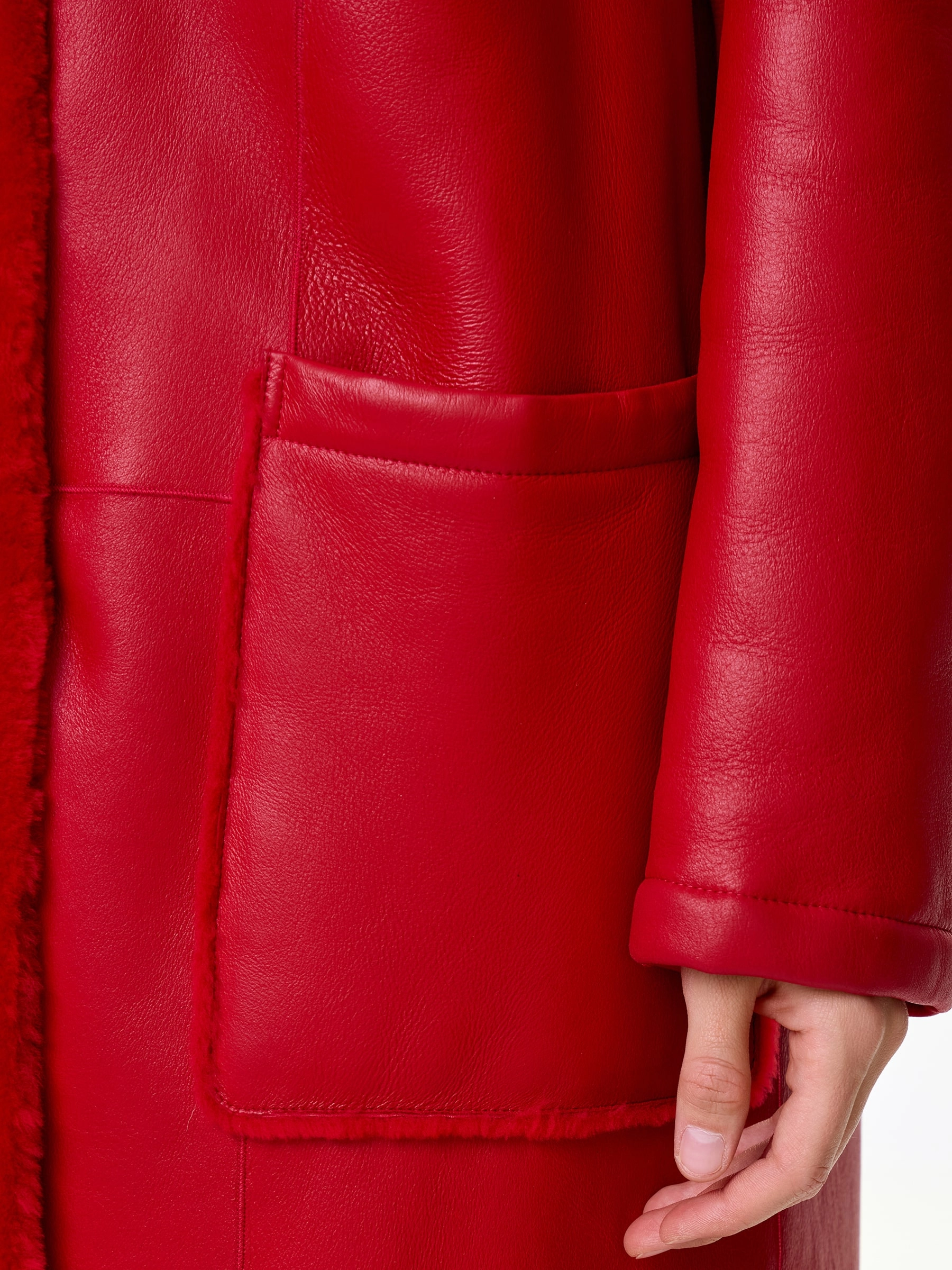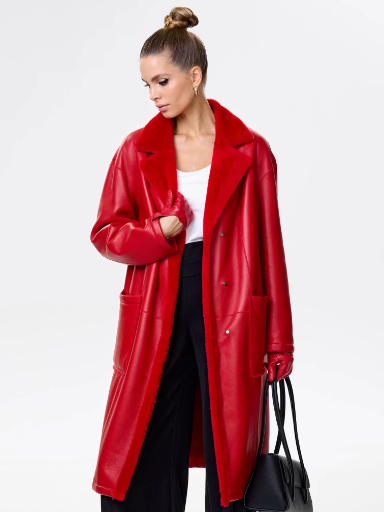 Товар длинная женская дубленка оверсайз премиум класса 2002, красная, размер 46, артикул 62441 выполнен из овчина "мерино" с застежкой кнопки. Рассчитан на сезон: осень-зима. Длина изделия 105 см, силуэт прямой.
