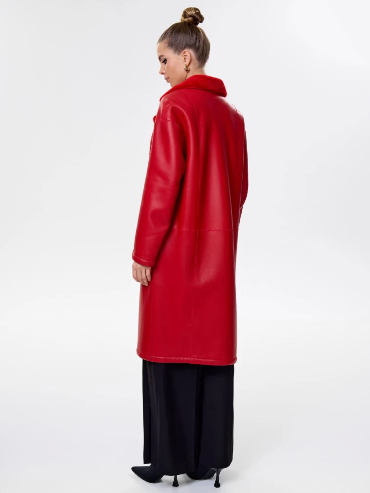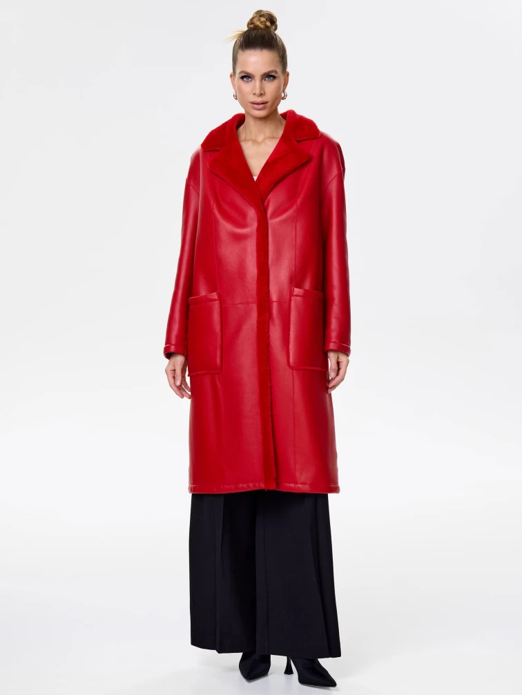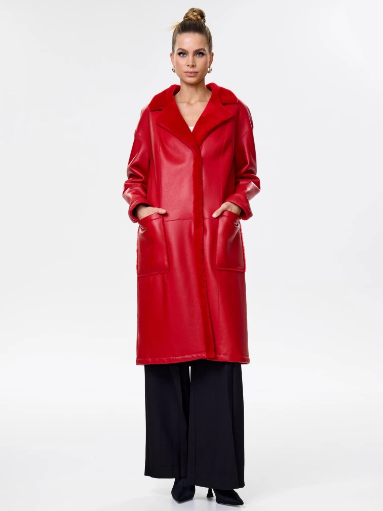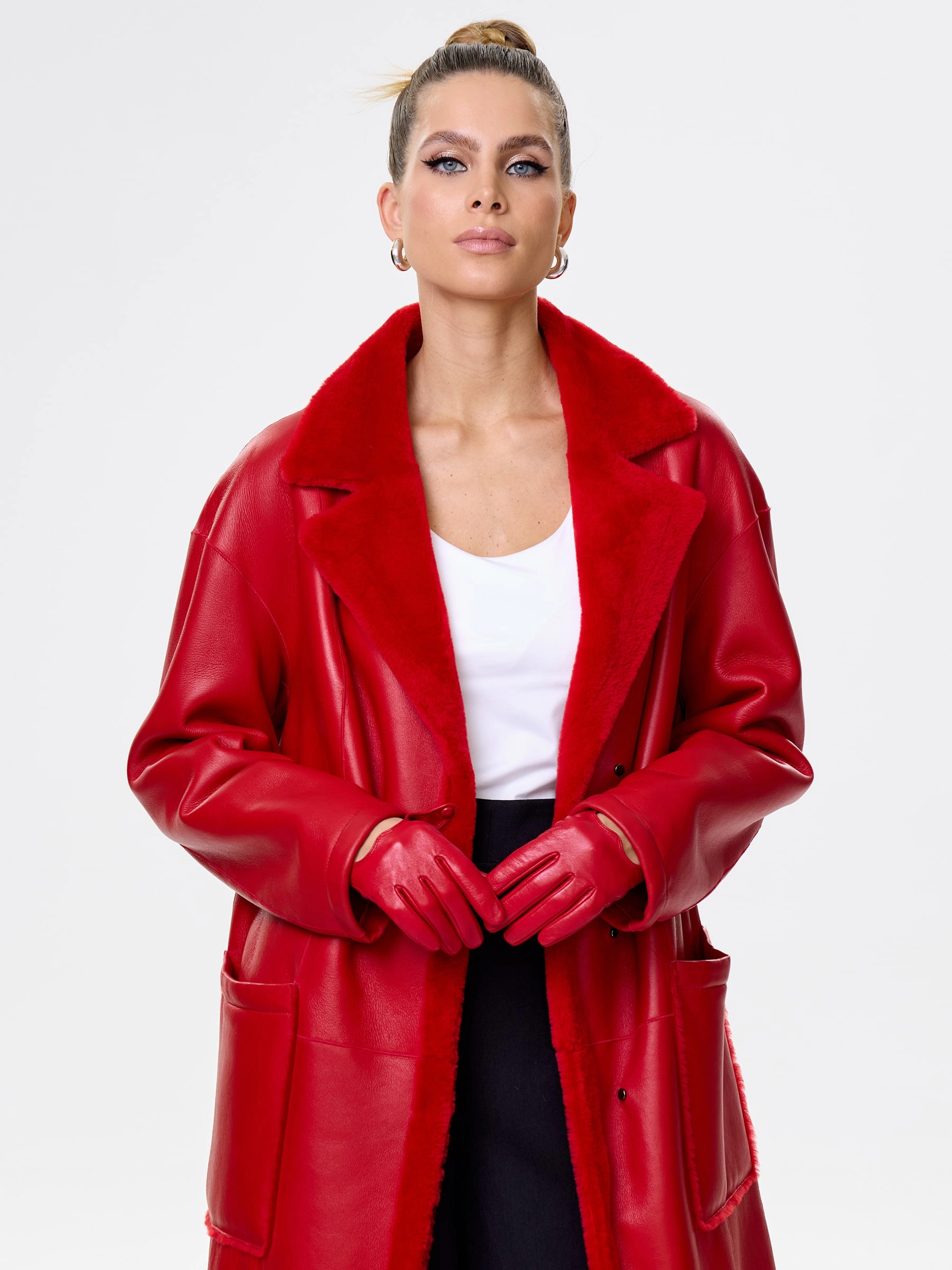 Товар длинная женская дубленка оверсайз премиум класса 2002, красная, размер 46, артикул 62441 выполнен из овчина "мерино" с застежкой кнопки. Рассчитан на сезон: осень-зима. Длина изделия 105 см, силуэт прямой.