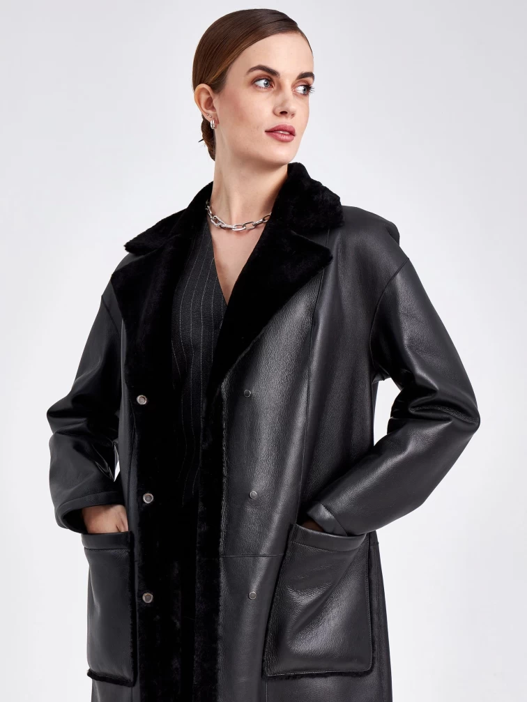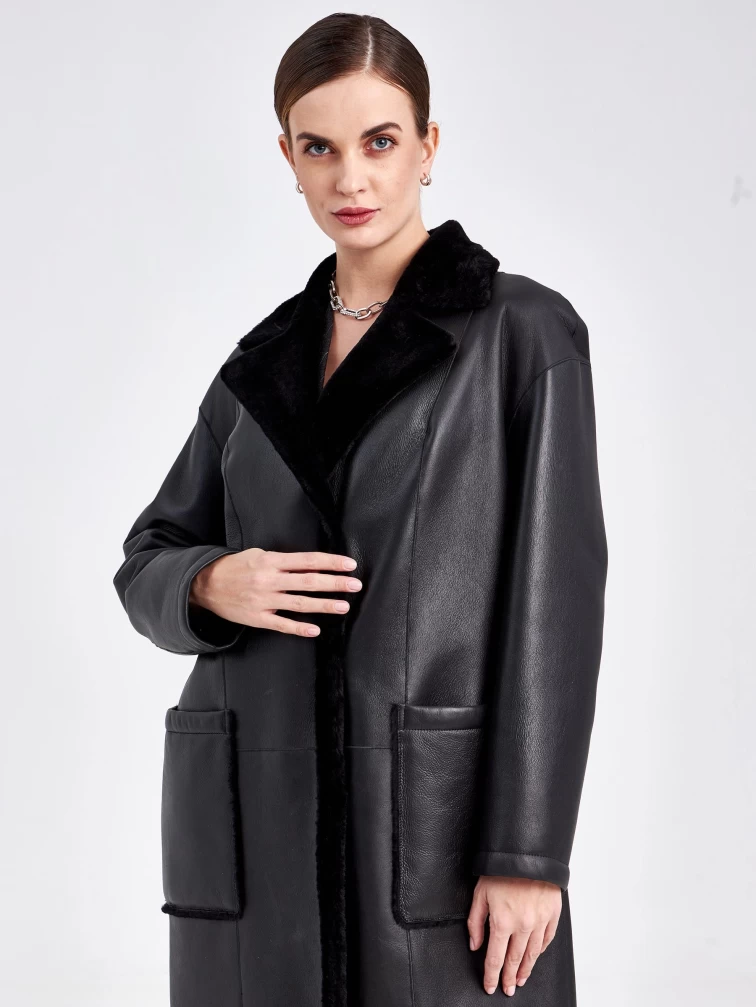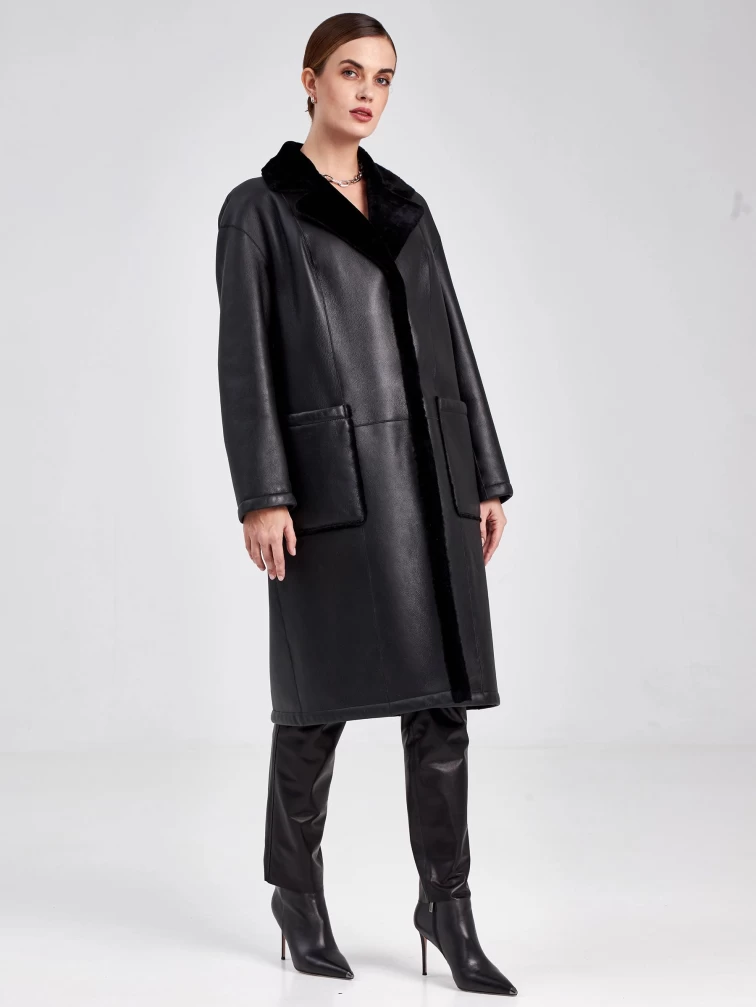 Товар длинная женская дубленка оверсайз премиум класса 2002, черная, размер 50, артикул 62452 выполнен из овчина "мерино" с застежкой кнопки. Рассчитан на сезон: осень-зима. Длина изделия 105 см, силуэт прямой.
