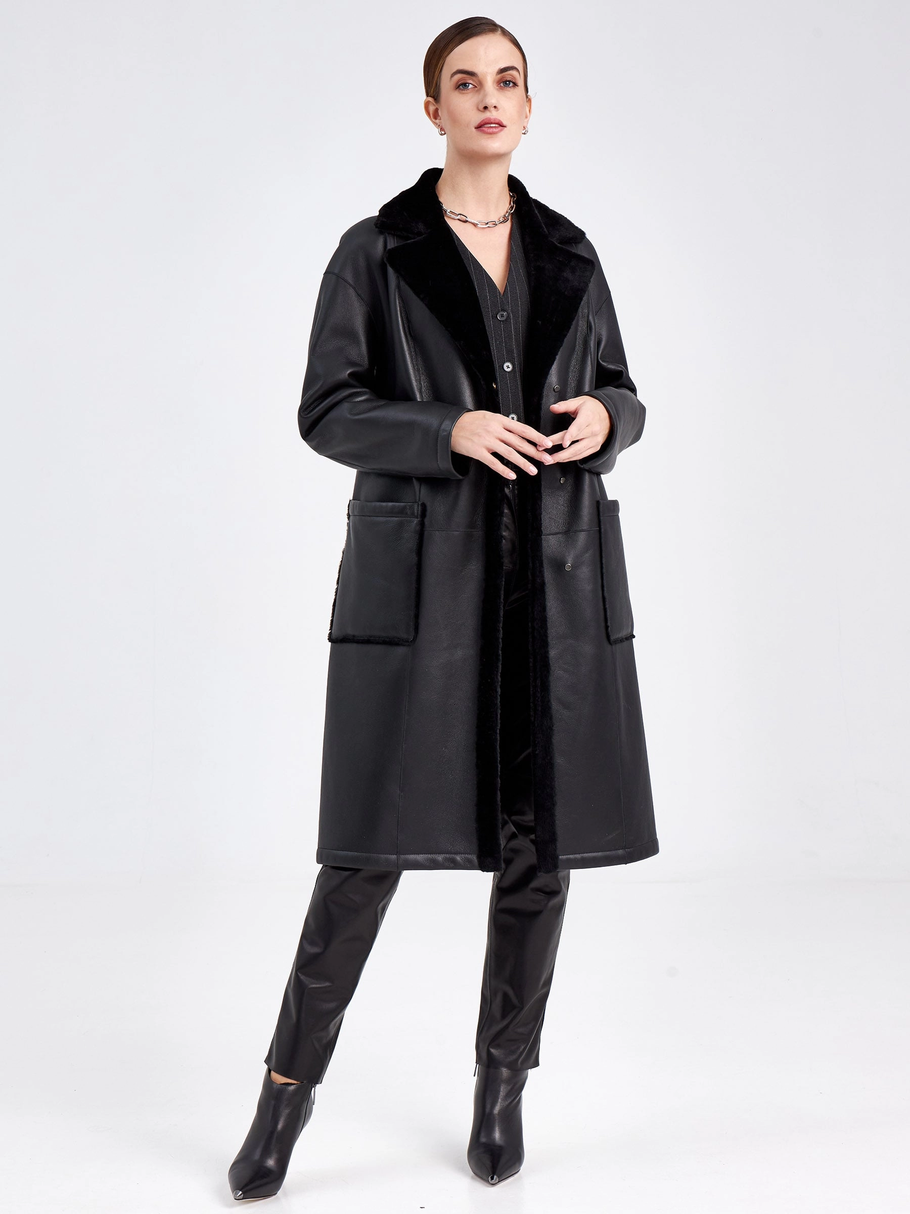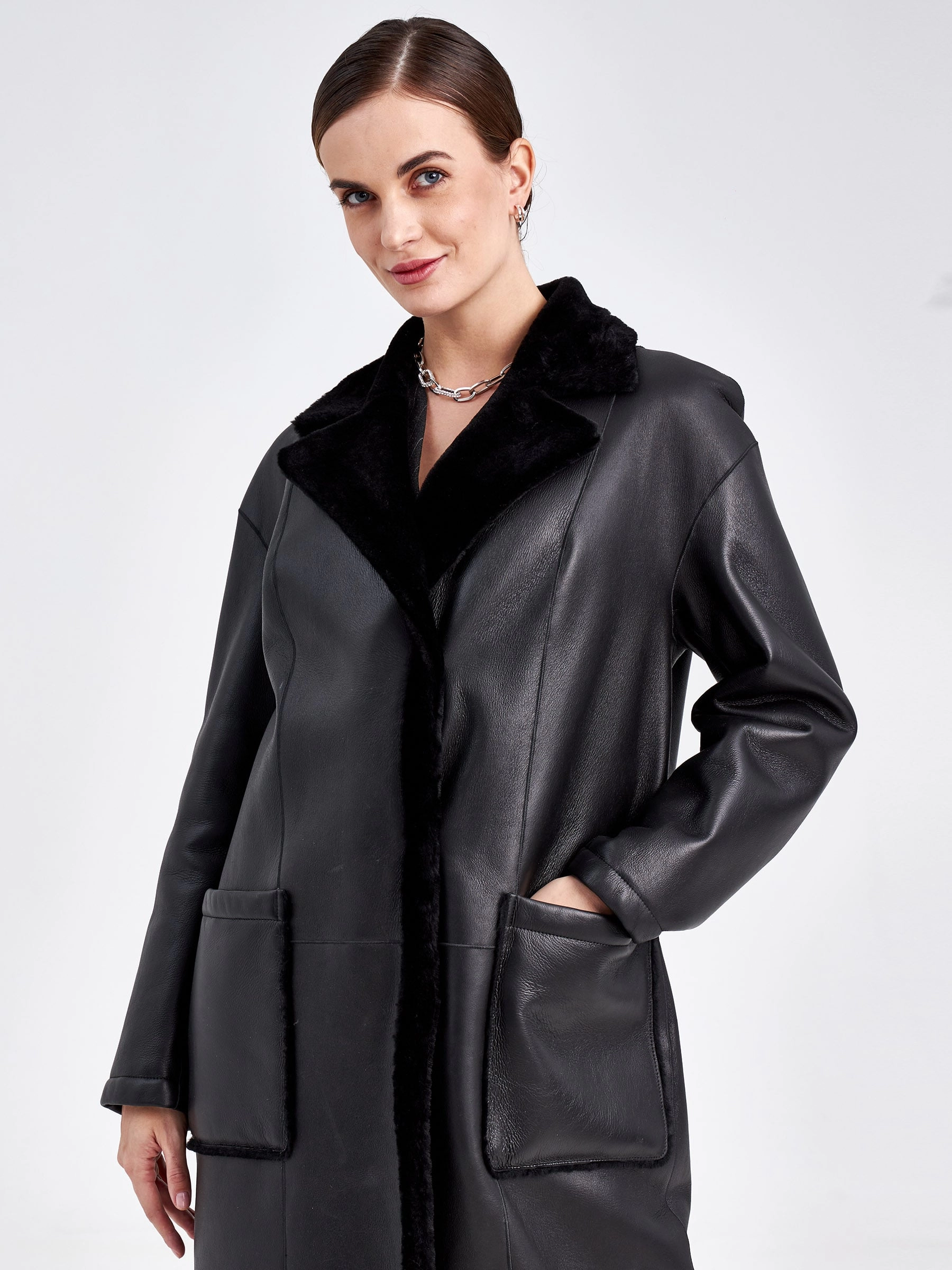 Длинная женская дубленка оверсайз премиум класса 2002, черная, размер 50, артикул 62452