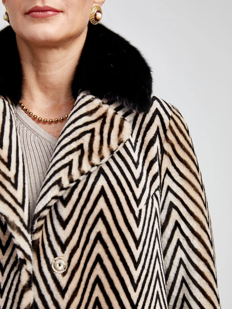 Роскошная двусторонняя дублёнка премиум-класса длиной 119 см: принтованный мех астрагана, то есть ягнёнка, с одной стороны и благородное бронзовое металлизированное покрытие — с другой. Свободный силуэт со съёмным английским воротником из густого чёрного меха норки и удобной застёжкой на кнопках создаёт образ исключительной элегантности. Два накладных кармана и длинный пояс подчёркивают дизайн. Совет стилиста: носите со стороной из астрагана и меховым воротником с платьем-миди и сапогами для вечера или со стороной-металлик без воротника с водолазкой, кожаными брюками и ботинками для дерзкого повседневного лука — максимальная универсальность в одной вещи.