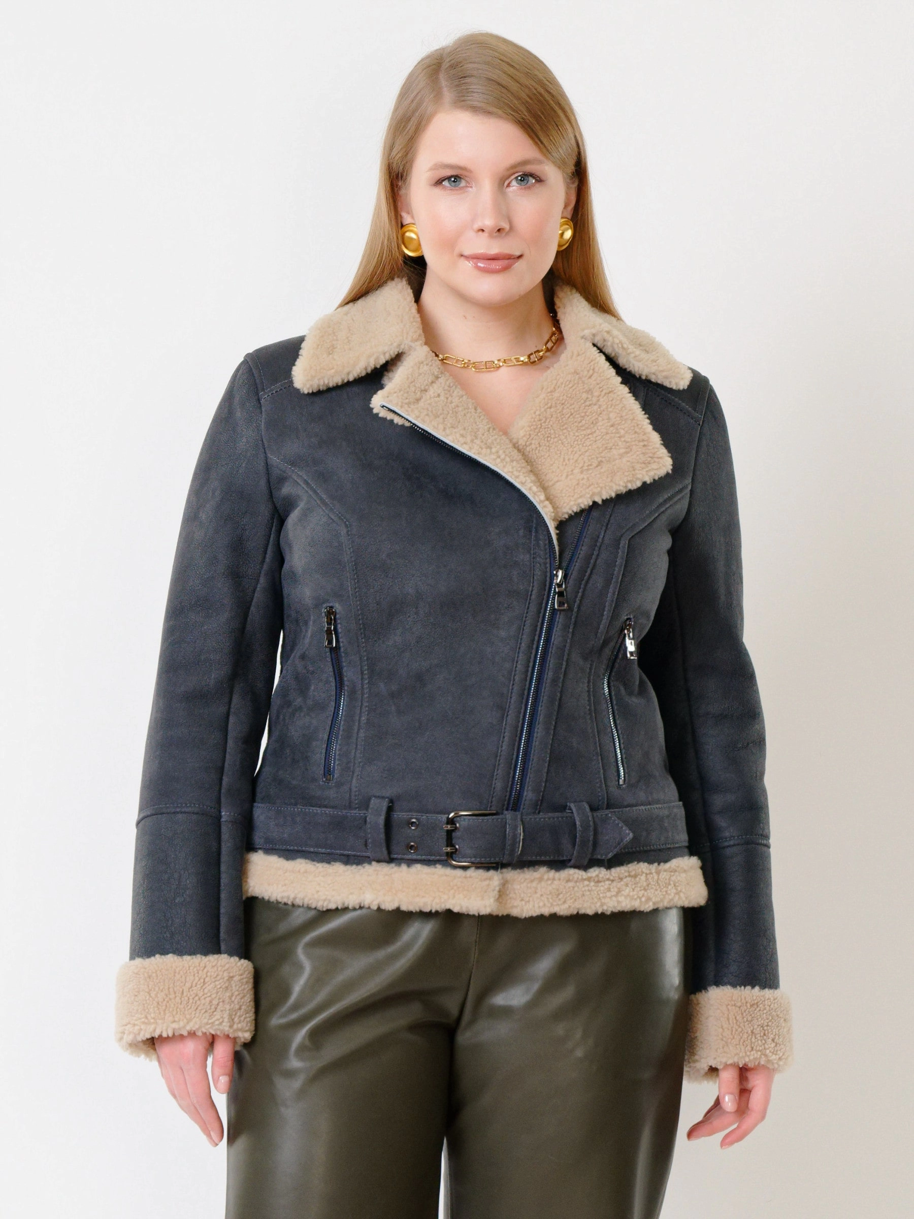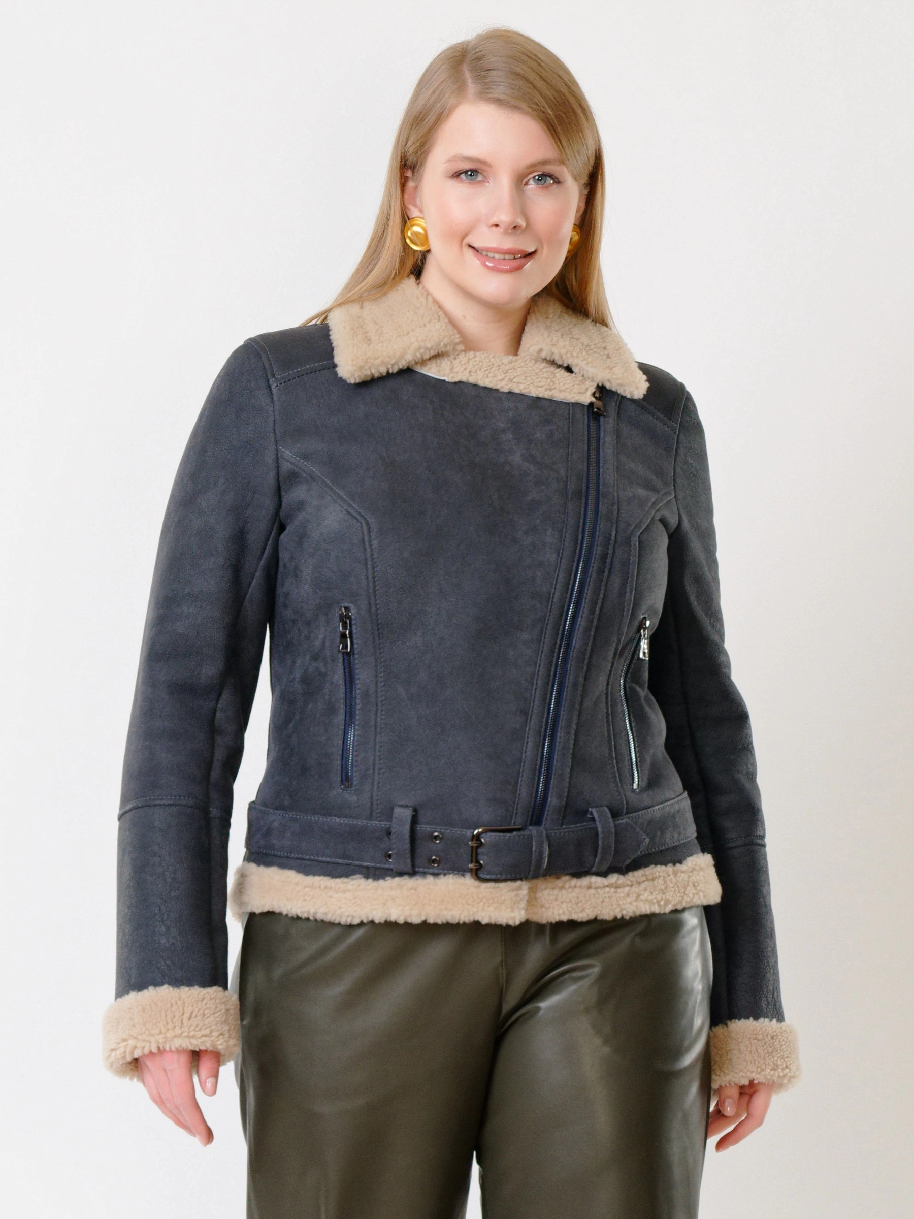 Товар короткая женская дубленка косуха из керли 201, синяя, размер 44, артикул 61990 выполнен из овчина "керли" с застежкой молния. Рассчитан на сезон: осень-зима. Длина изделия 60 см, силуэт свободный.