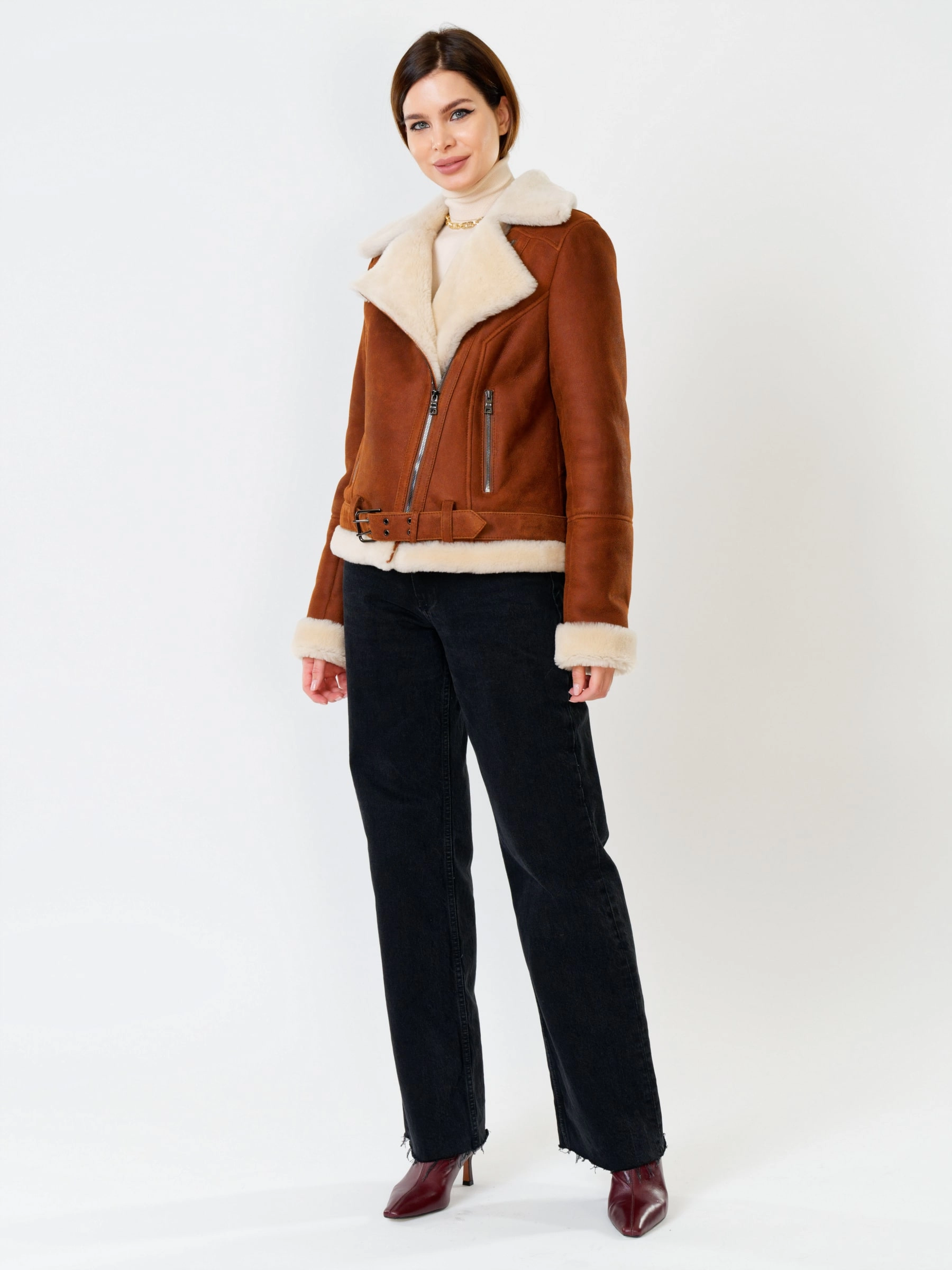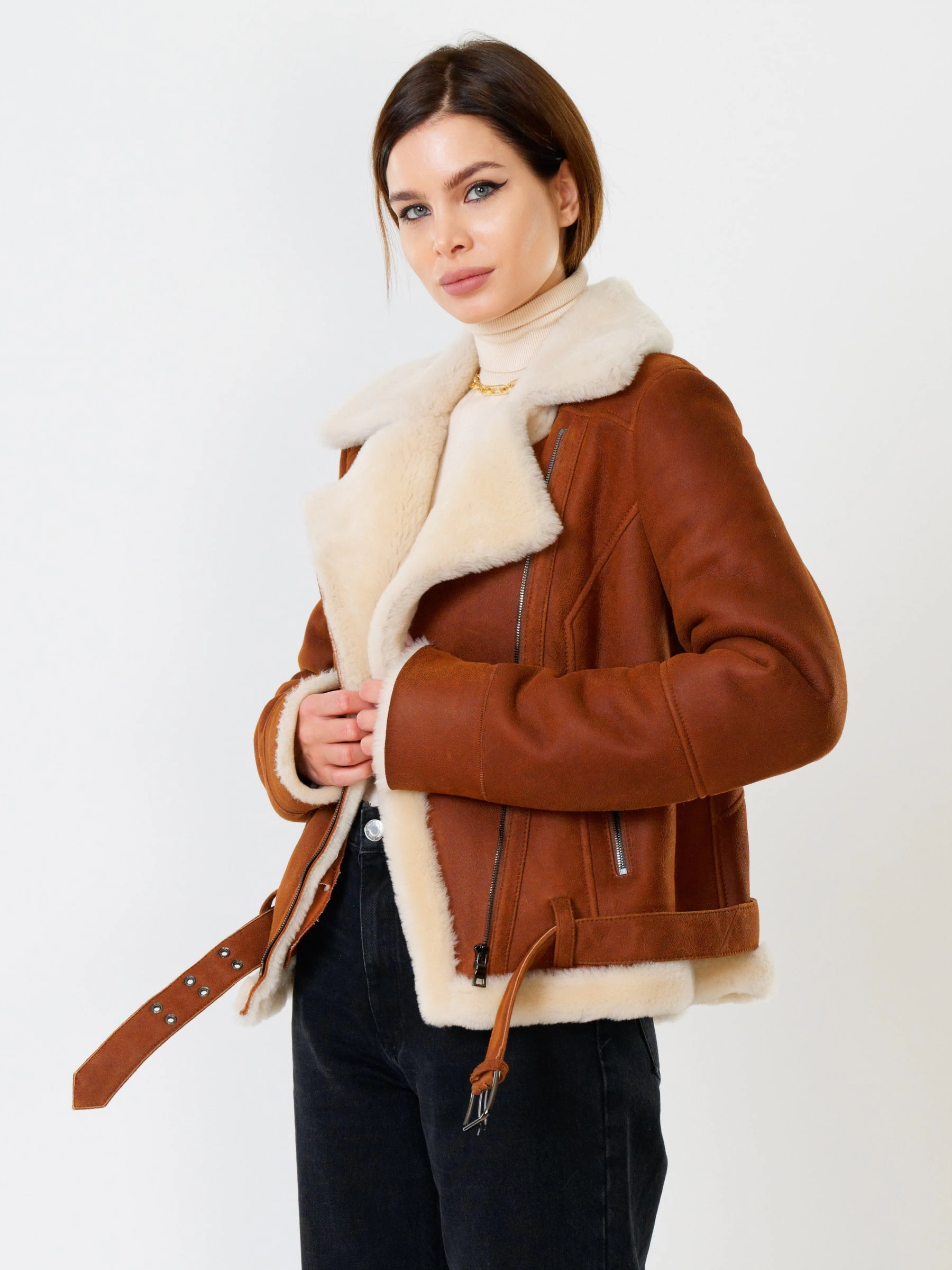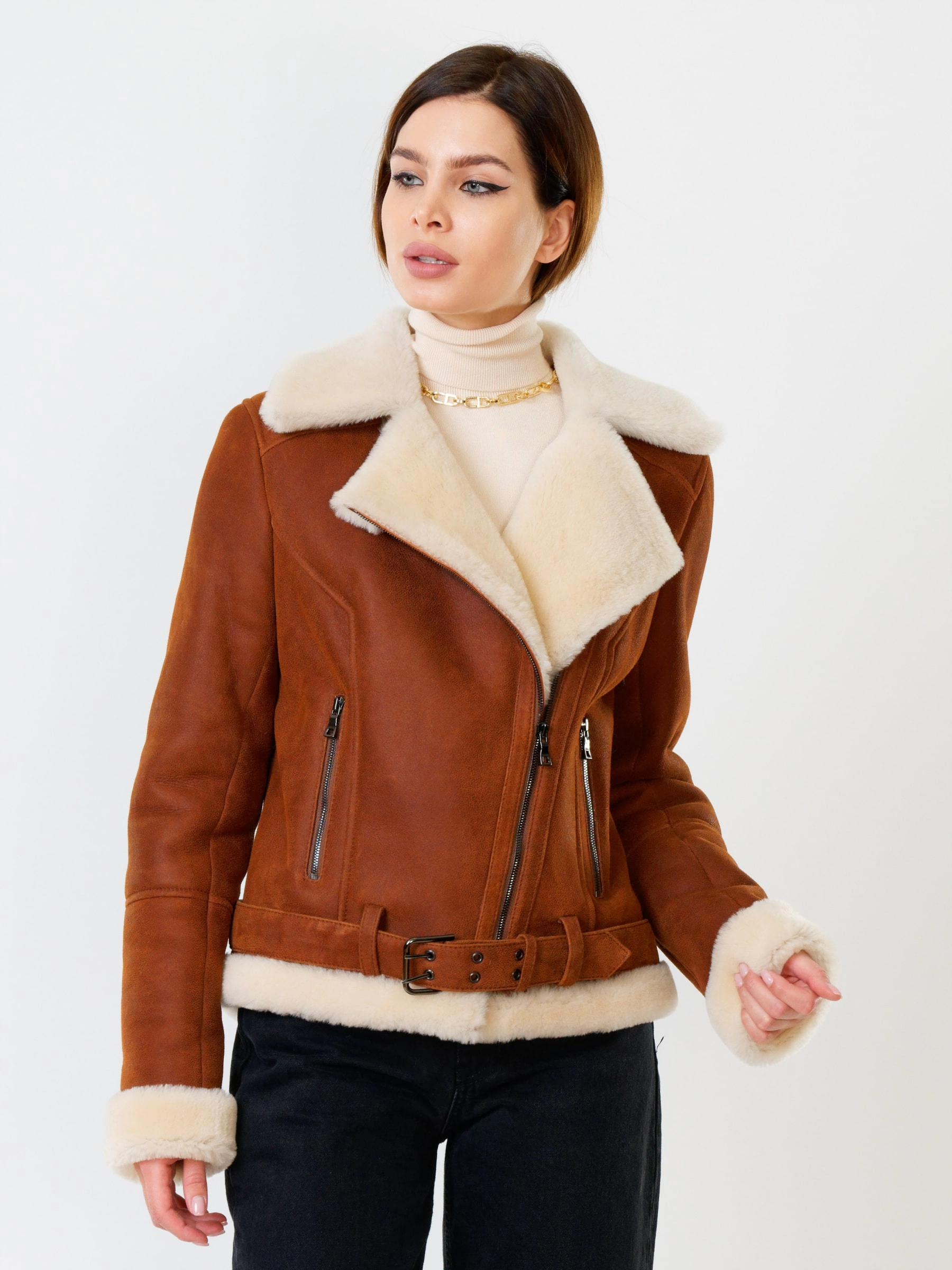Короткая женская дубленка косуха из керли 201, табачно-рыжая, размер 44, артикул 61922