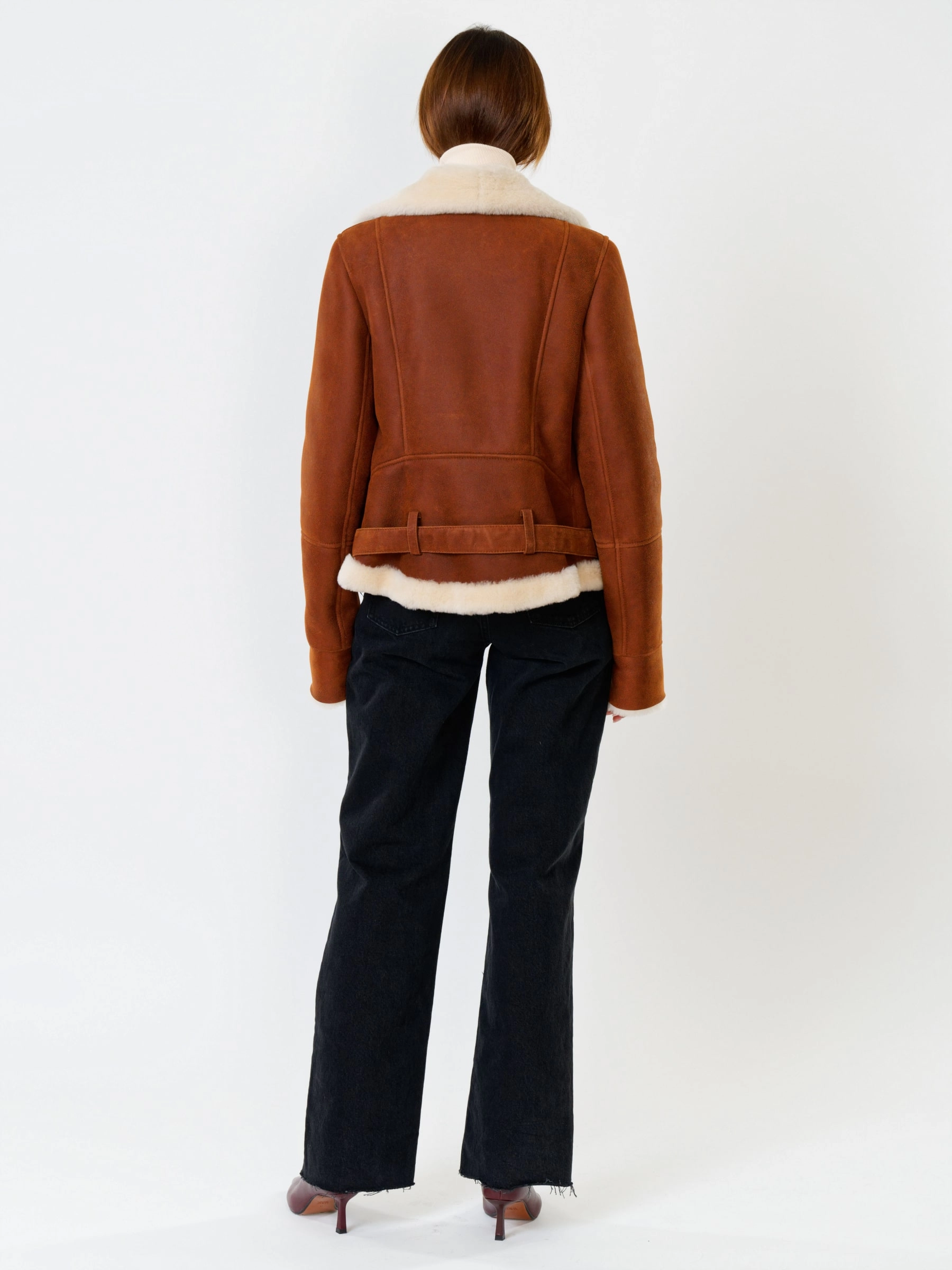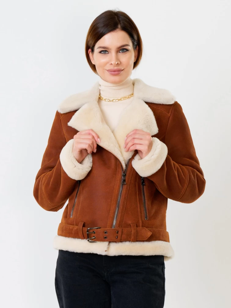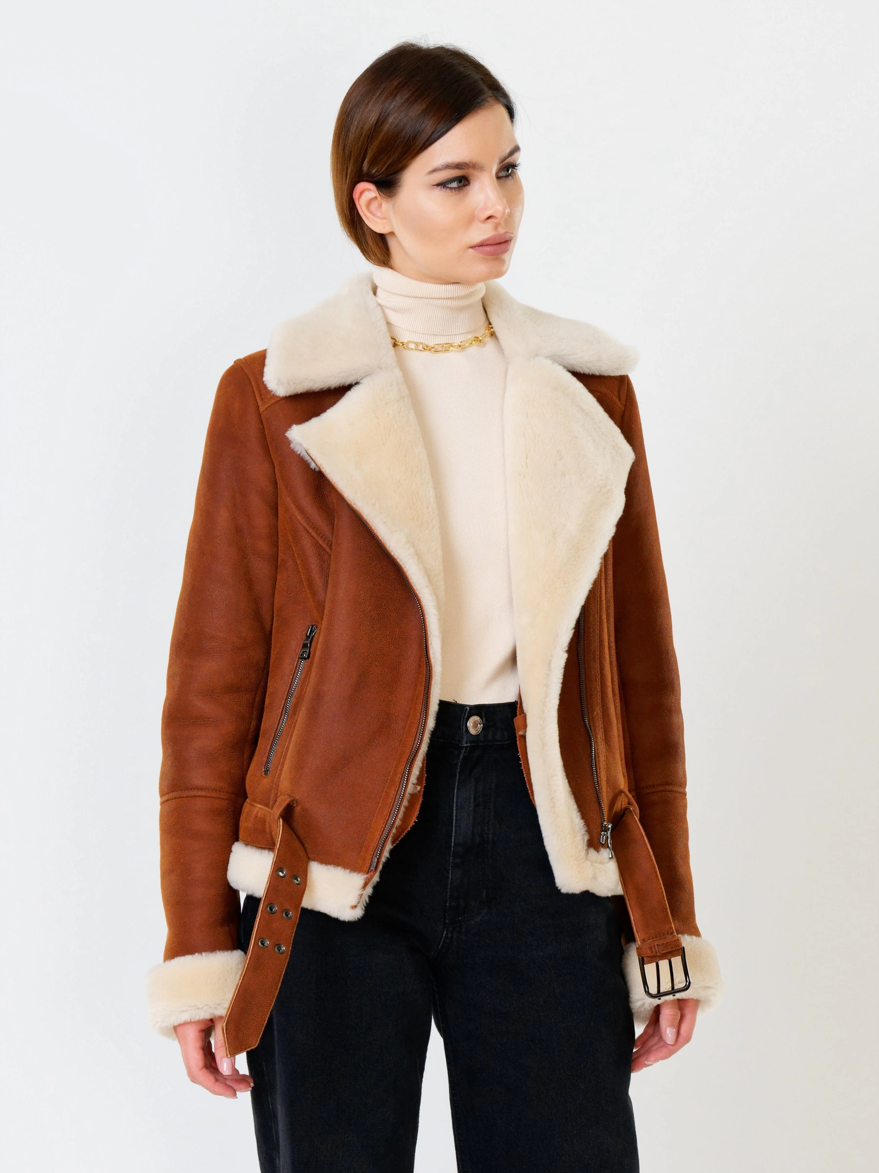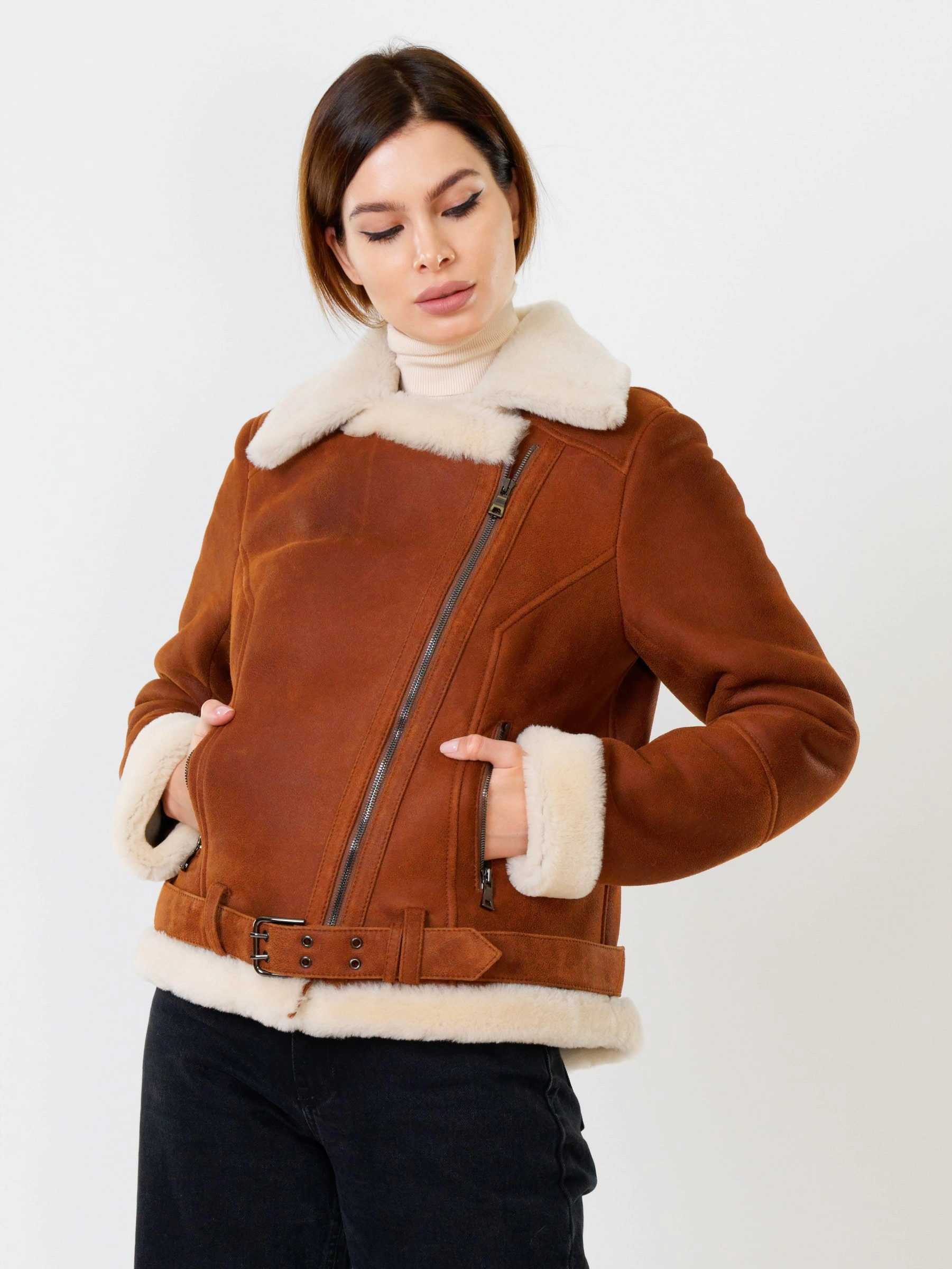 Короткая женская дубленка косуха из керли 201, табачно-рыжая, размер 44, артикул 61922