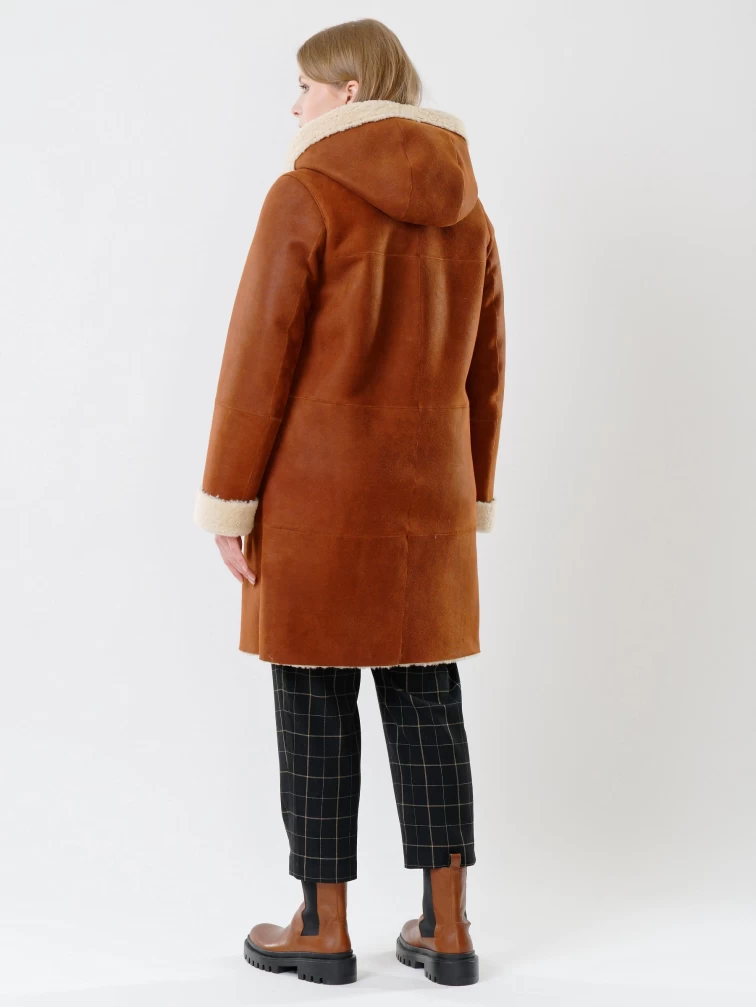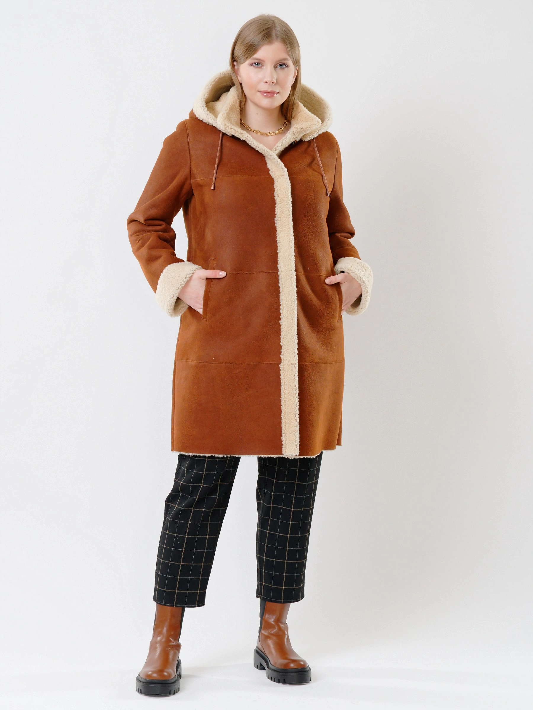 Женская дубленка из керли с капюшоном 202, табачно-рыжая, размер 46, артикул 62141