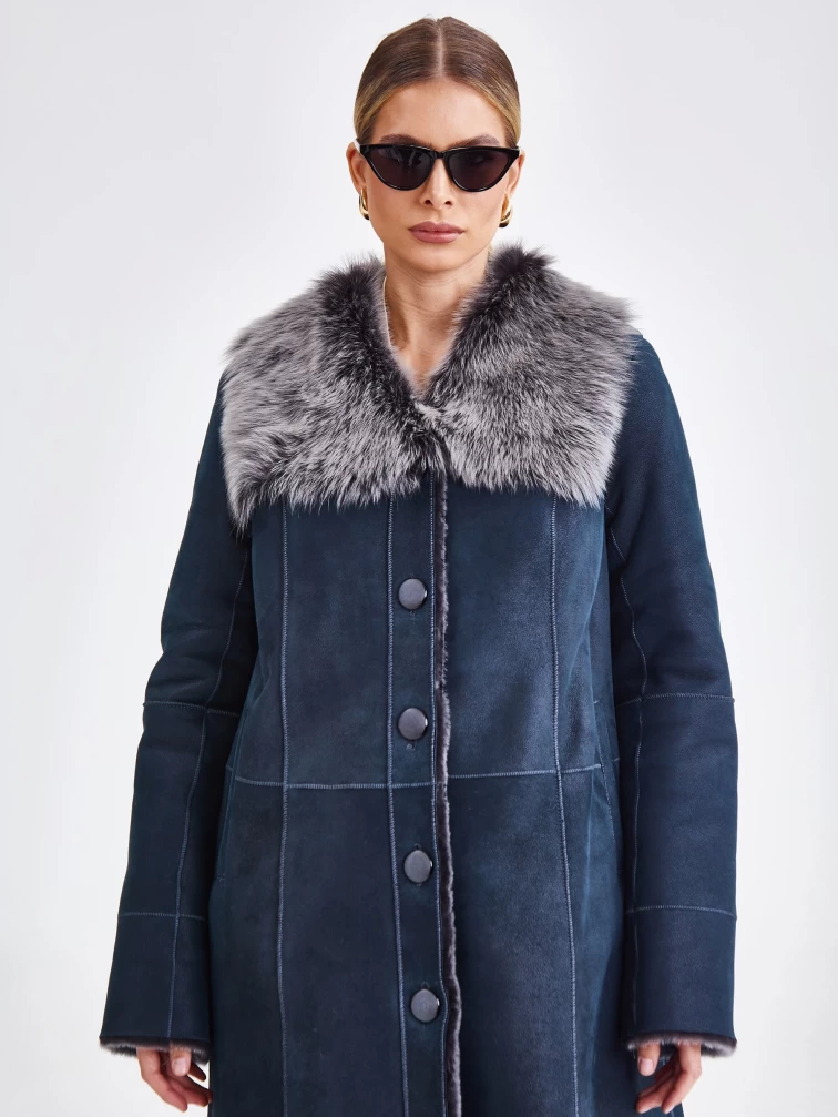 Элегантная длинная классическая дублёнка длиной 100 см из натуральной овчины «мерино» с силуэтом «трапеция» создаёт комфортную и утончённую форму. Модель с втачными рукавами, отложным воротником, отделанным роскошной натуральной овчиной «тоскана», двумя боковыми карманами и застёжкой на пуговицы — носите её с элегантными брюками, платьем-миди и кожаной сумкой для безупречного классического образа.