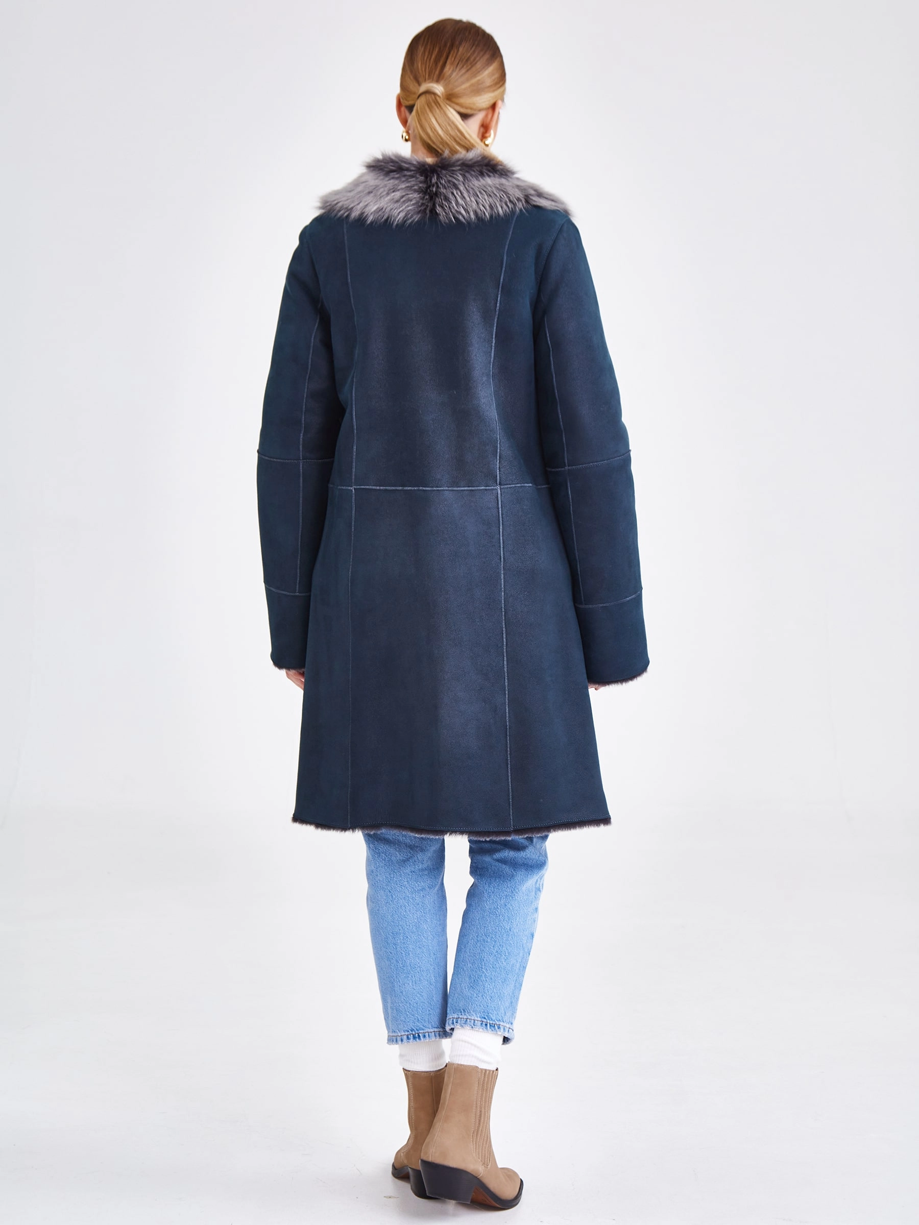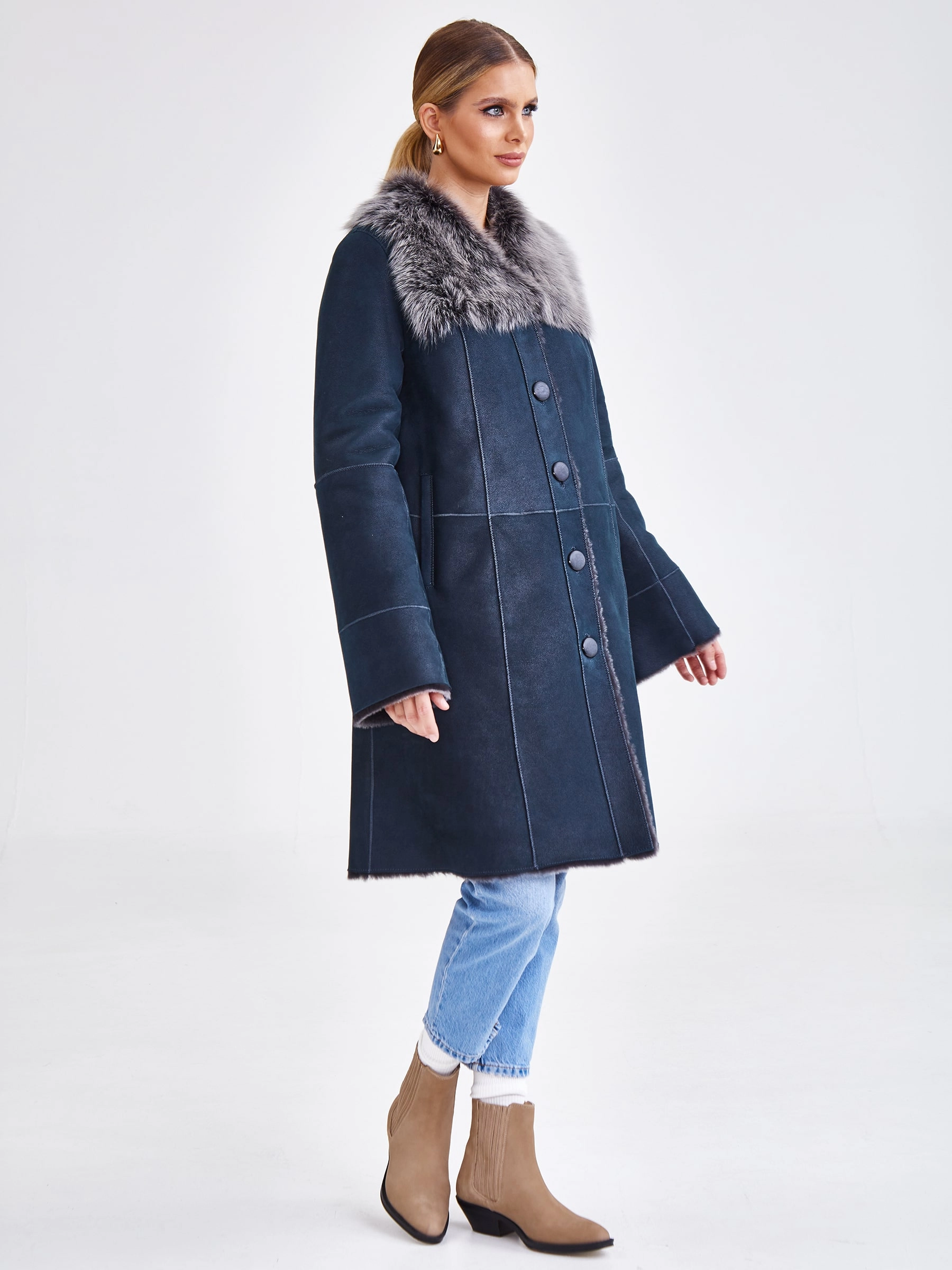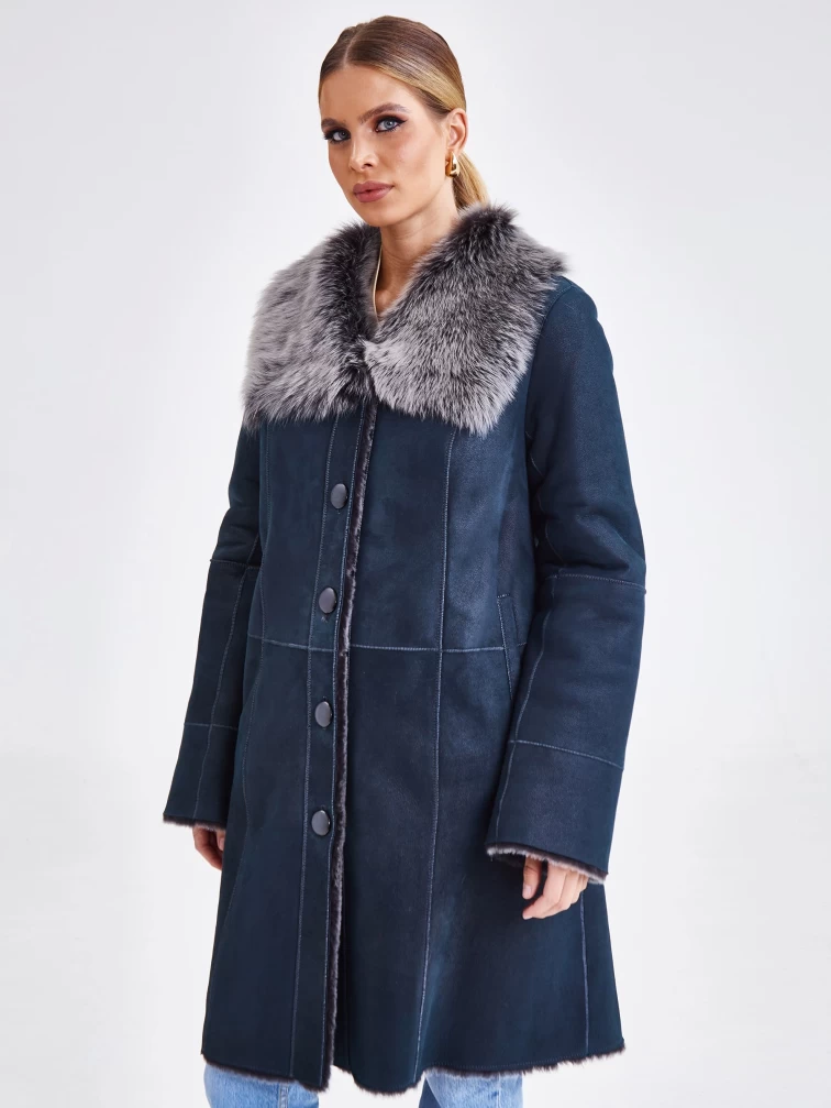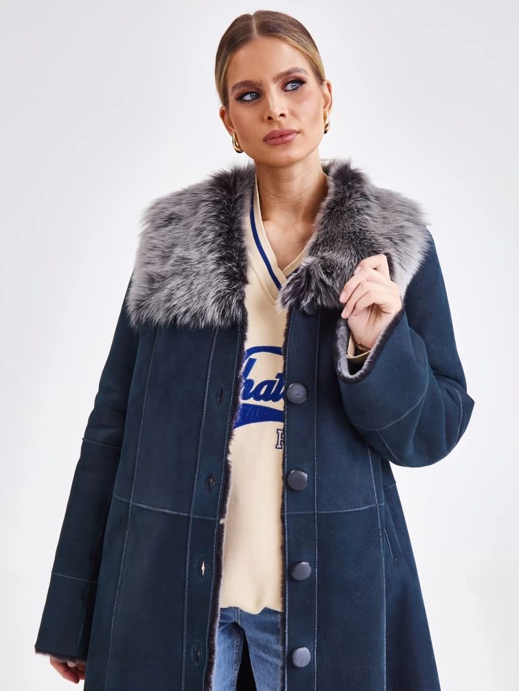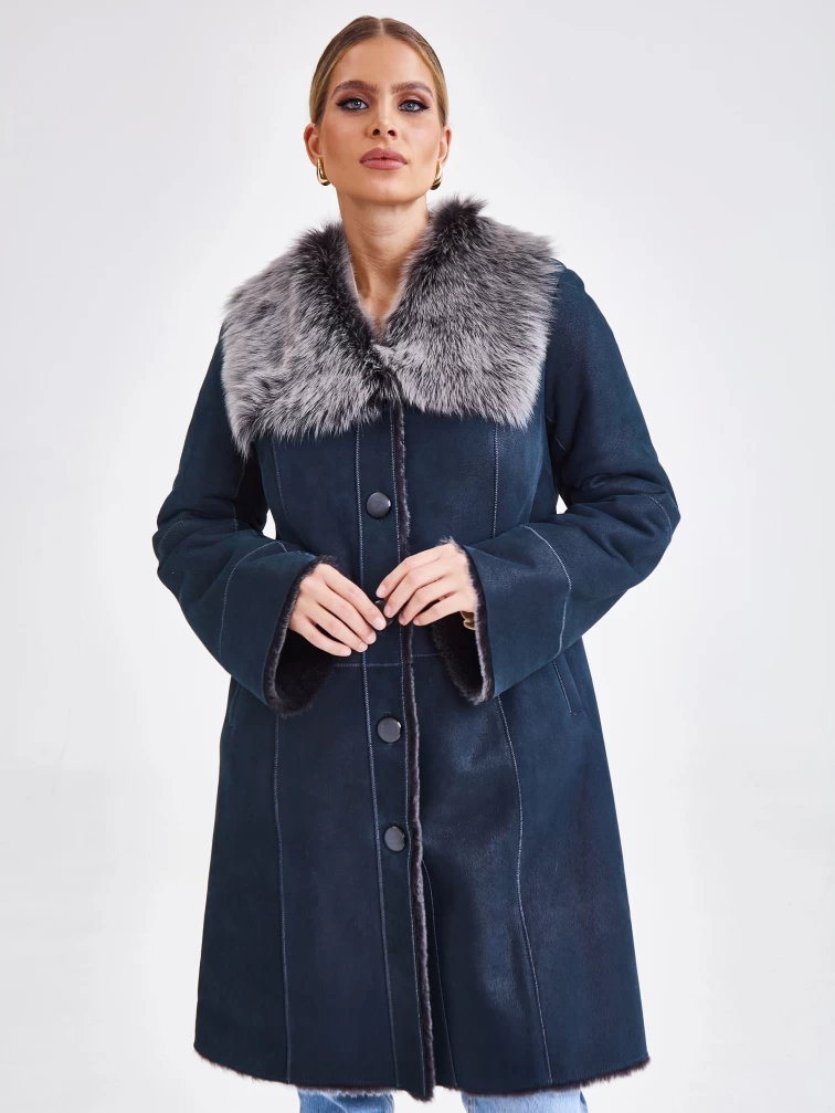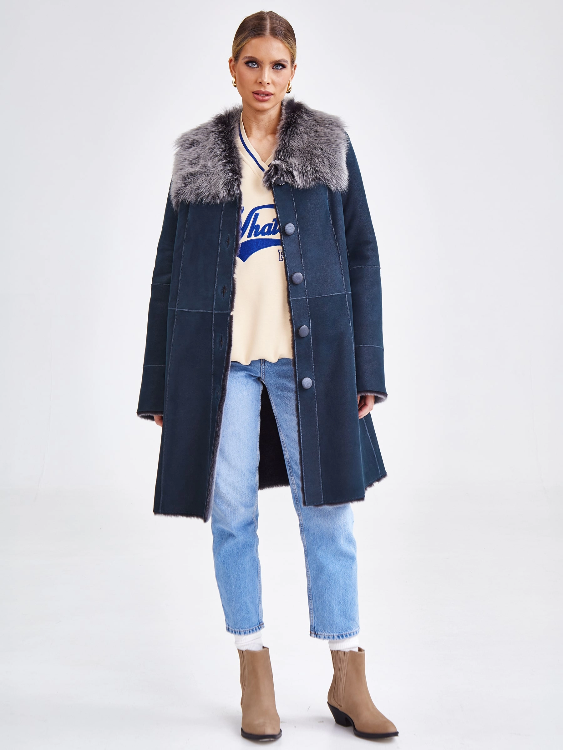 Товар дубленка женская с мехом тосканы 221, синяя, размер 46, артикул 62011 выполнен из овчина "мерино" с застежкой пуговицы. Рассчитан на сезон: осень-зима. Длина изделия 100 см, силуэт трапеция.