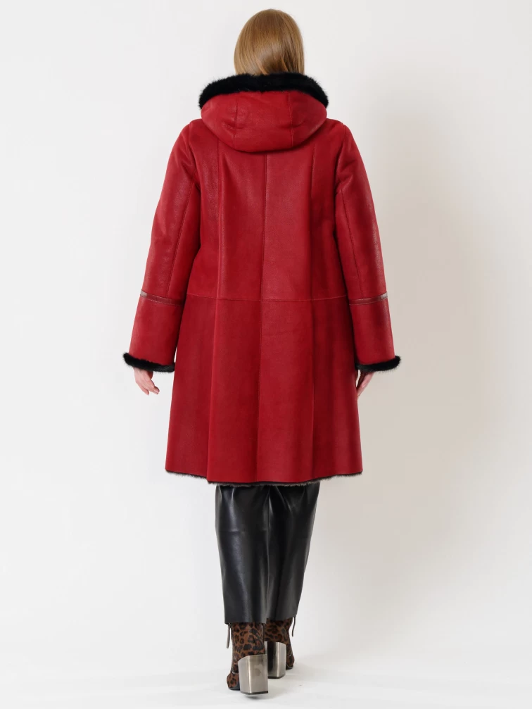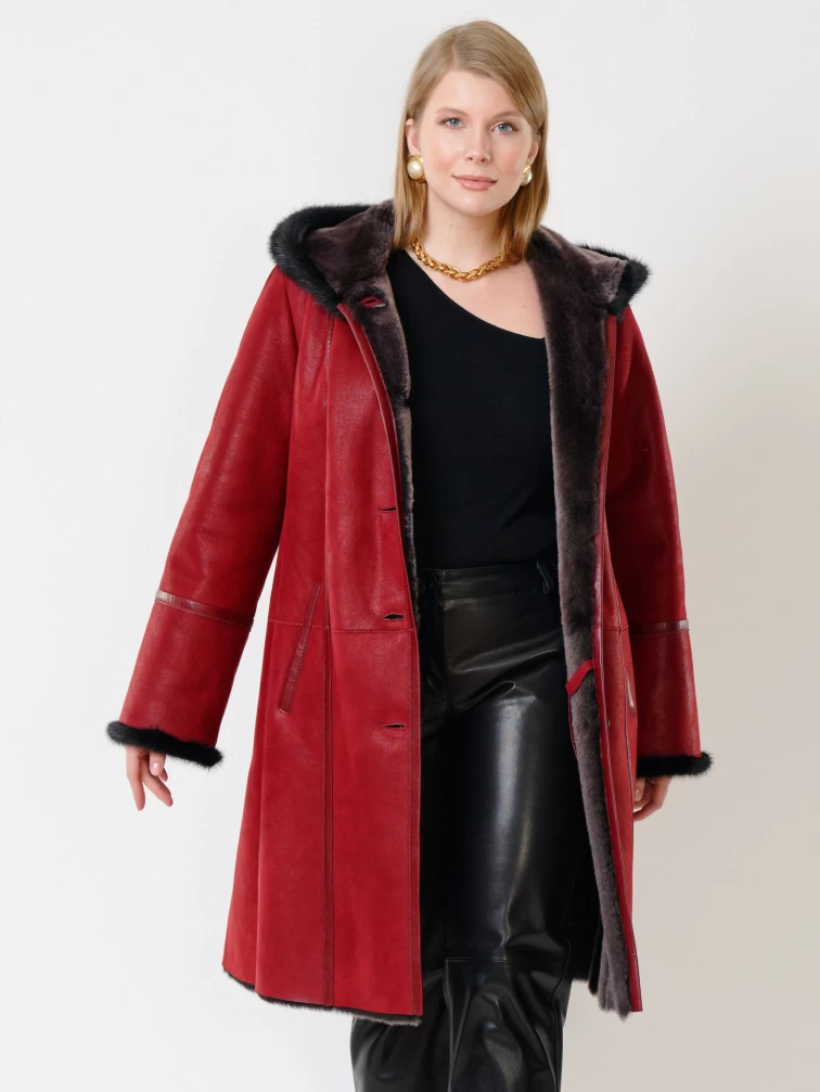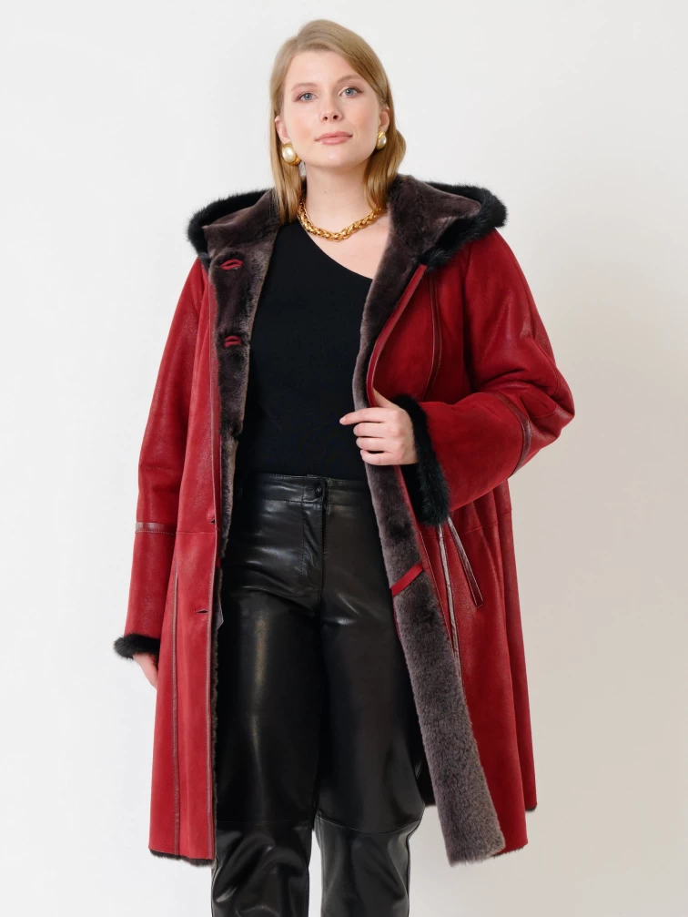 Женская дубленка с капюшоном и отделкой из меха норки 225у, красная, размер 50, артикул 14850