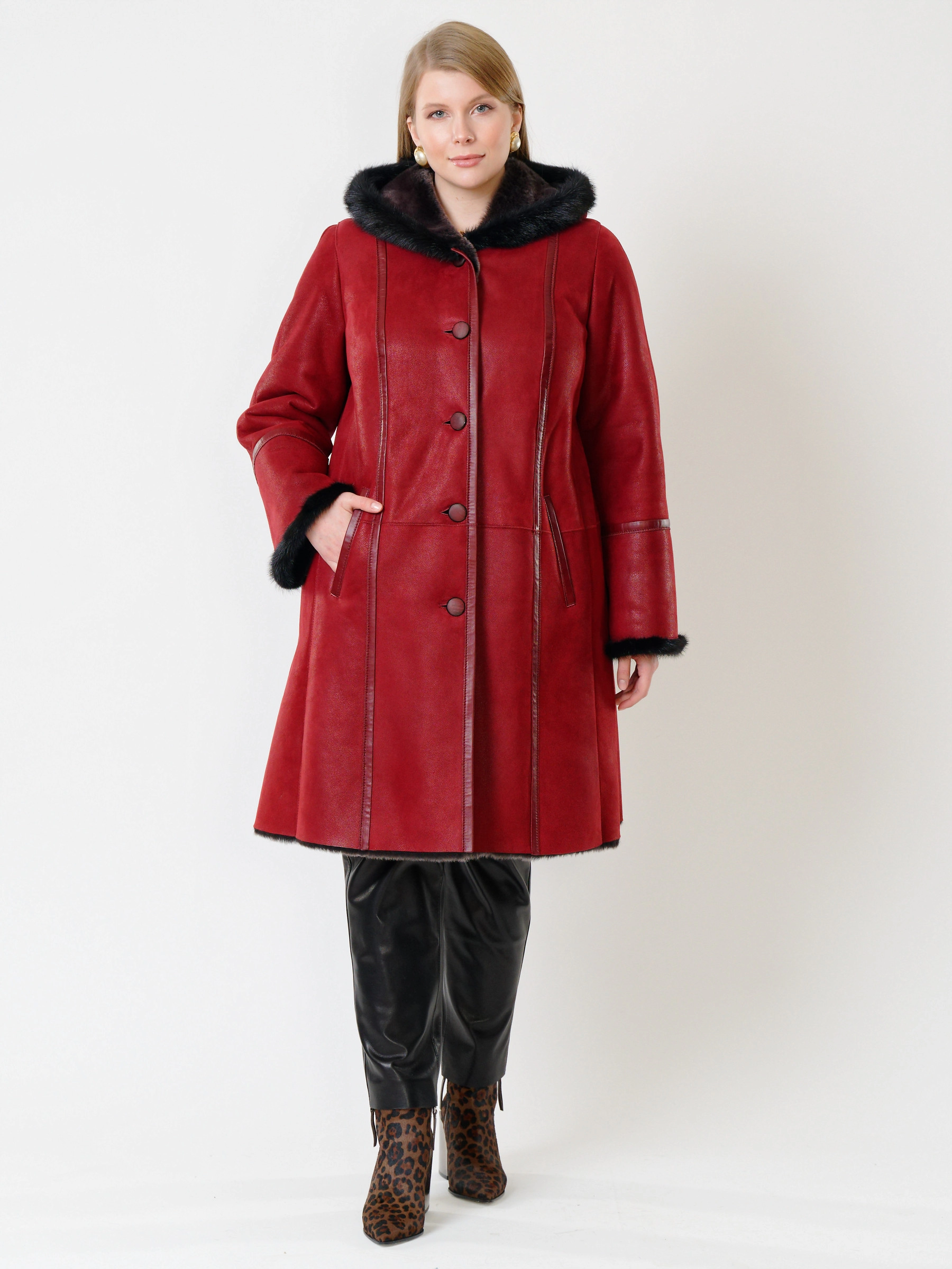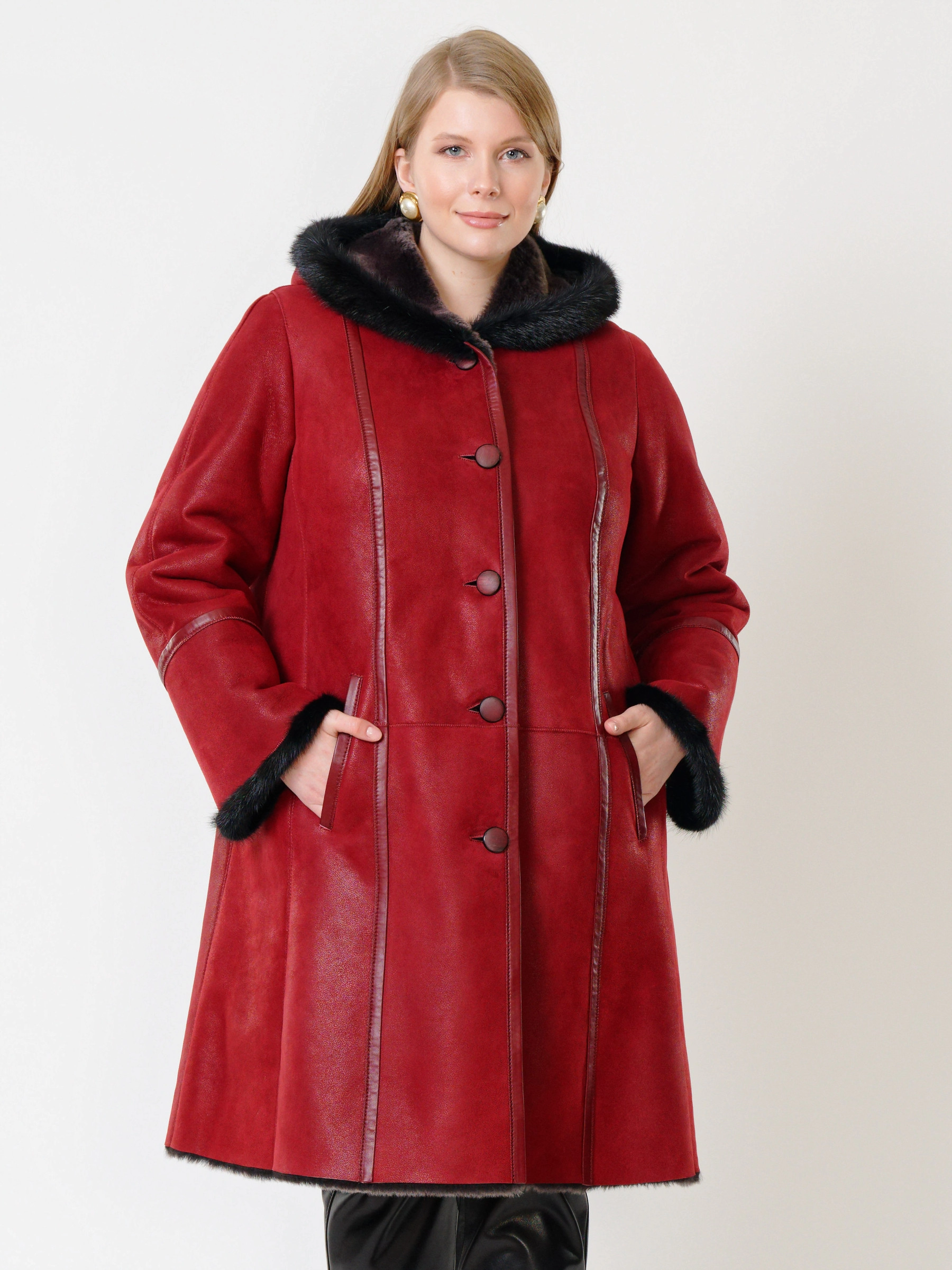 Элегантная дублёнка-трапеция на пуговицах из натуральной овчины «мерино» длиной 100 см с глубоким капюшоном с роскошной опушкой из меха норки и двумя врезными карманами создаёт утончённый тёплый образ — сочетайте её с юбкой-карандаш и высокими сапогами для безупречной элегантности.