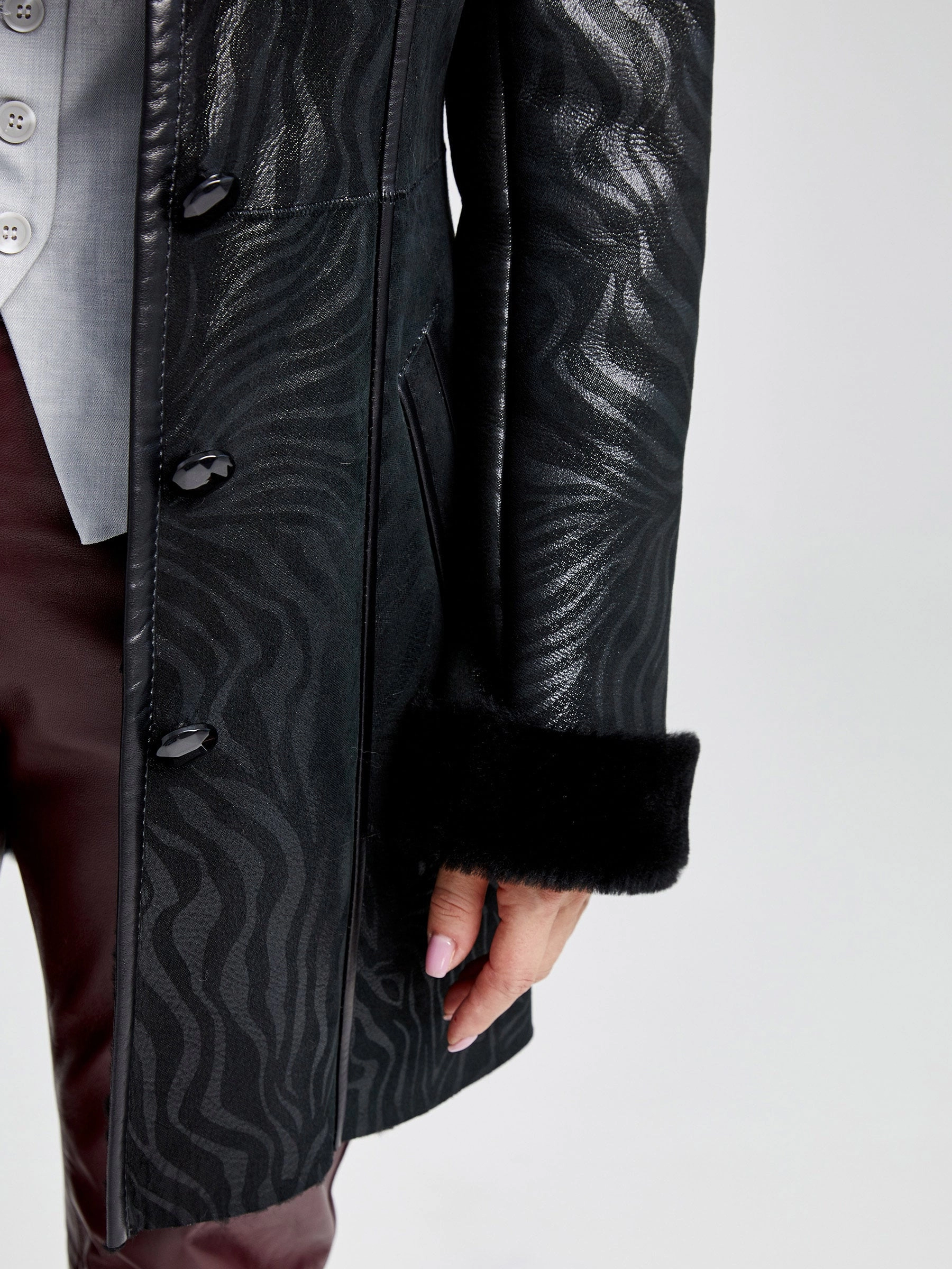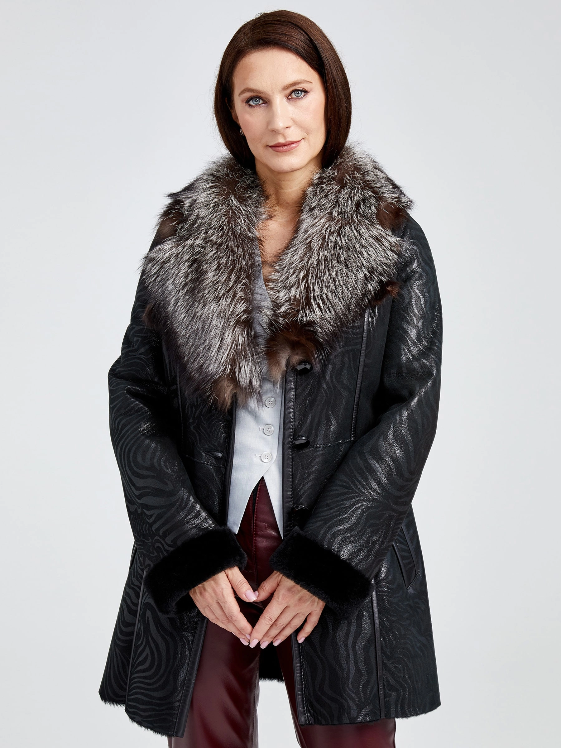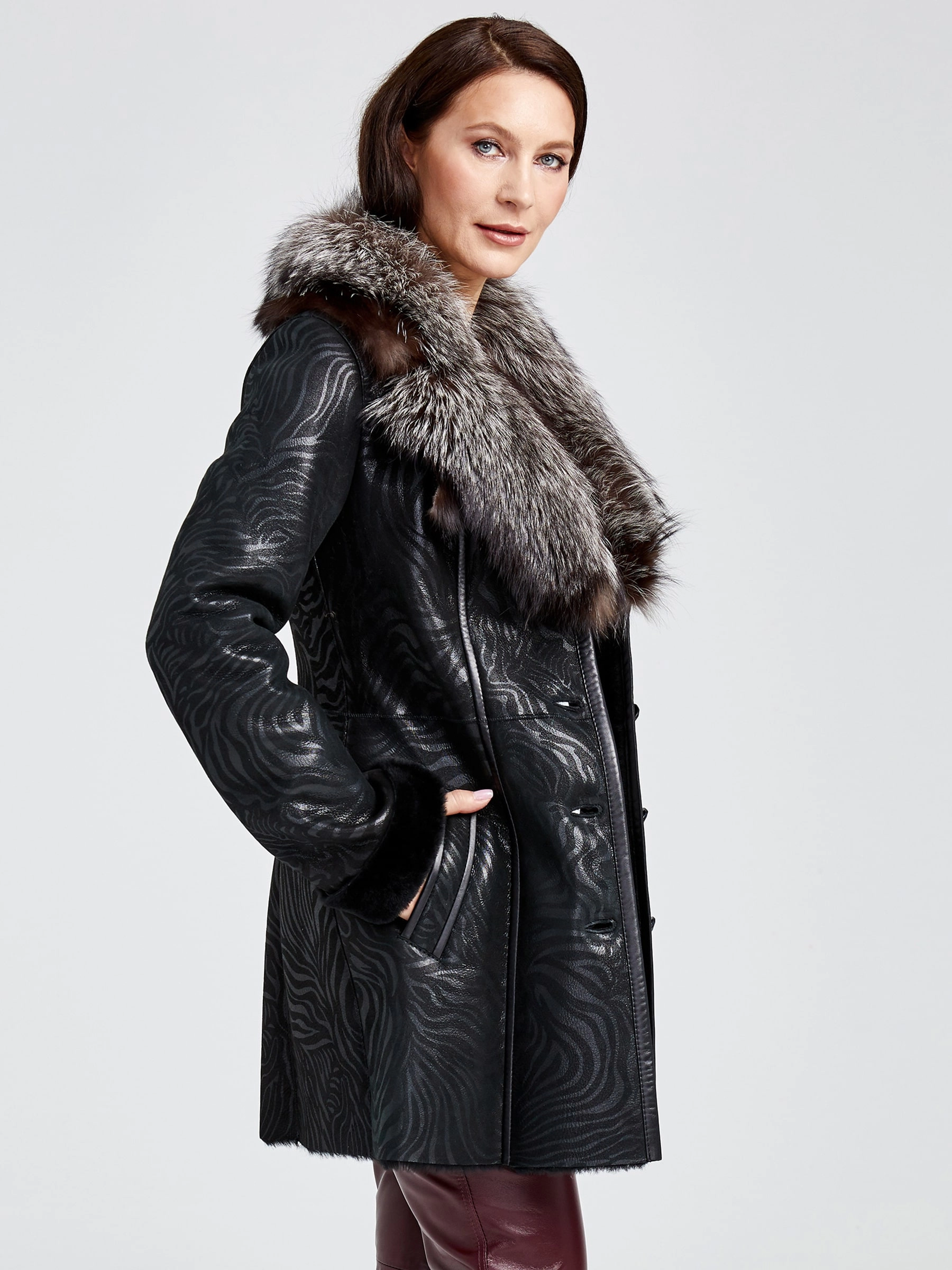 Товар дубленка женская с воротником из меха чернобурой лисицы 255, черная, размер 42, артикул 62390 выполнен из овчина "мерино" с застежкой пуговицы. Рассчитан на сезон: осень-зима. Длина изделия 80 см, силуэт полуприлегающий.