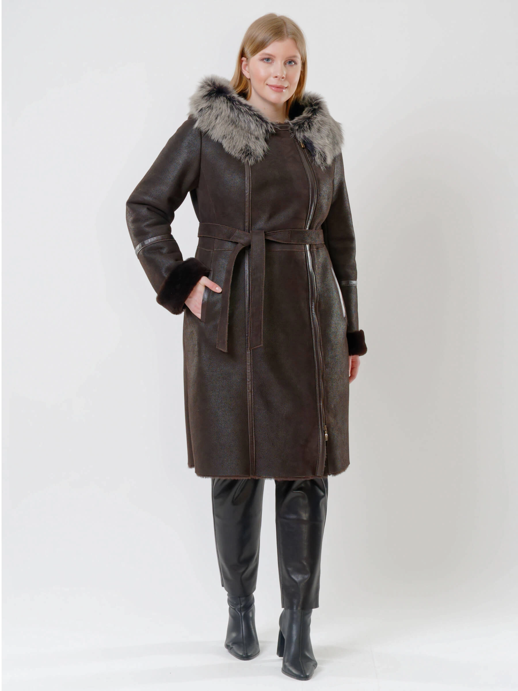 Женская дубленка с капюшоном из тосканы на молнии 265, коричневая, размер 42, артикул 61551