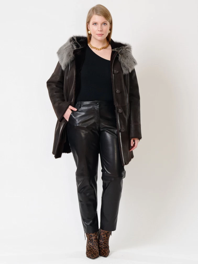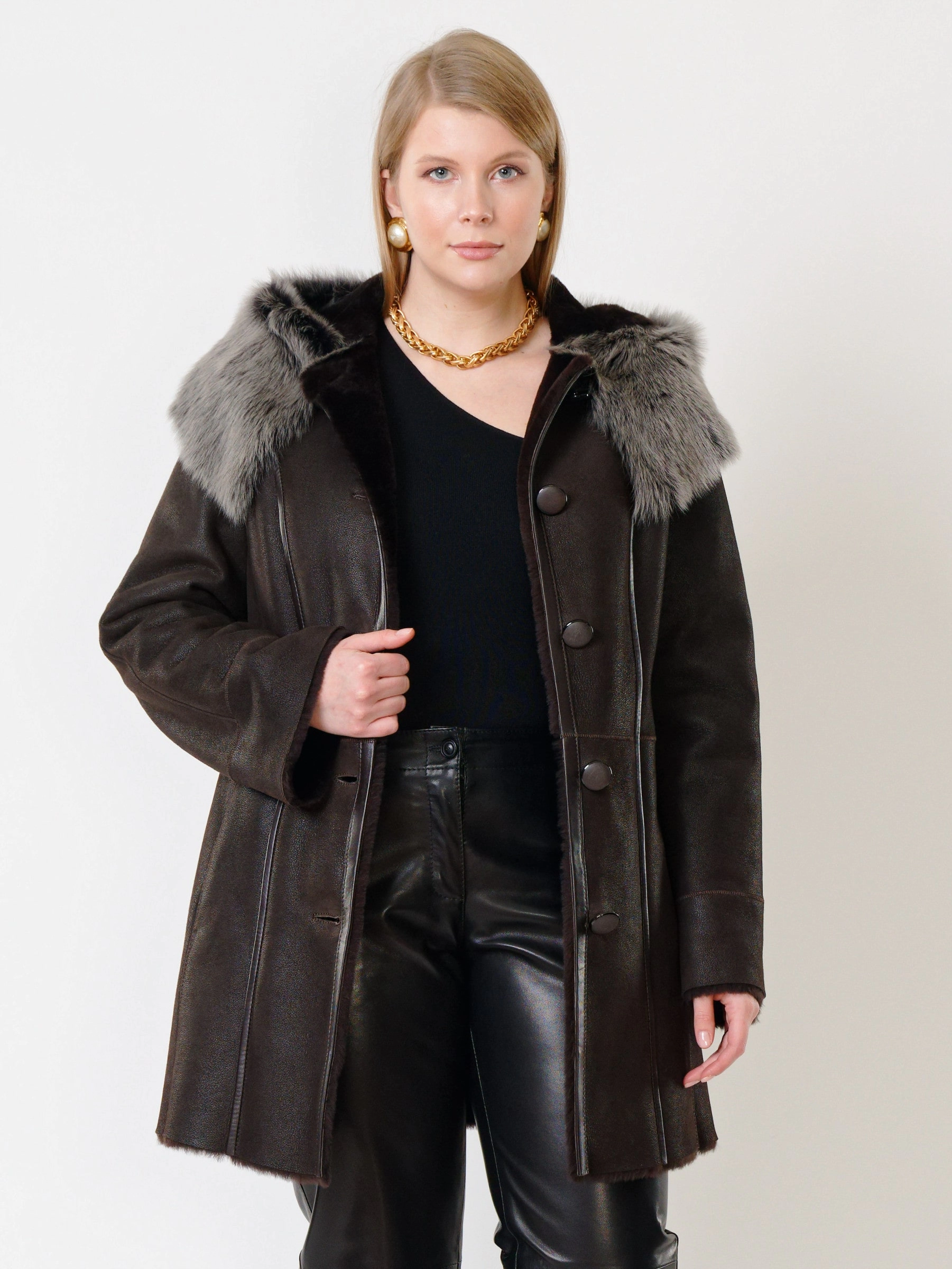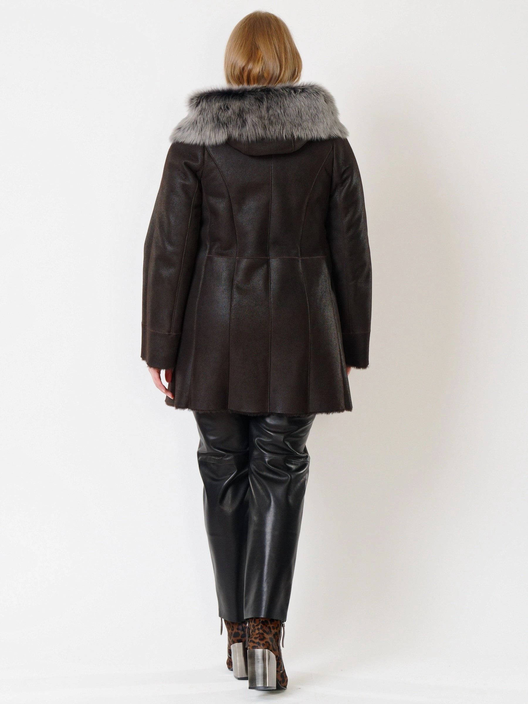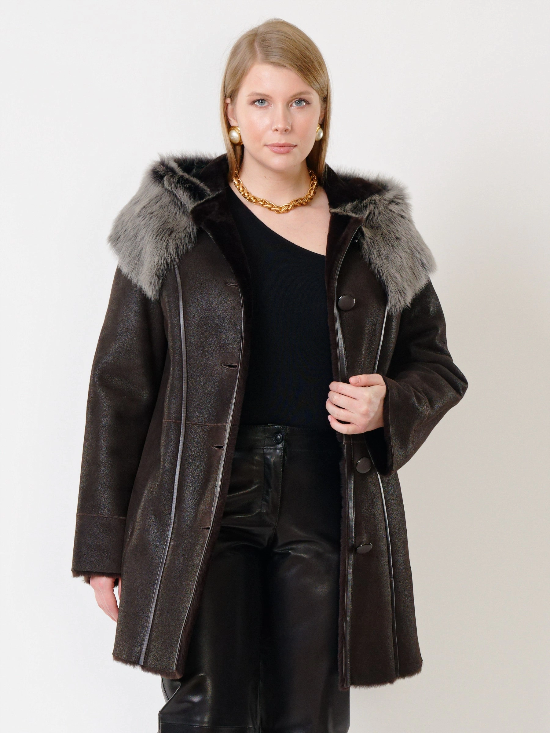 Женская дубленка с капюшоном из тосканы 270, коричневая, размер 66, артикул 14720