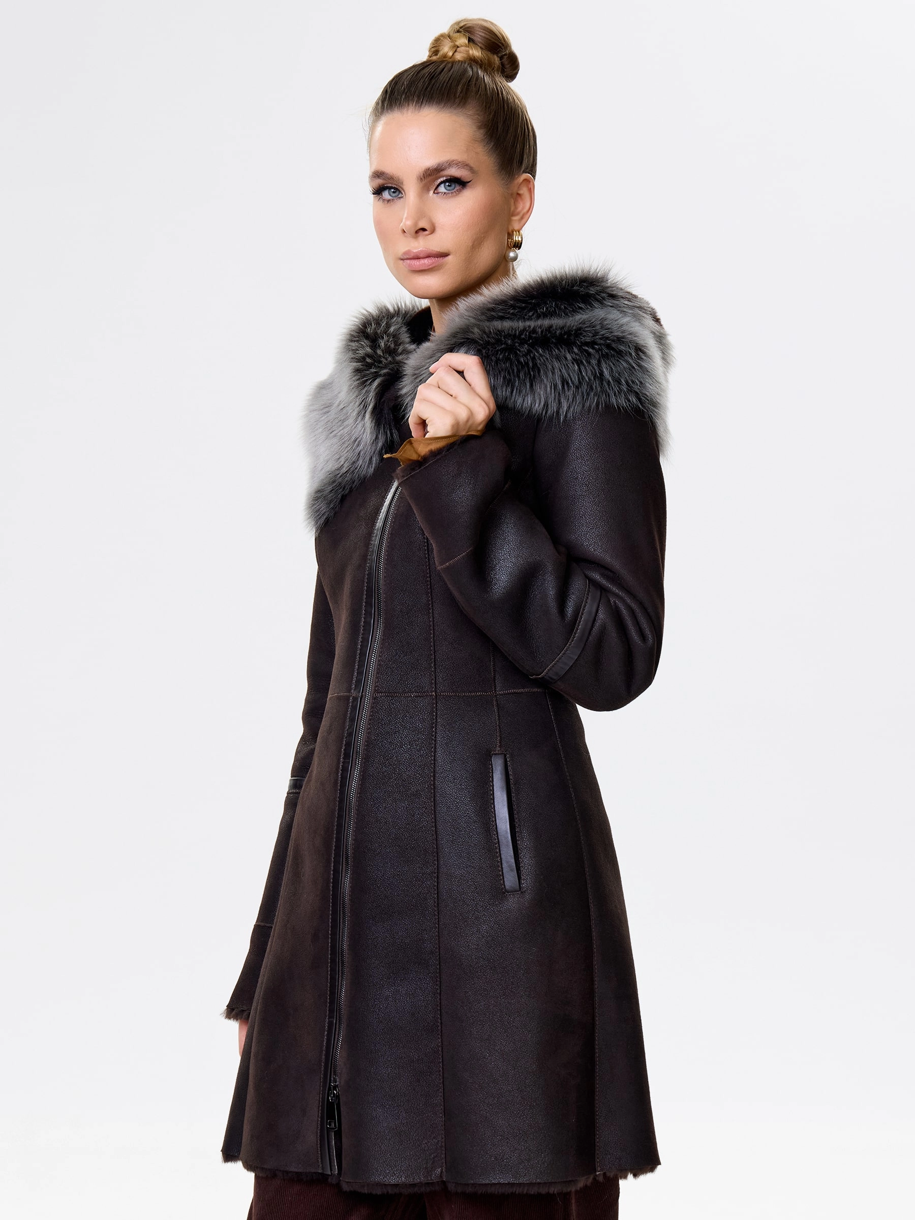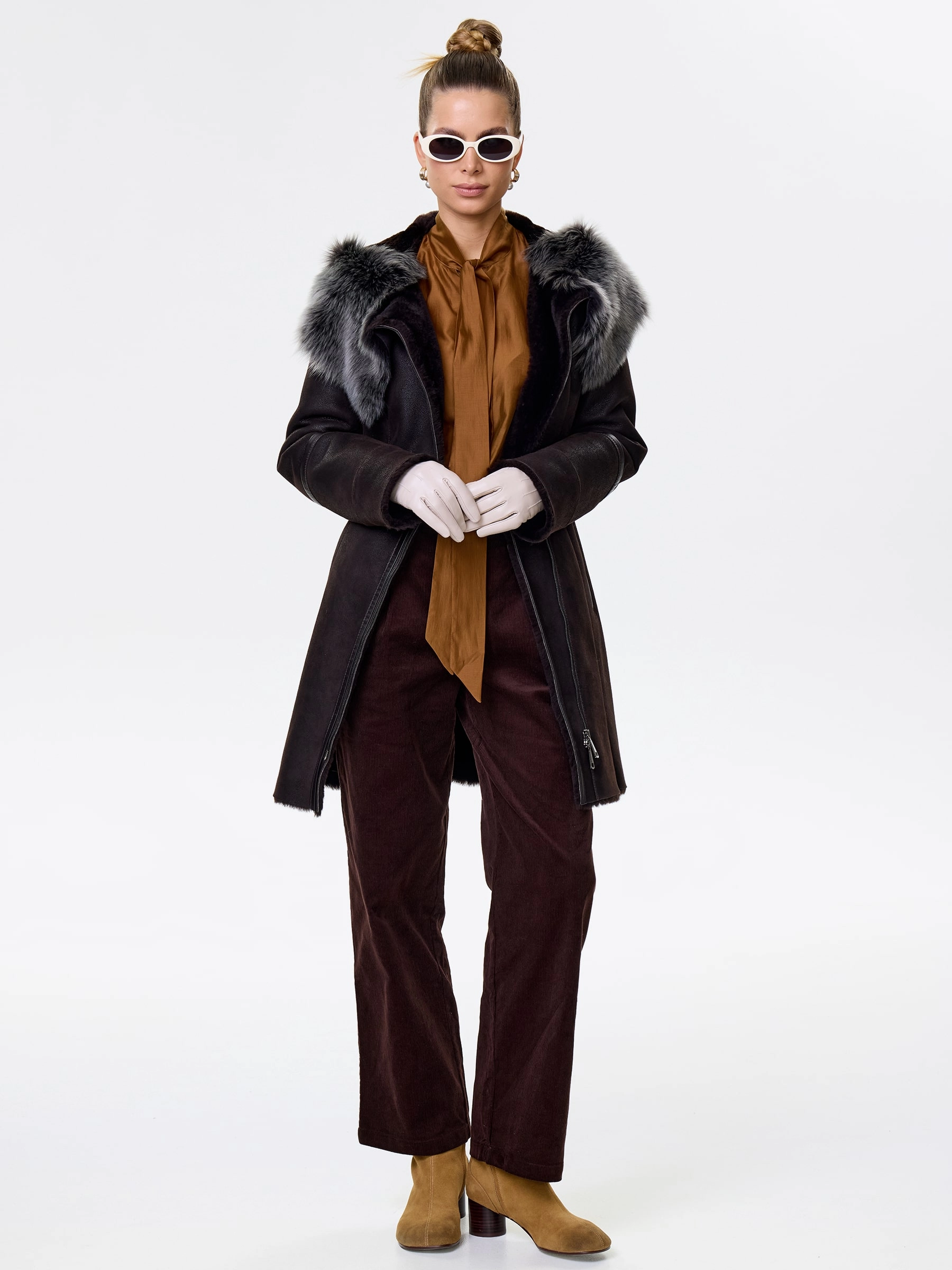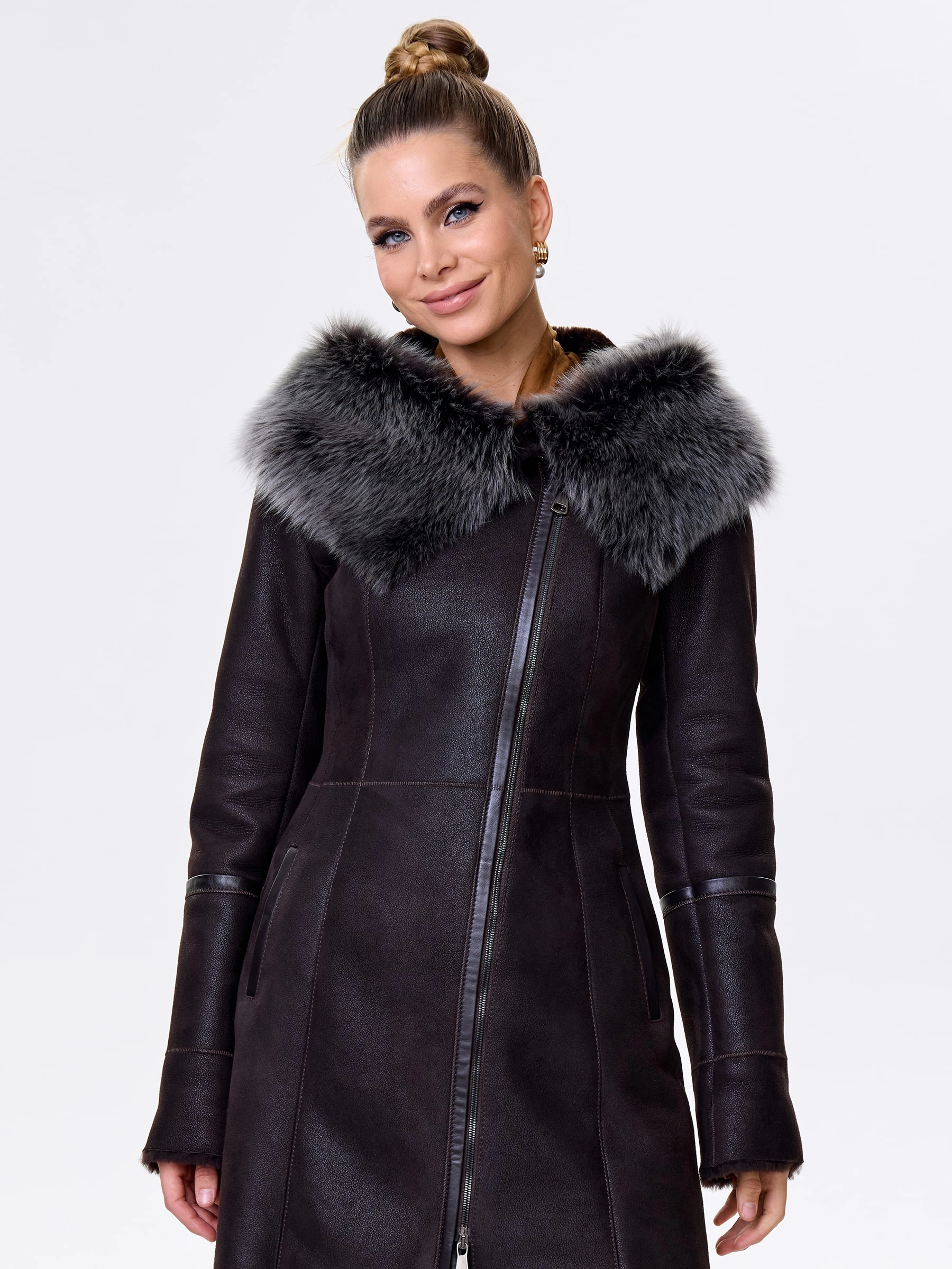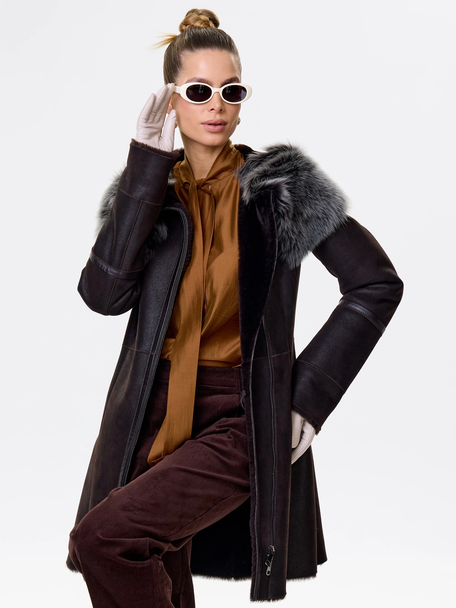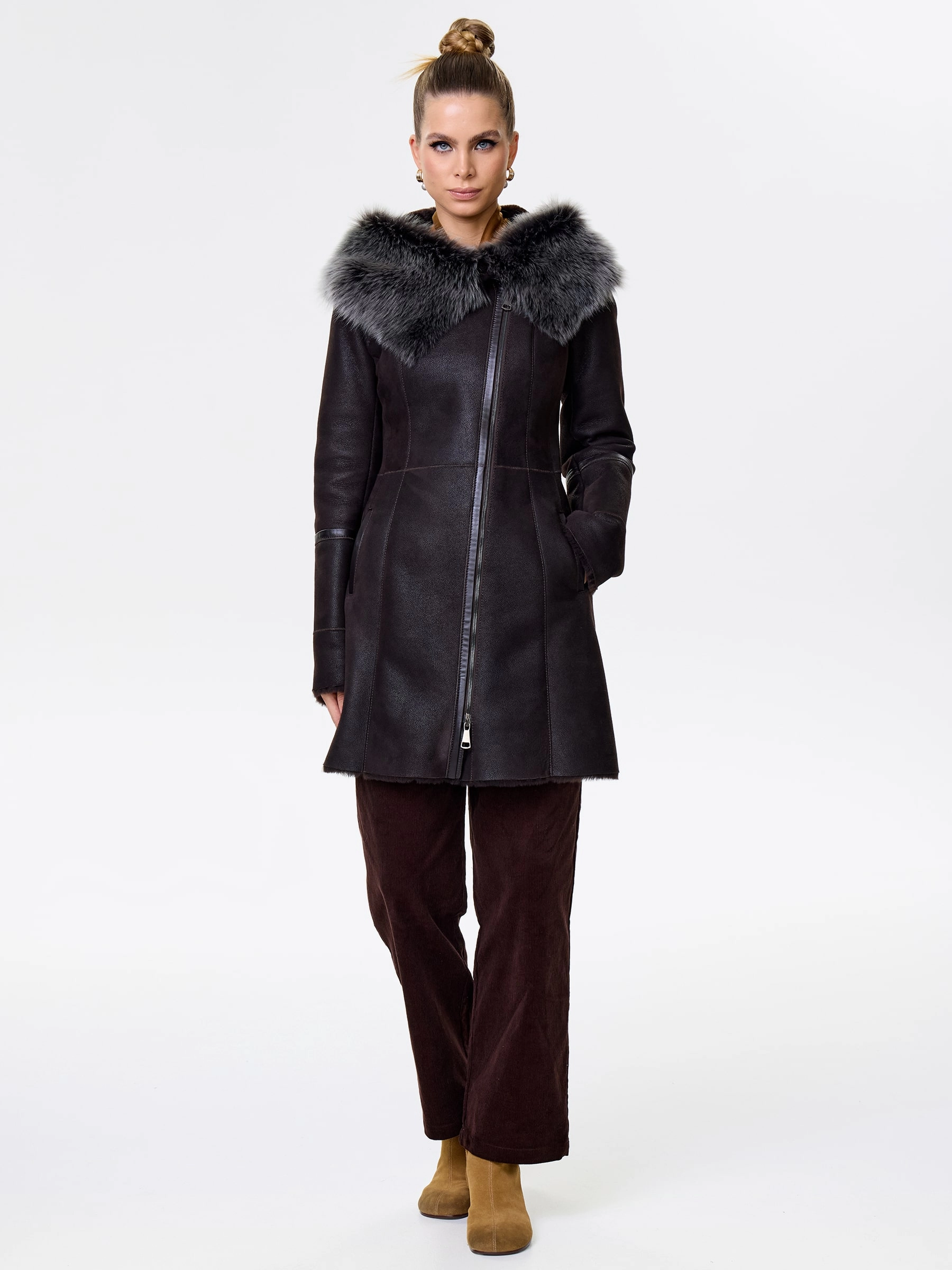 Элегантная длинная женская дубленка-косуха на молнии из натуральной овчины «мерино» длиной 90 см. Модель с несъемным капюшоном и манжетами, отделанными роскошной тосканской овчиной. Она обладает практичным полуприлегающим силуэтом и втачными рукавами. Этот повседневный must-have согреет в холода и дополнит как образ с джинсами и кедами, так и утонченные ансамбли с кожаными брюками или юбками. Он обеспечивает непрерывный комфорт и стиль.
